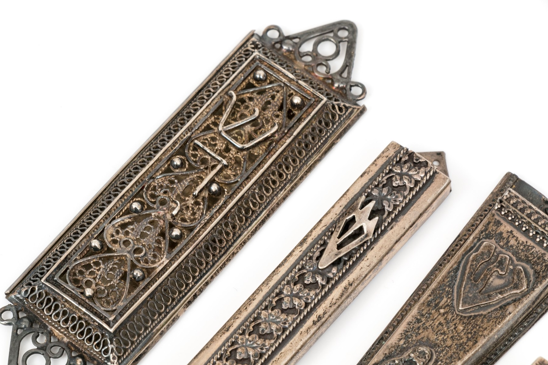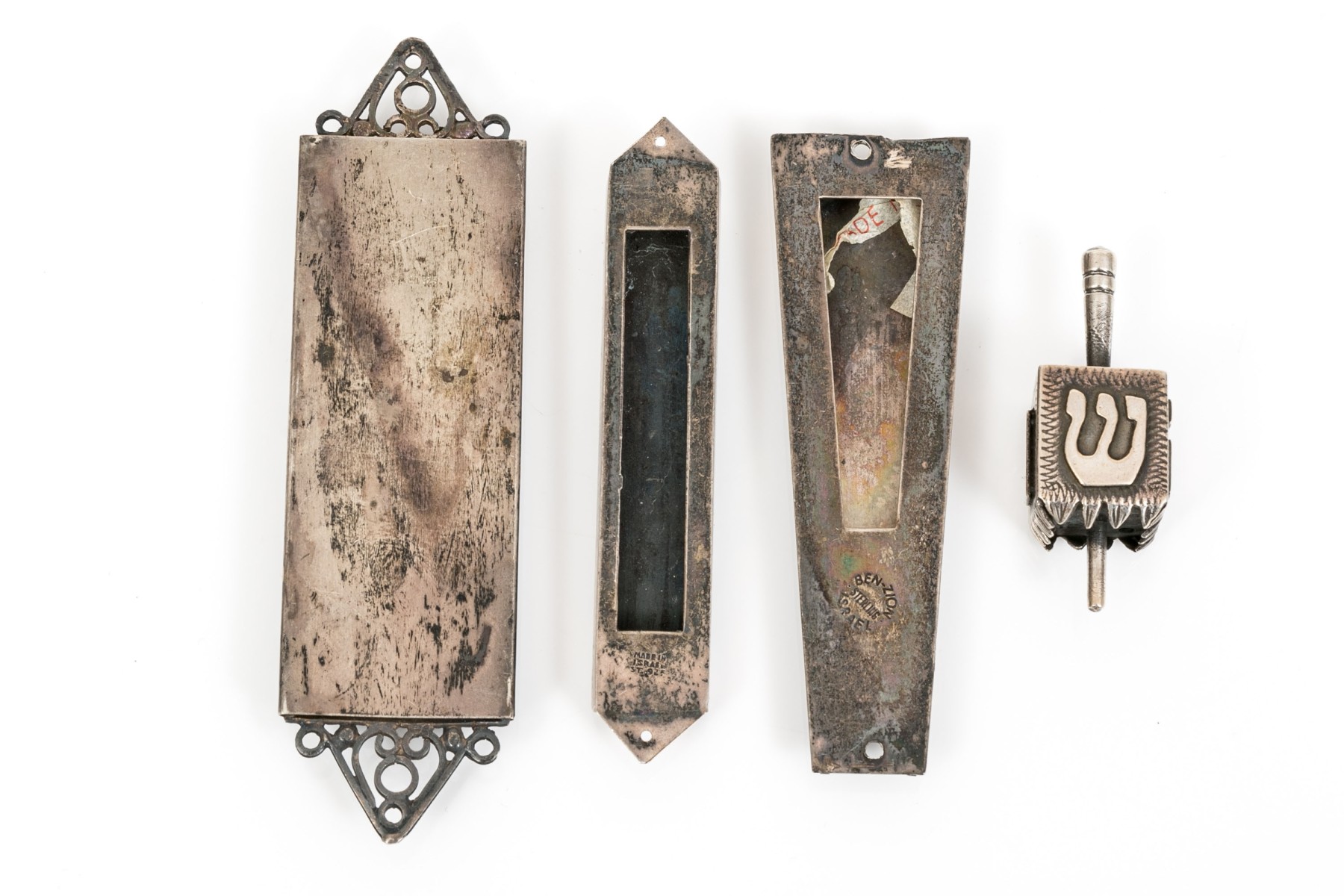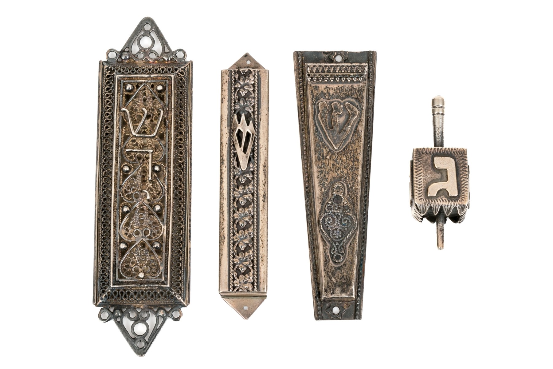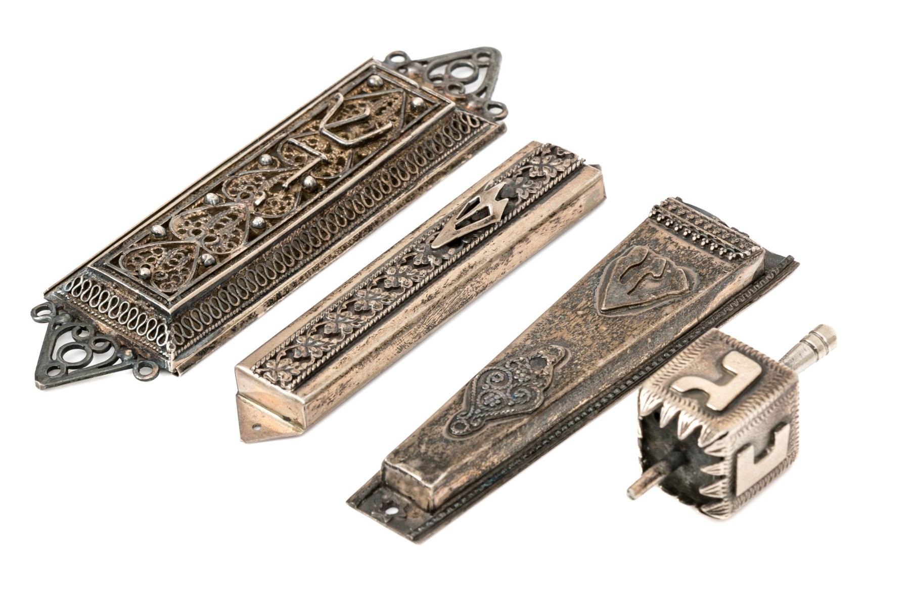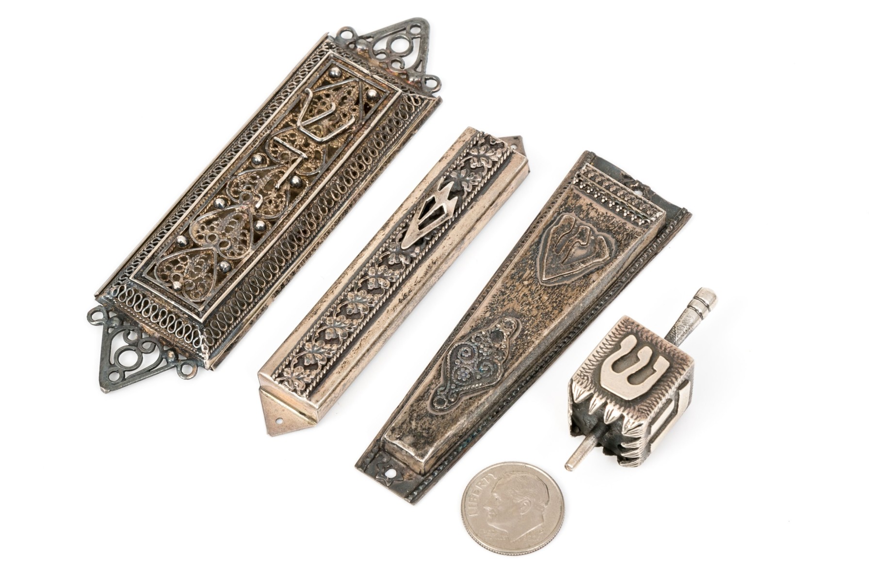 Lot of four Judaica pieces, including two sterling mezuzahs, one 800 silver mezuzah, and a dreidal
