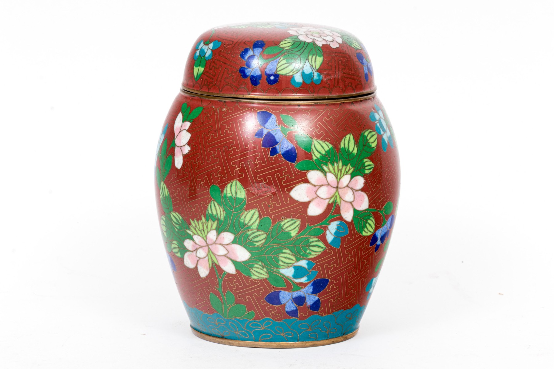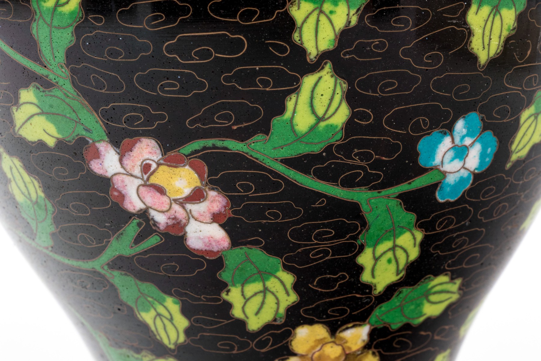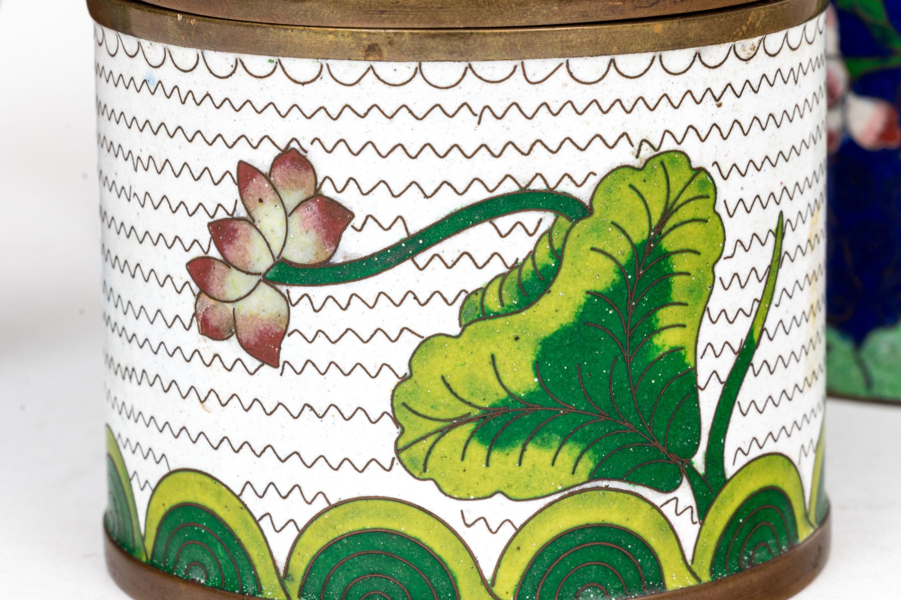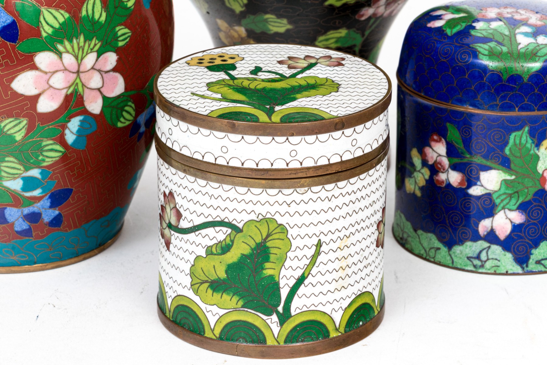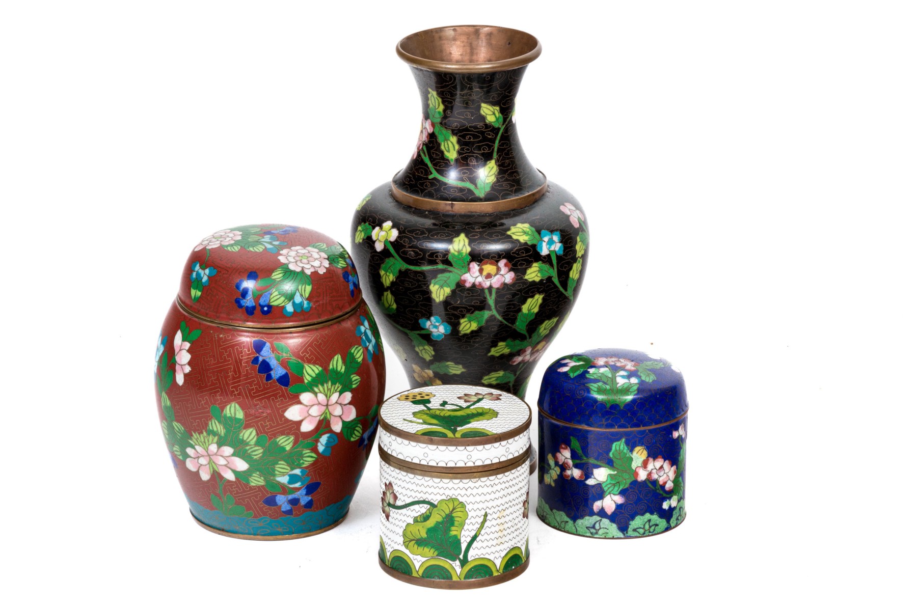 Lot of four striking vintage Chinese cloisonne pieces, including a ginger jar, two covered jar and a vase; in white, blue black and rust tones