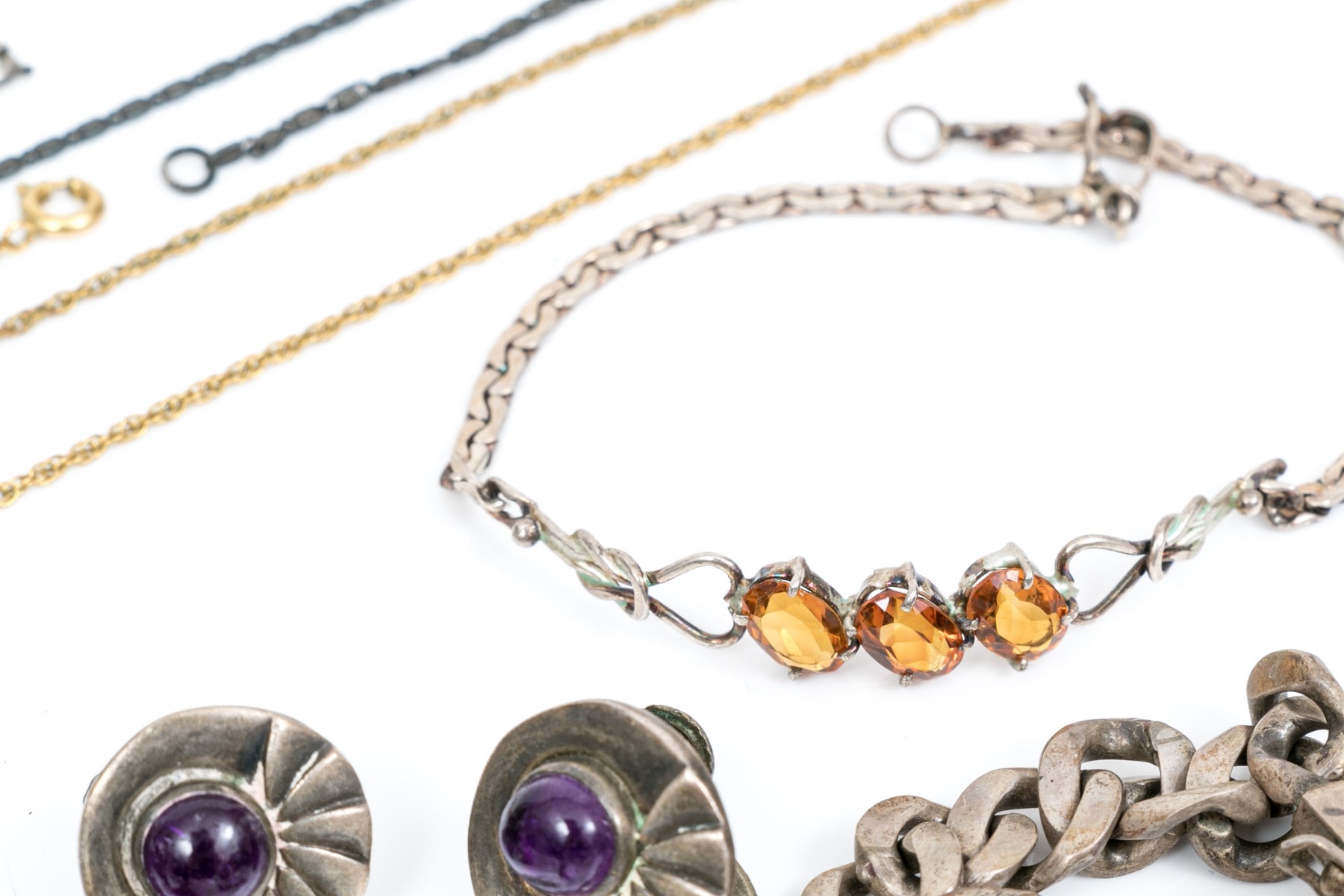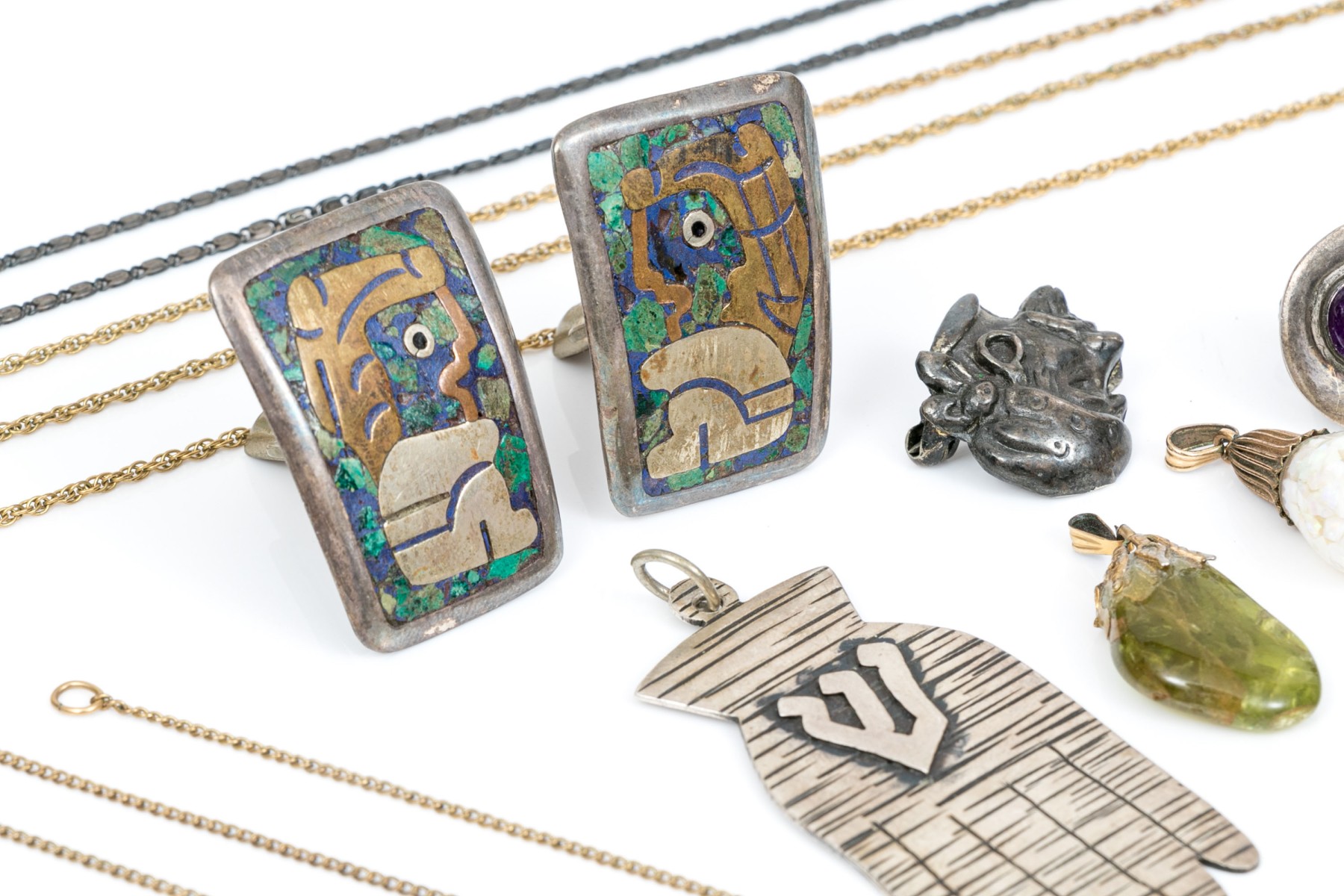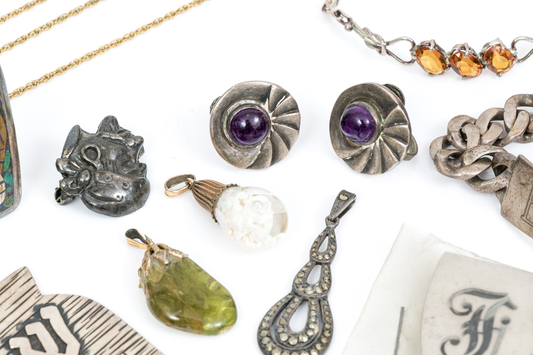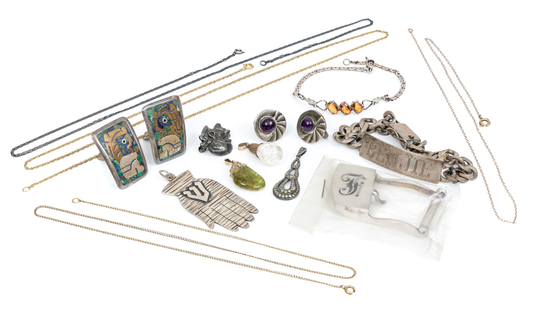 Three gold filled chain necklaces and two gold filled pendants. 800 silver pendant. Sterling silver chain necklace, two bracelets, pendant, cufflinks, clip earrings, pin and belt buckle.