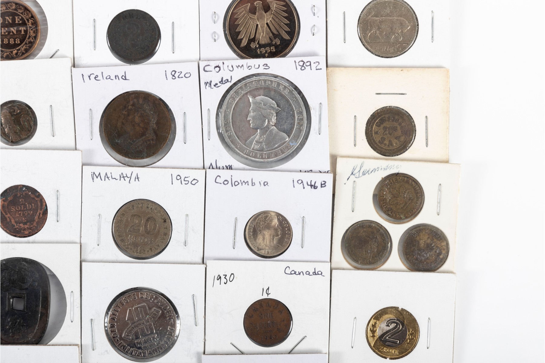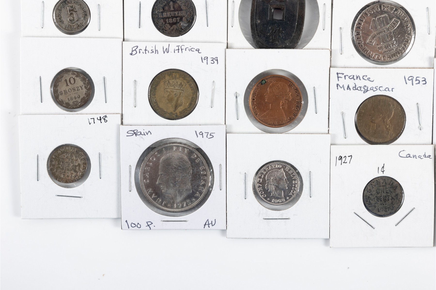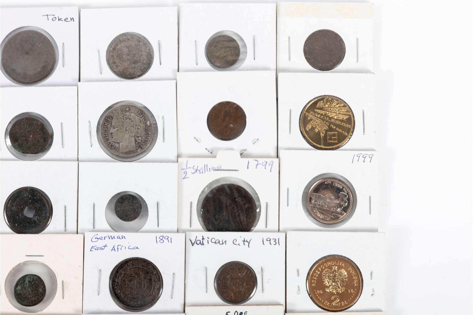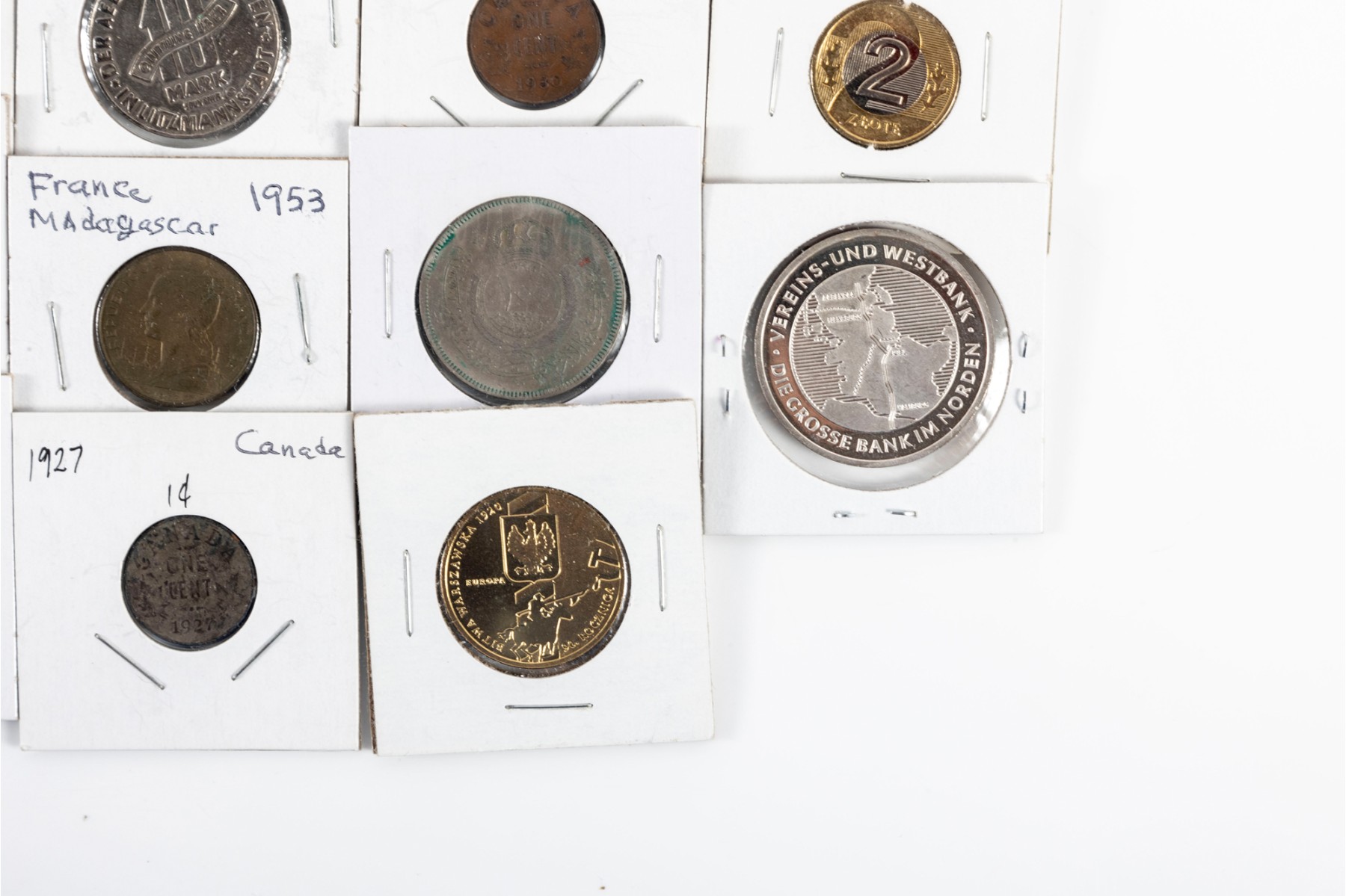 A collection varied coins. Mixed countries and denominations -- contents as shown and sold as is, see photos for details. All coins are contained within display sleeves.