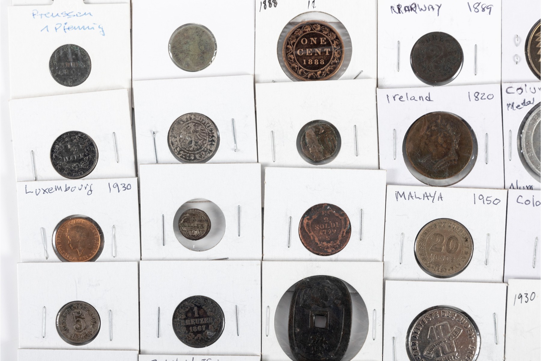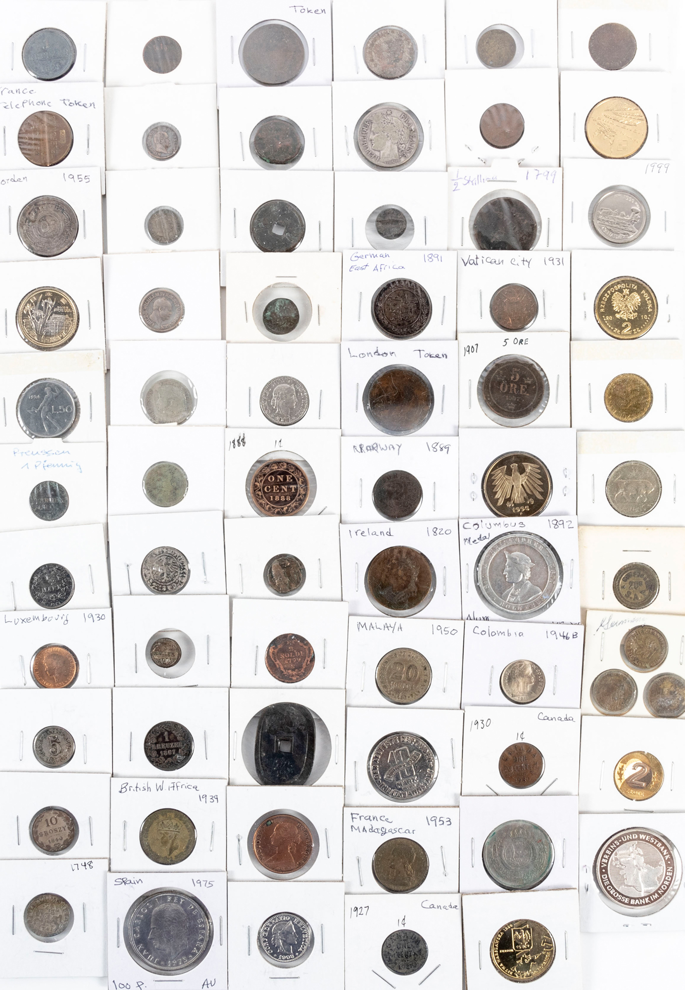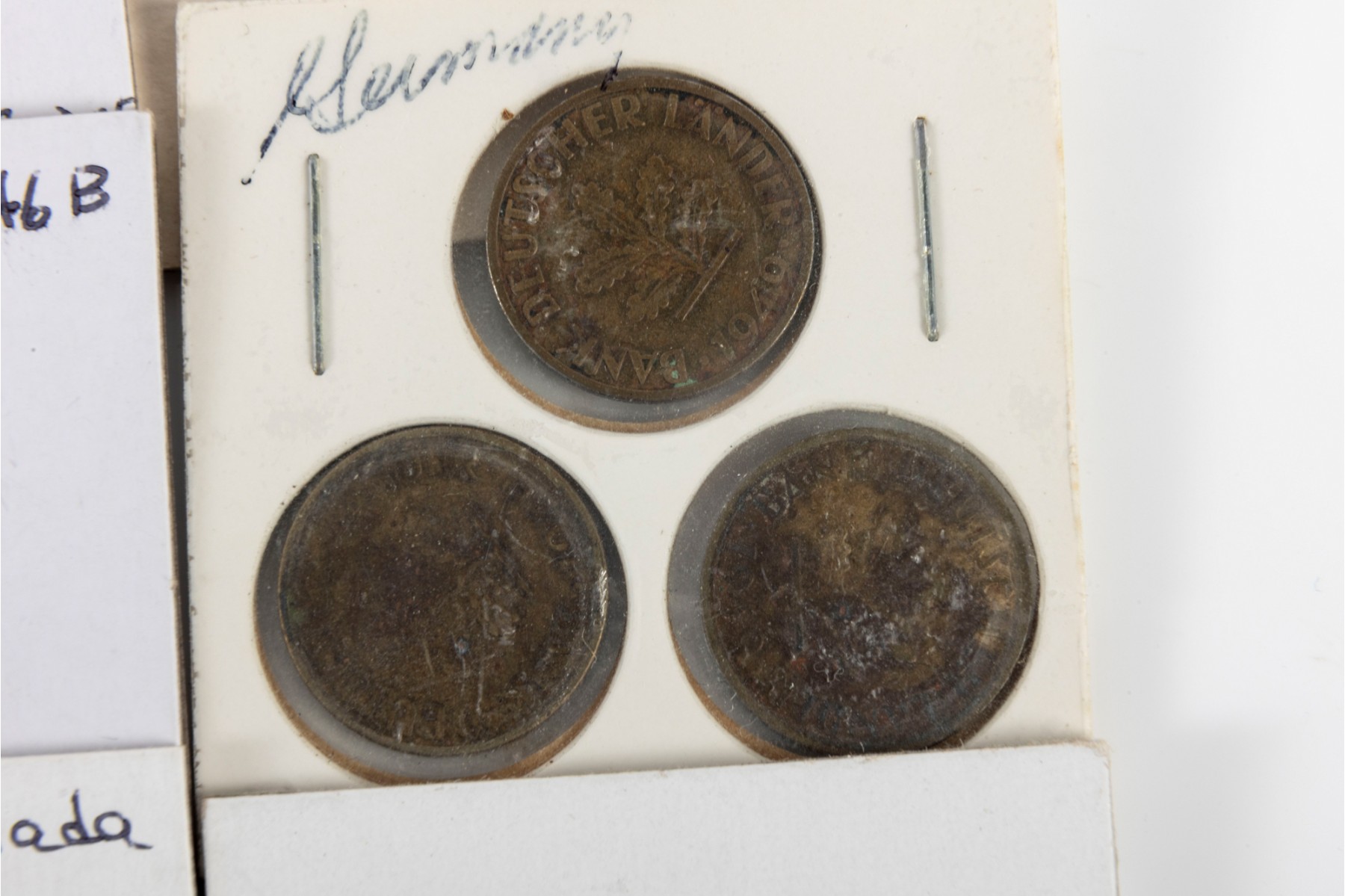 A collection varied coins. Mixed countries and denominations -- contents as shown and sold as is, see photos for details. All coins are contained within display sleeves.