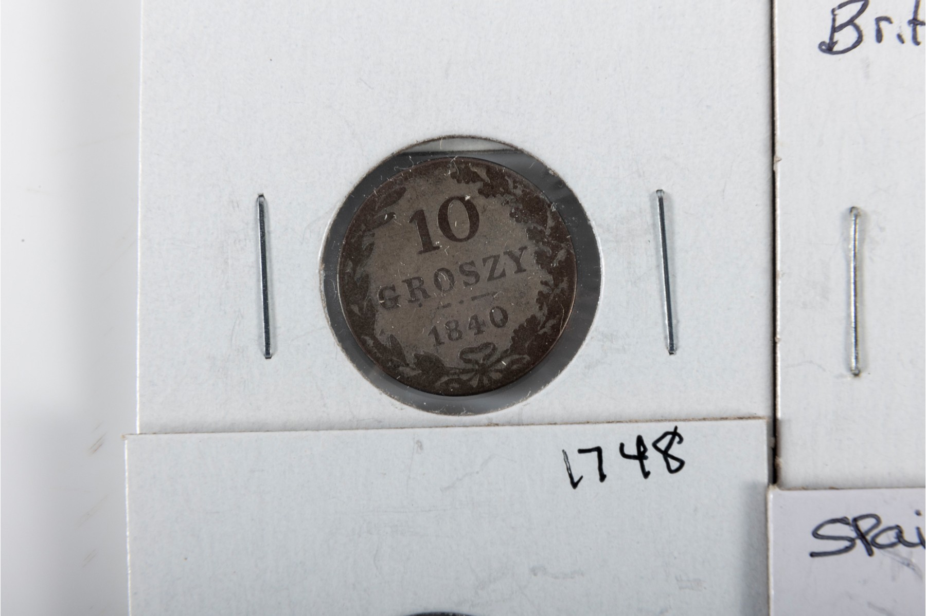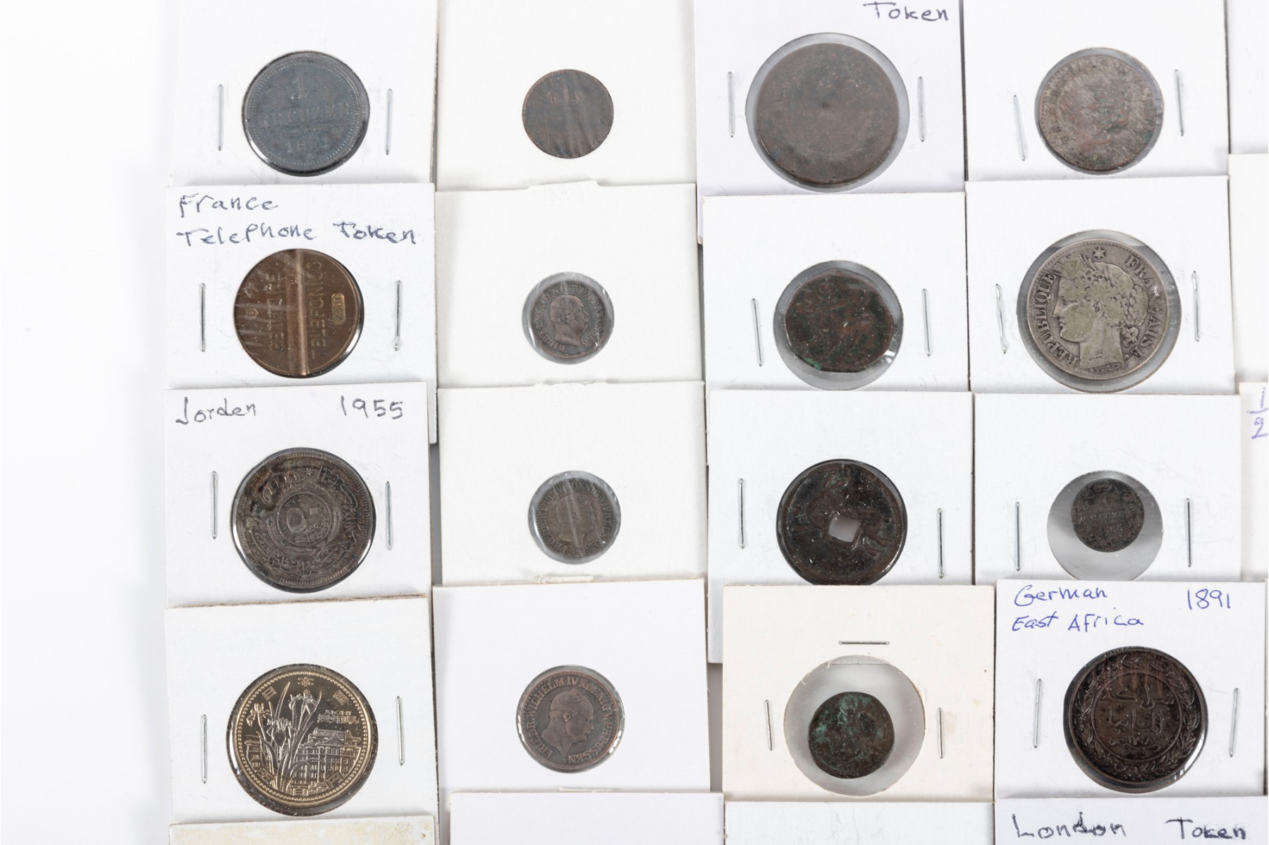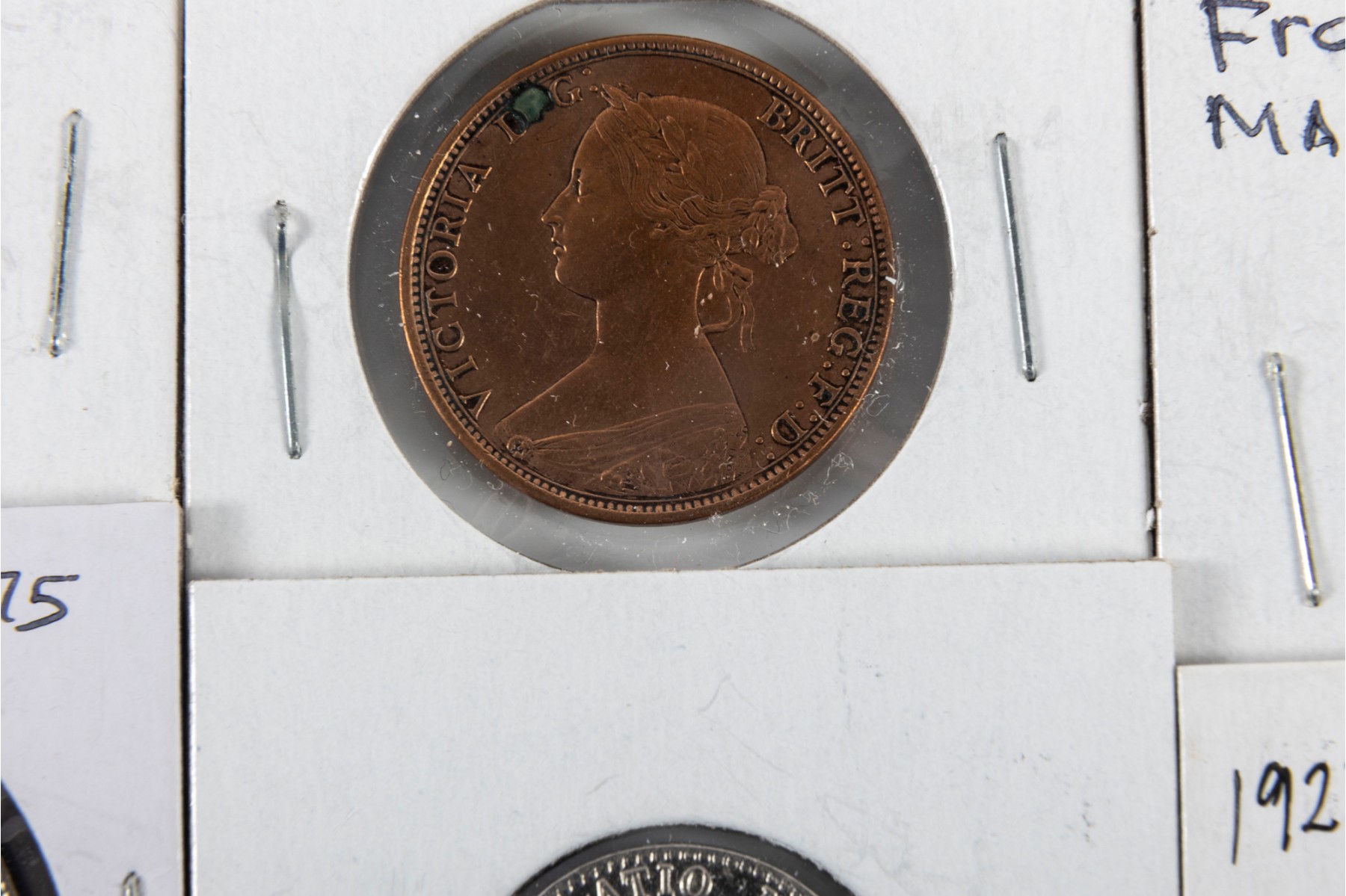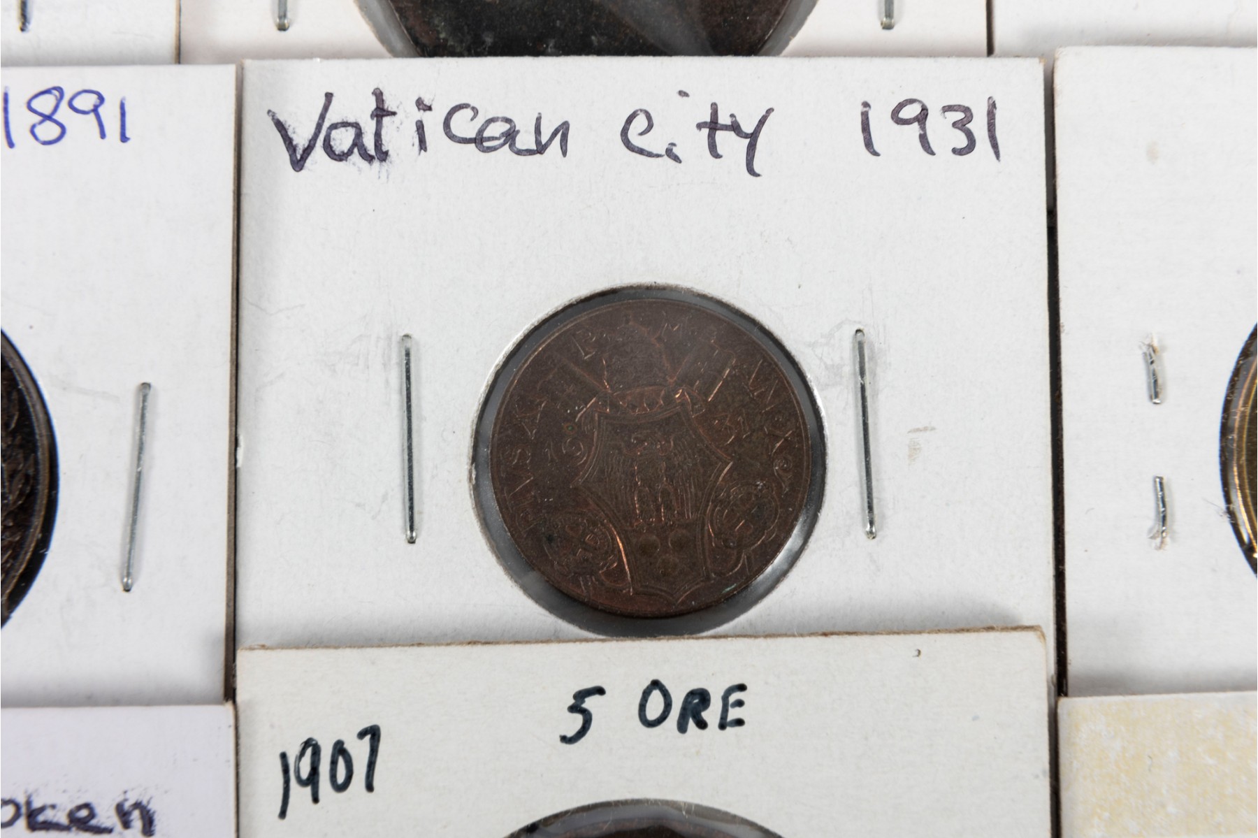 A collection varied coins. Mixed countries and denominations -- contents as shown and sold as is, see photos for details. All coins are contained within display sleeves.