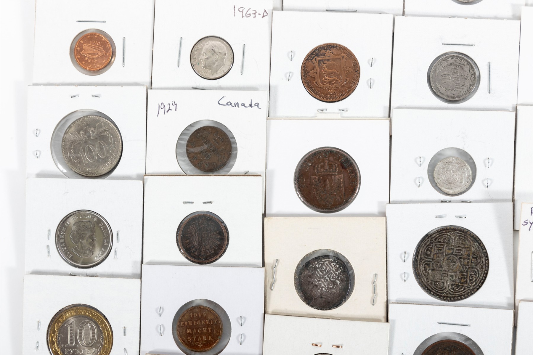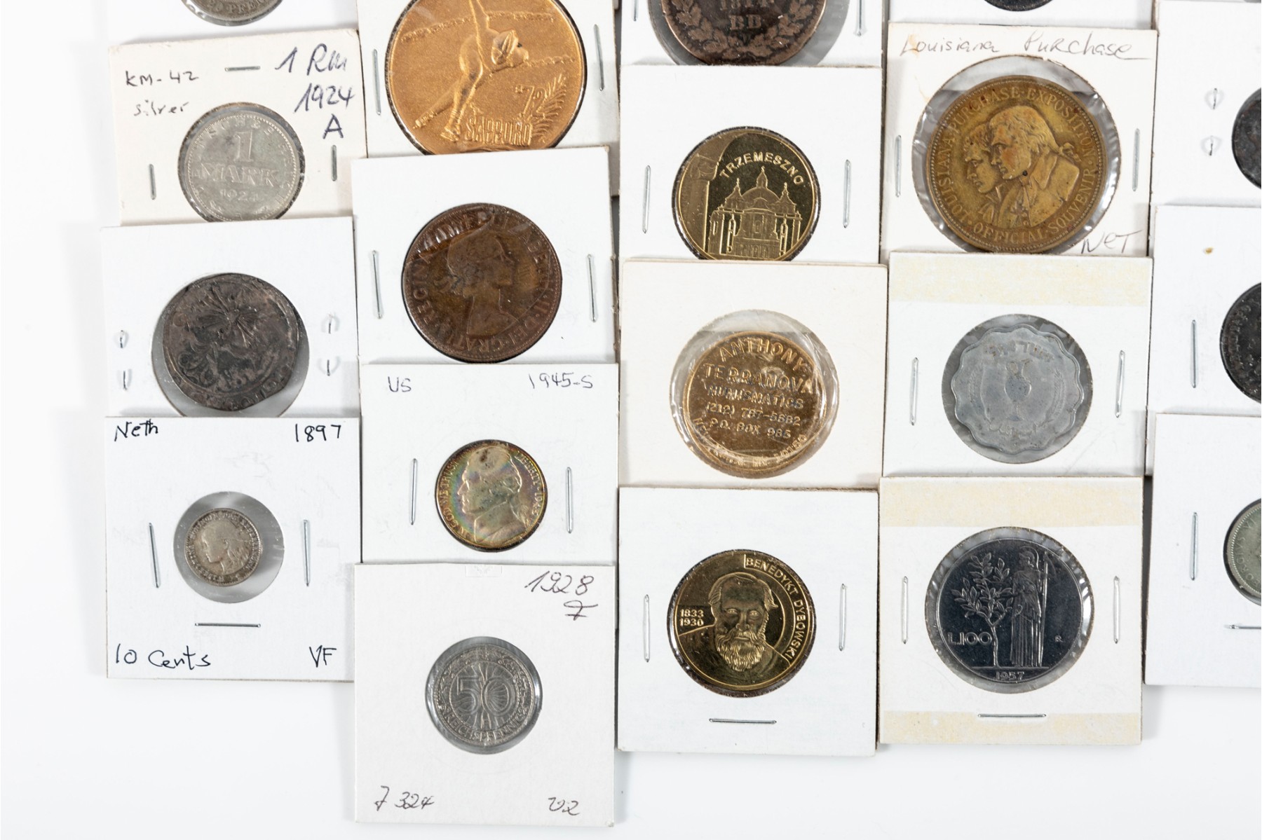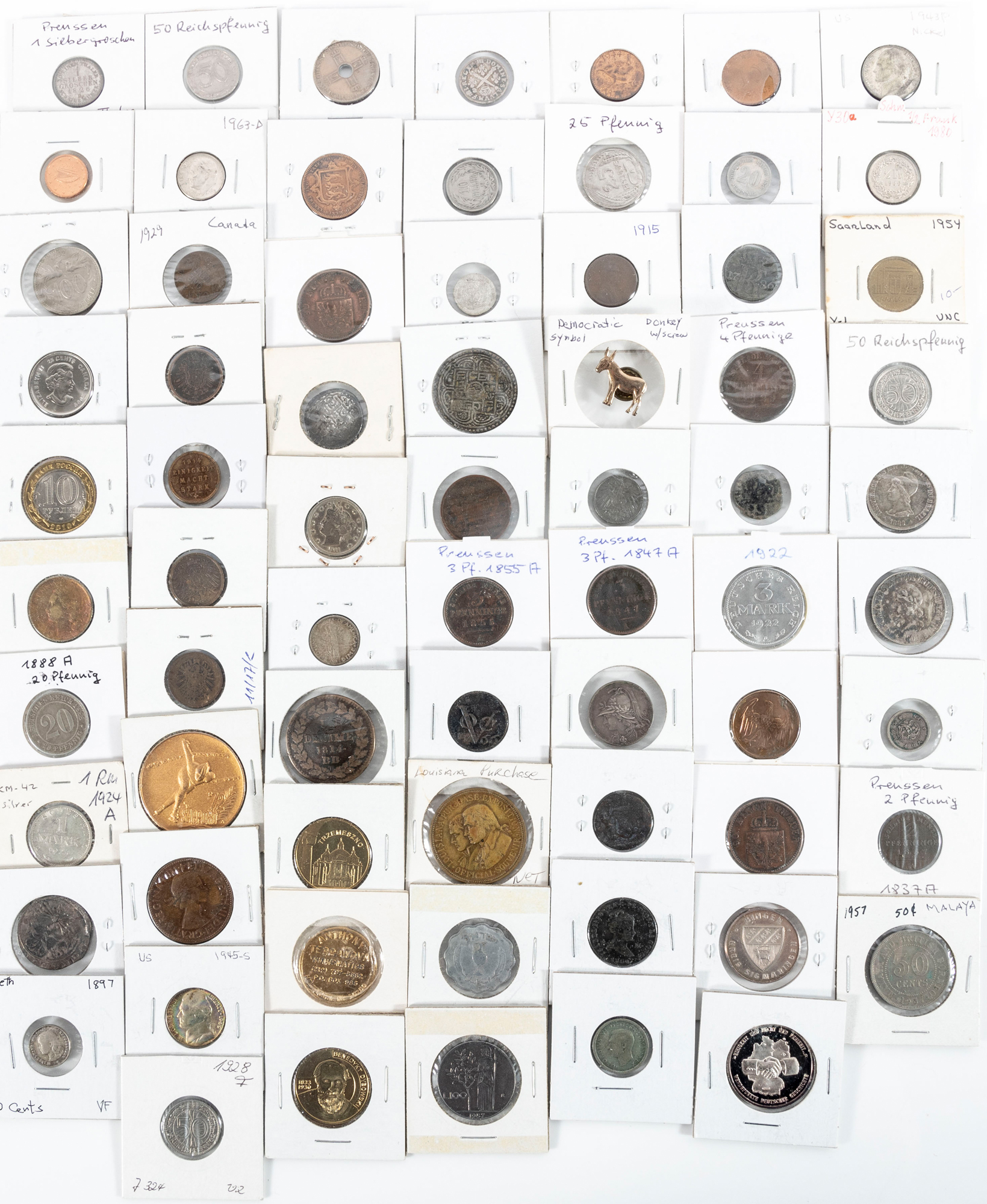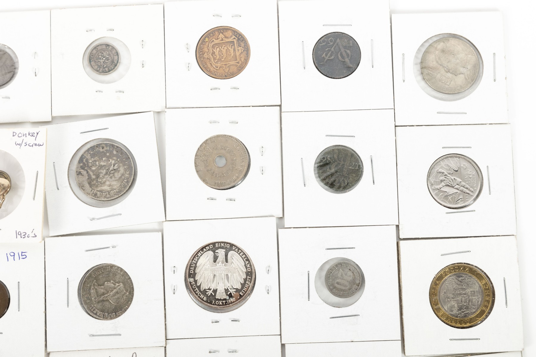 A collection of miscellaneous coins from various countries. Contents as shown and sold as is, see photos for details. All coins/tokens are contained in plastic sleeves.