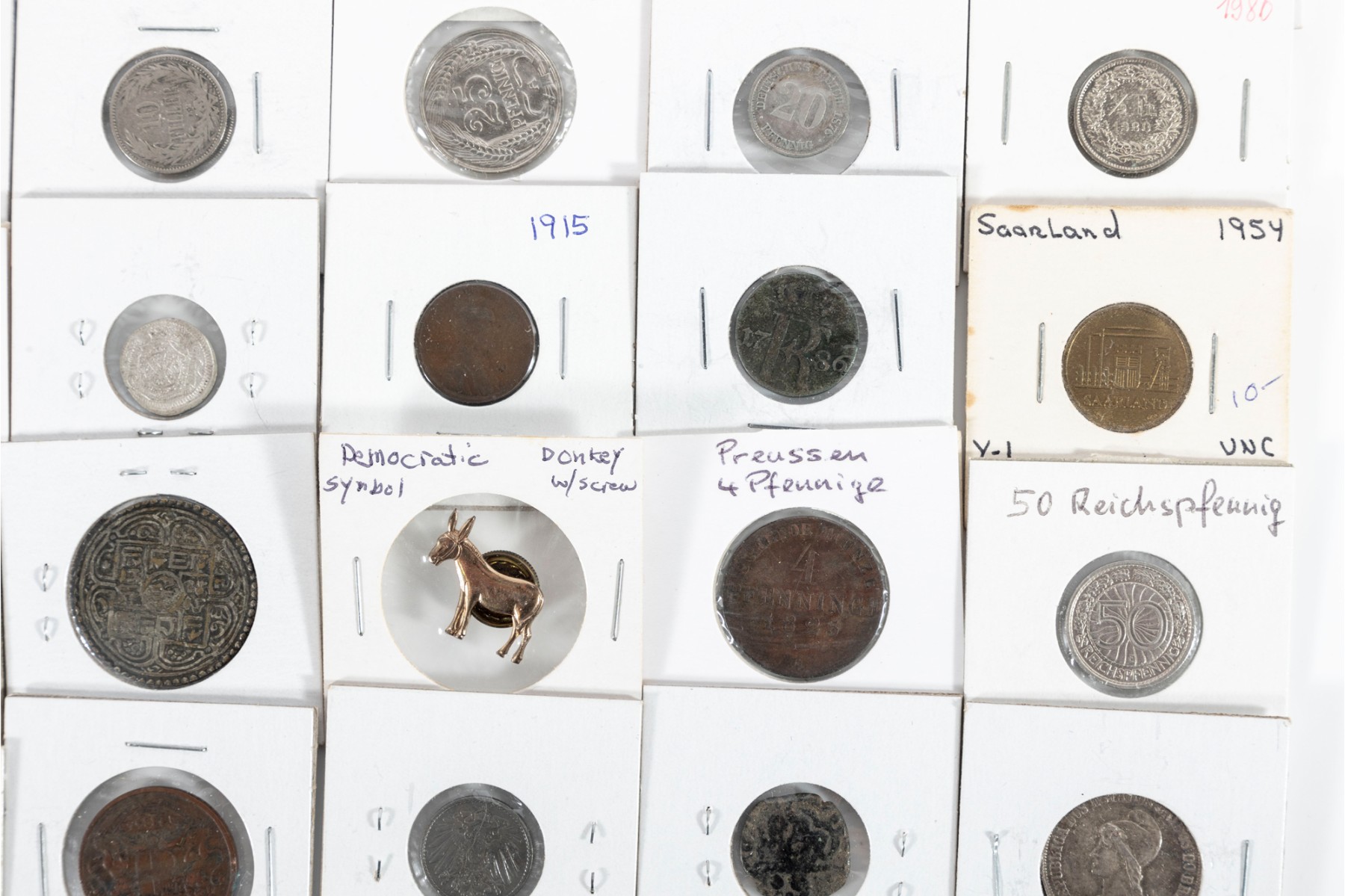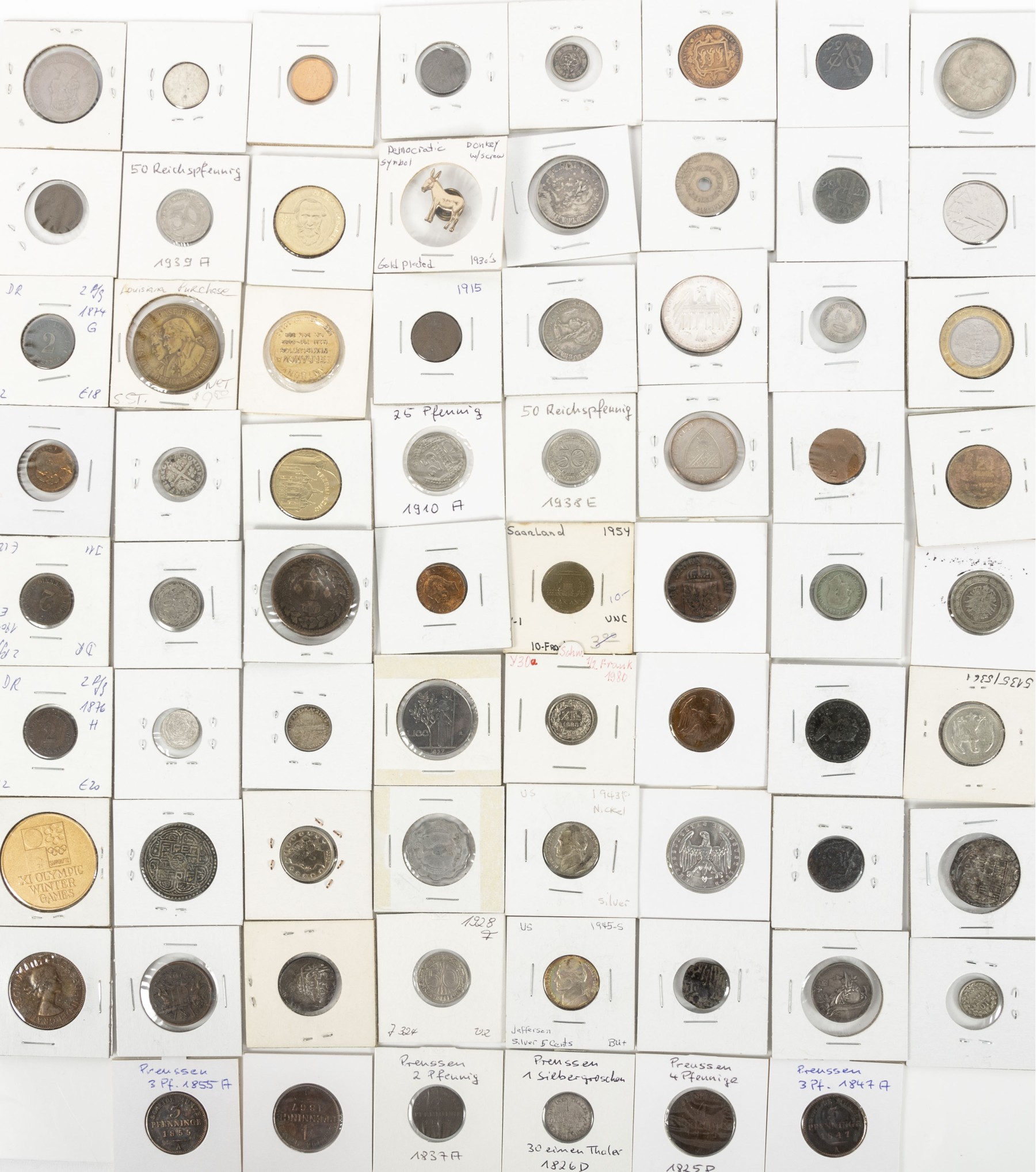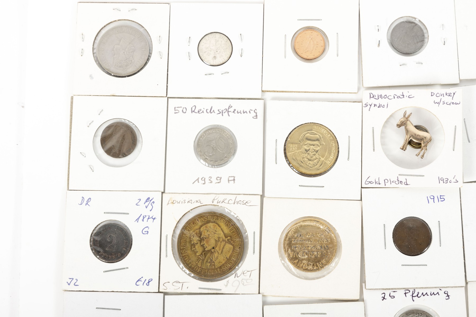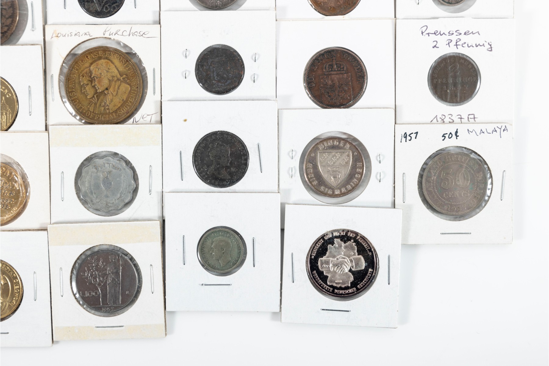 A collection of miscellaneous coins from various countries. Contents as shown and sold as is, see photos for details. All coins/tokens are contained in plastic sleeves.