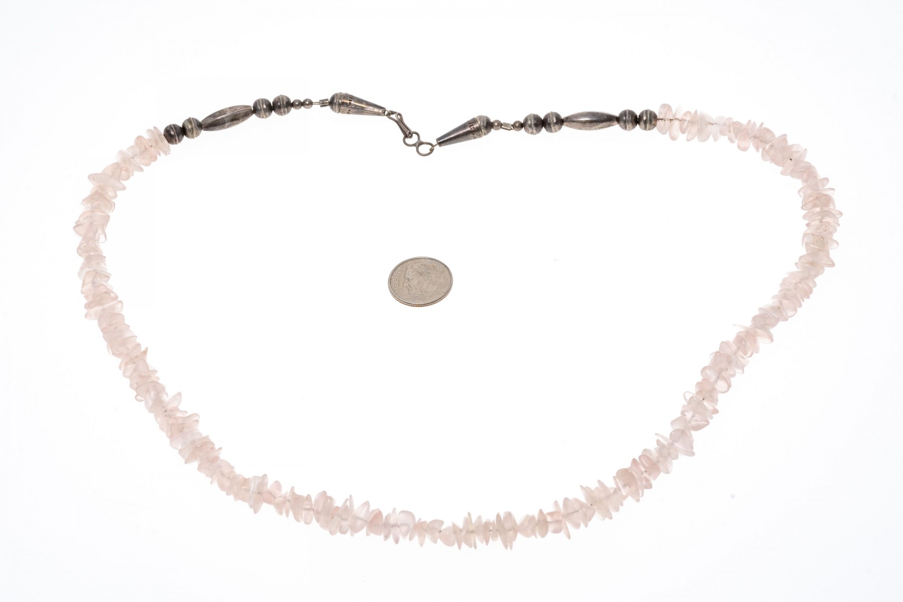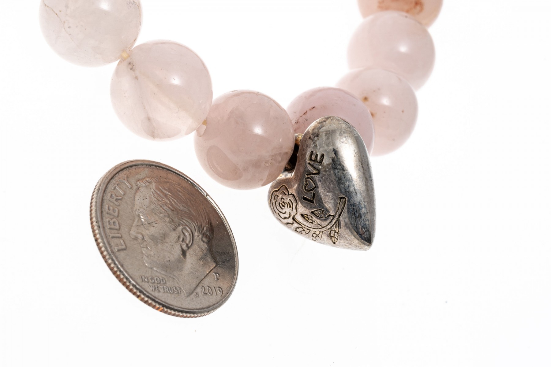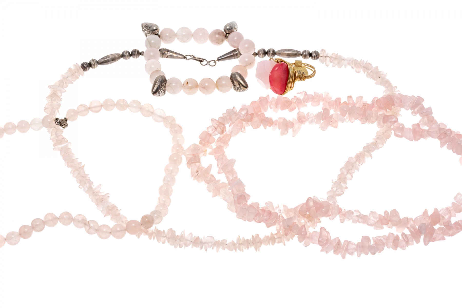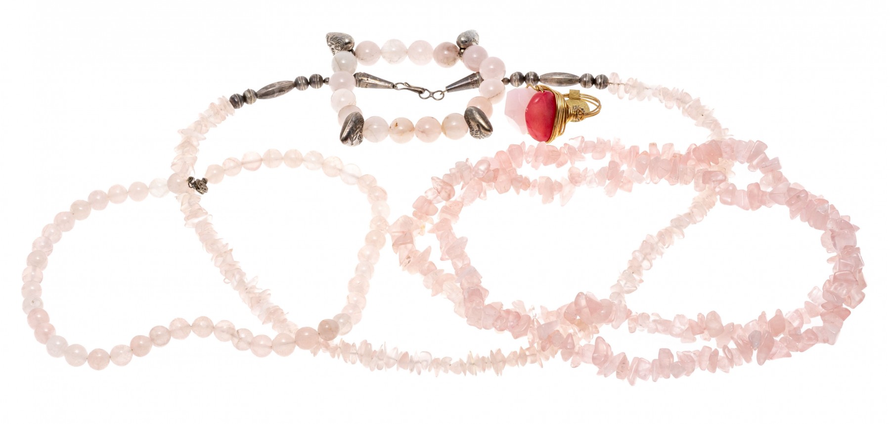 Lot of pretty rose quartz themed jewelery, including a heart motif bracelet