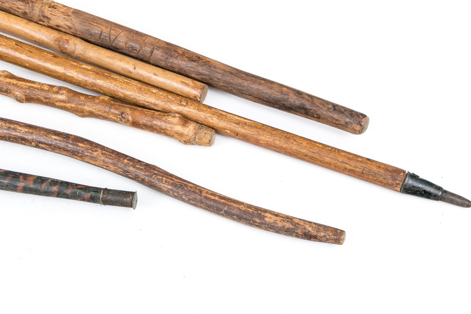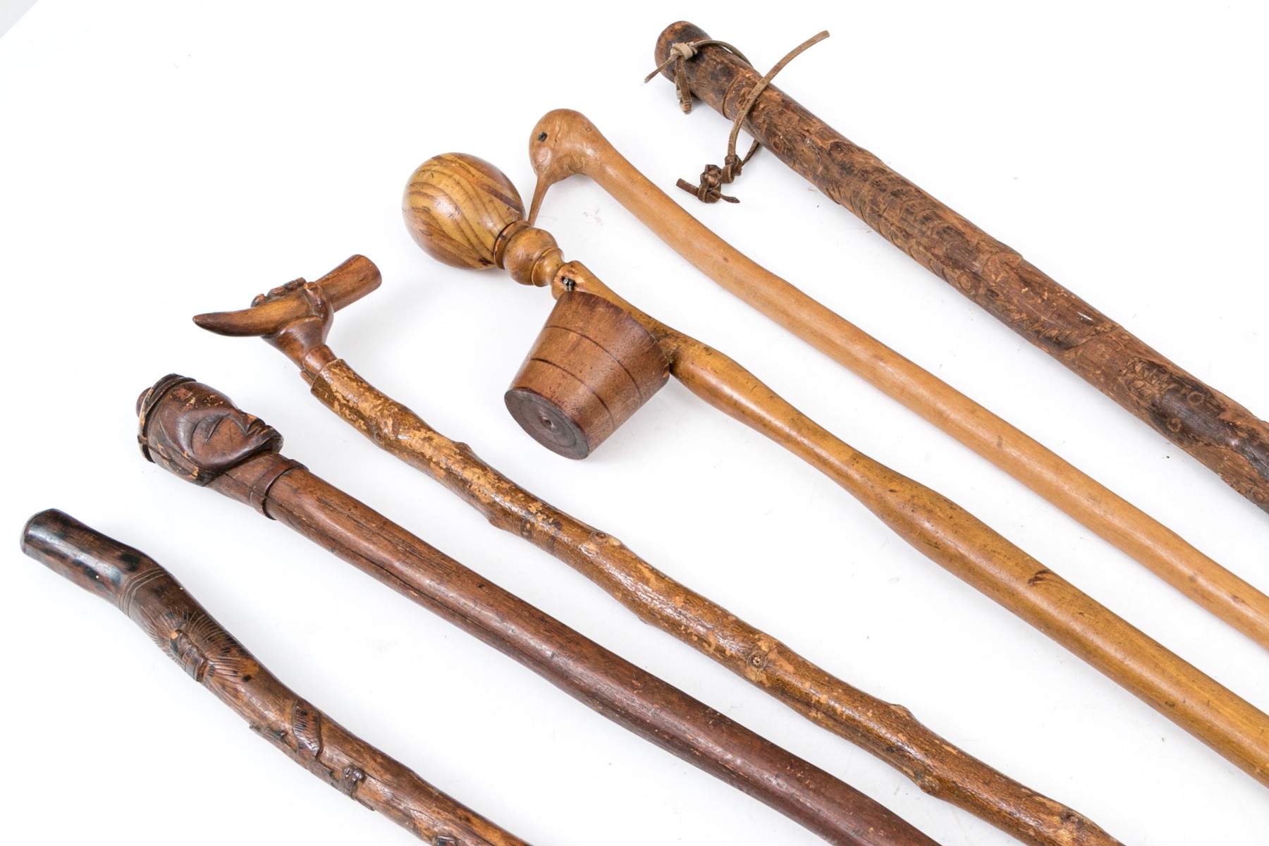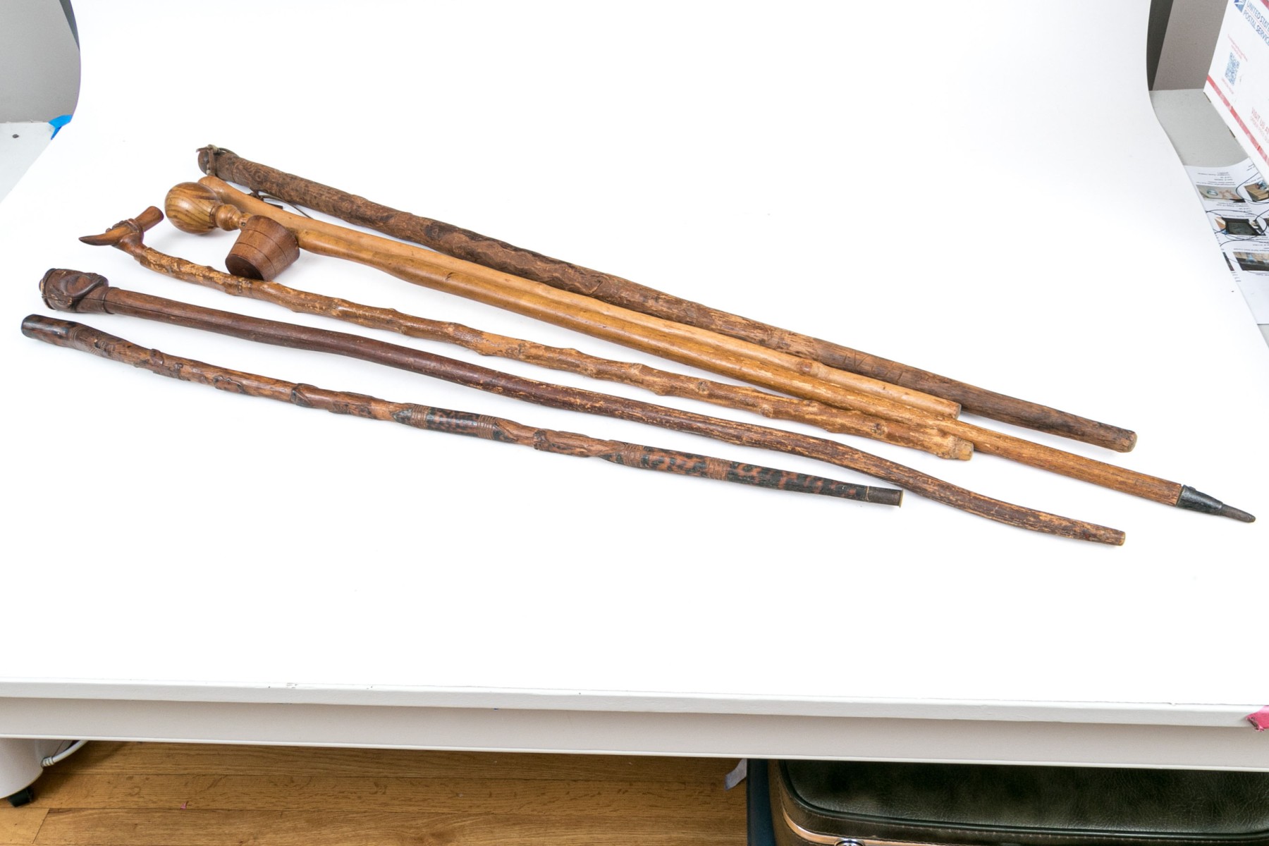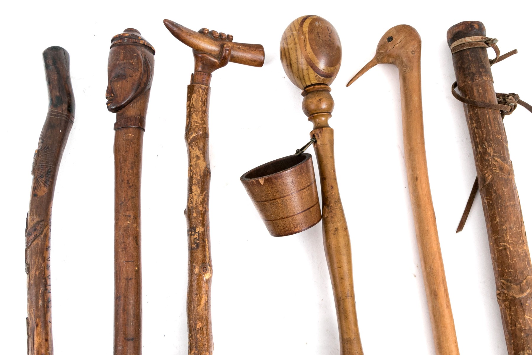 Lot of six assorted canes and walking sticks, assorted woods, including a cup design