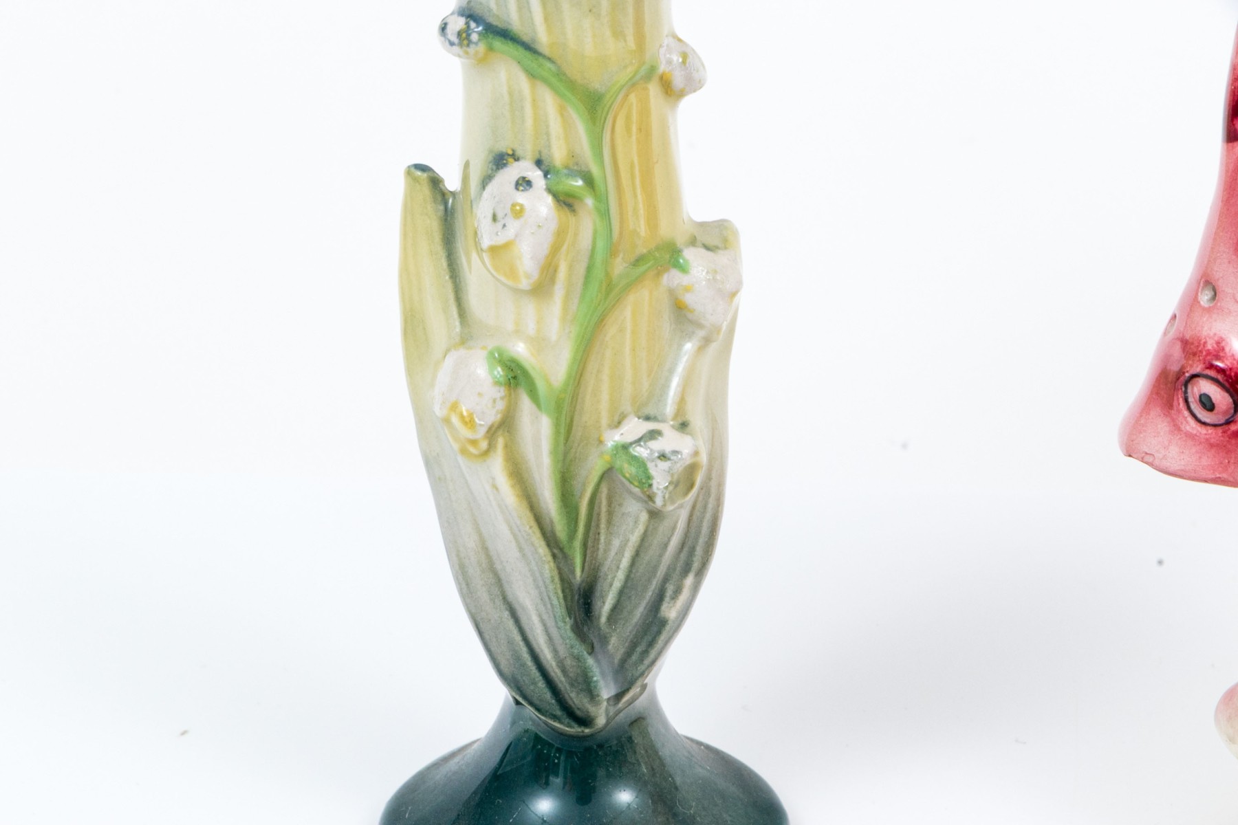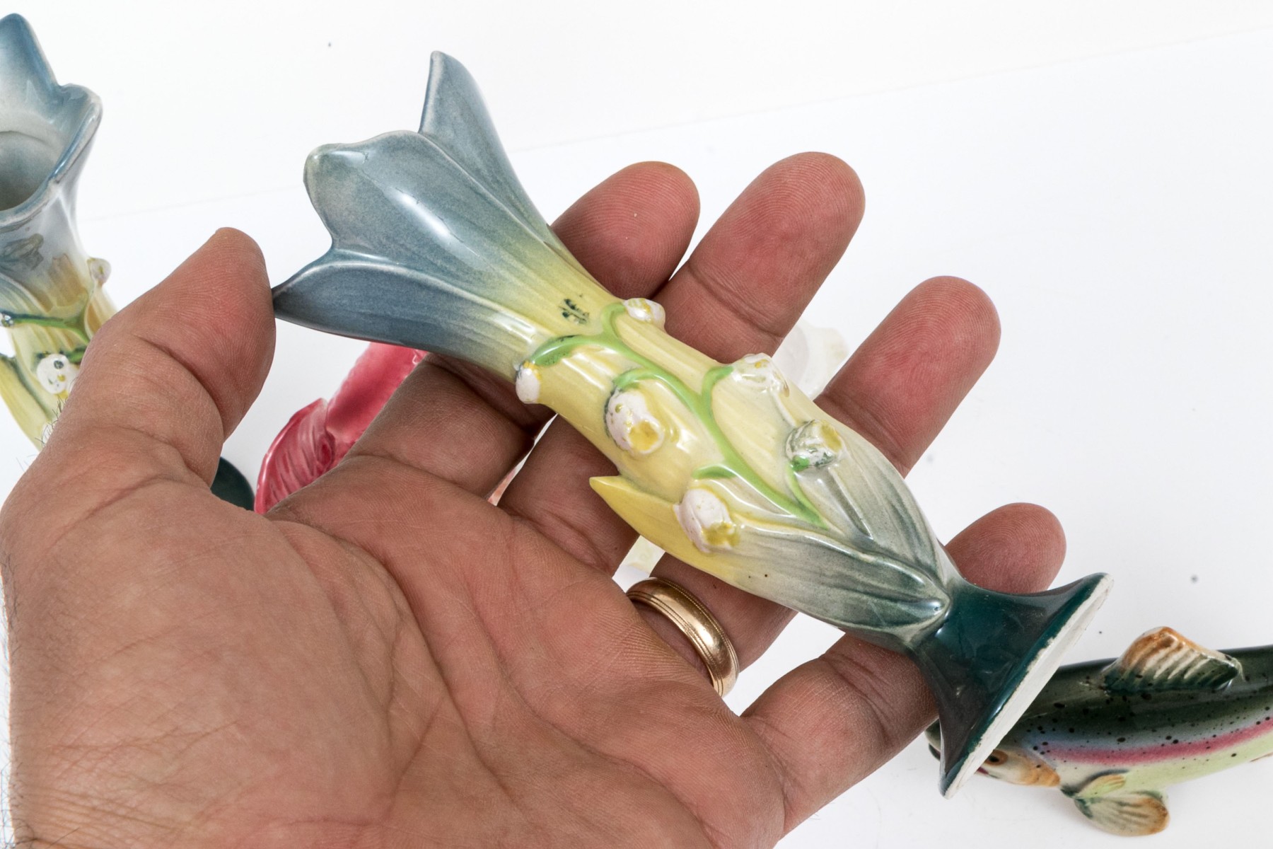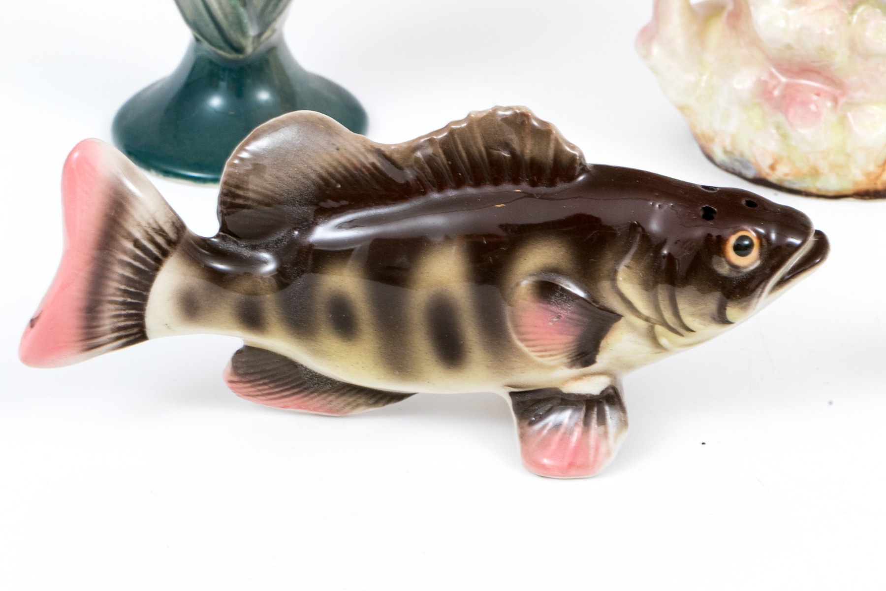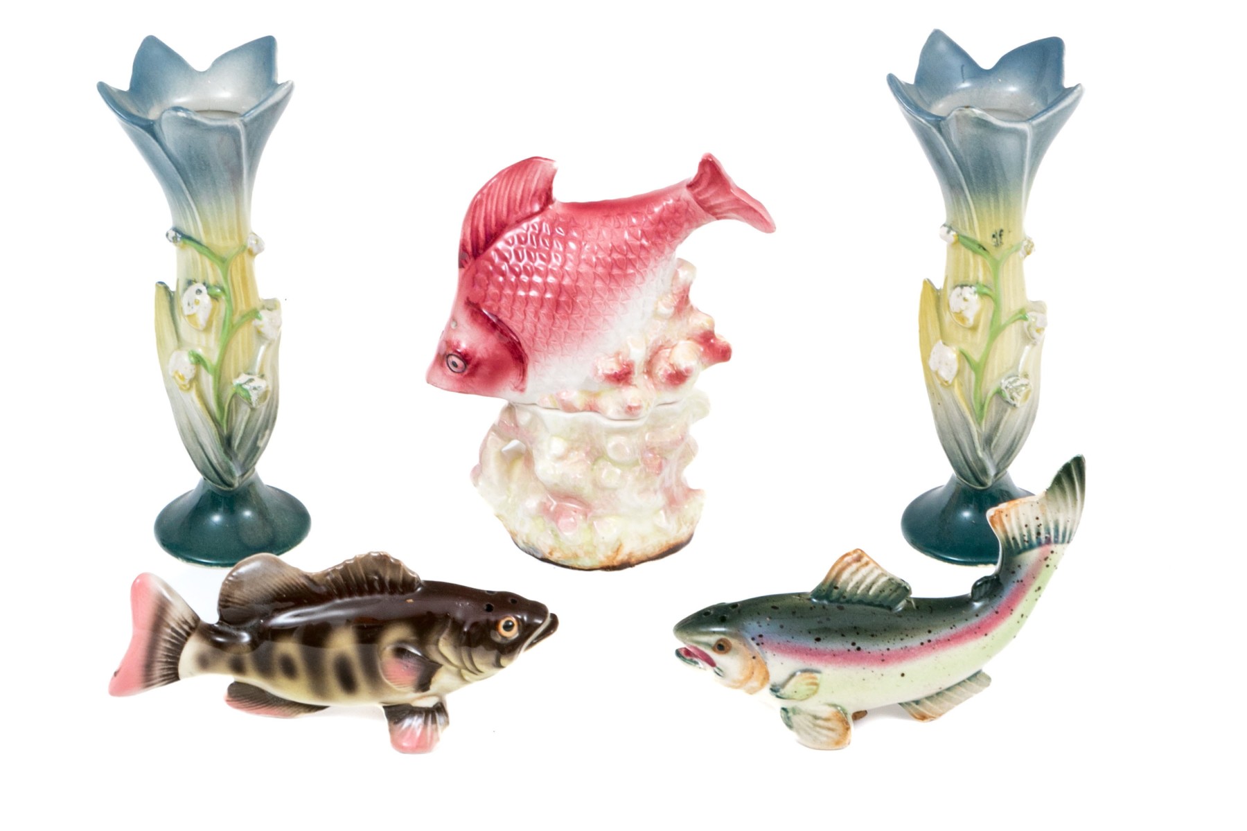 Lot of six pretty vintage table items, including fish salt and pepper shakers and lily of the valley bud vases