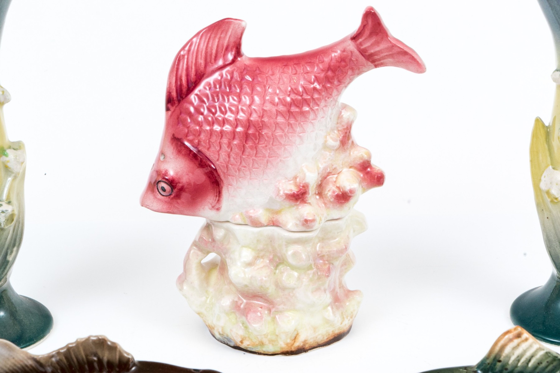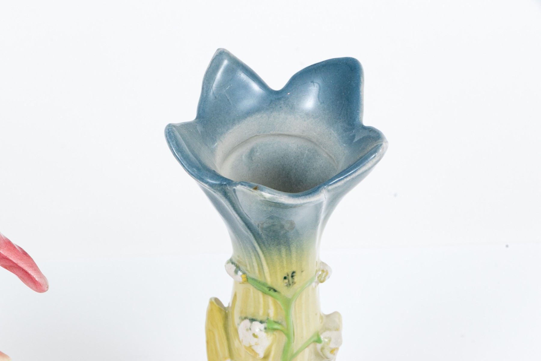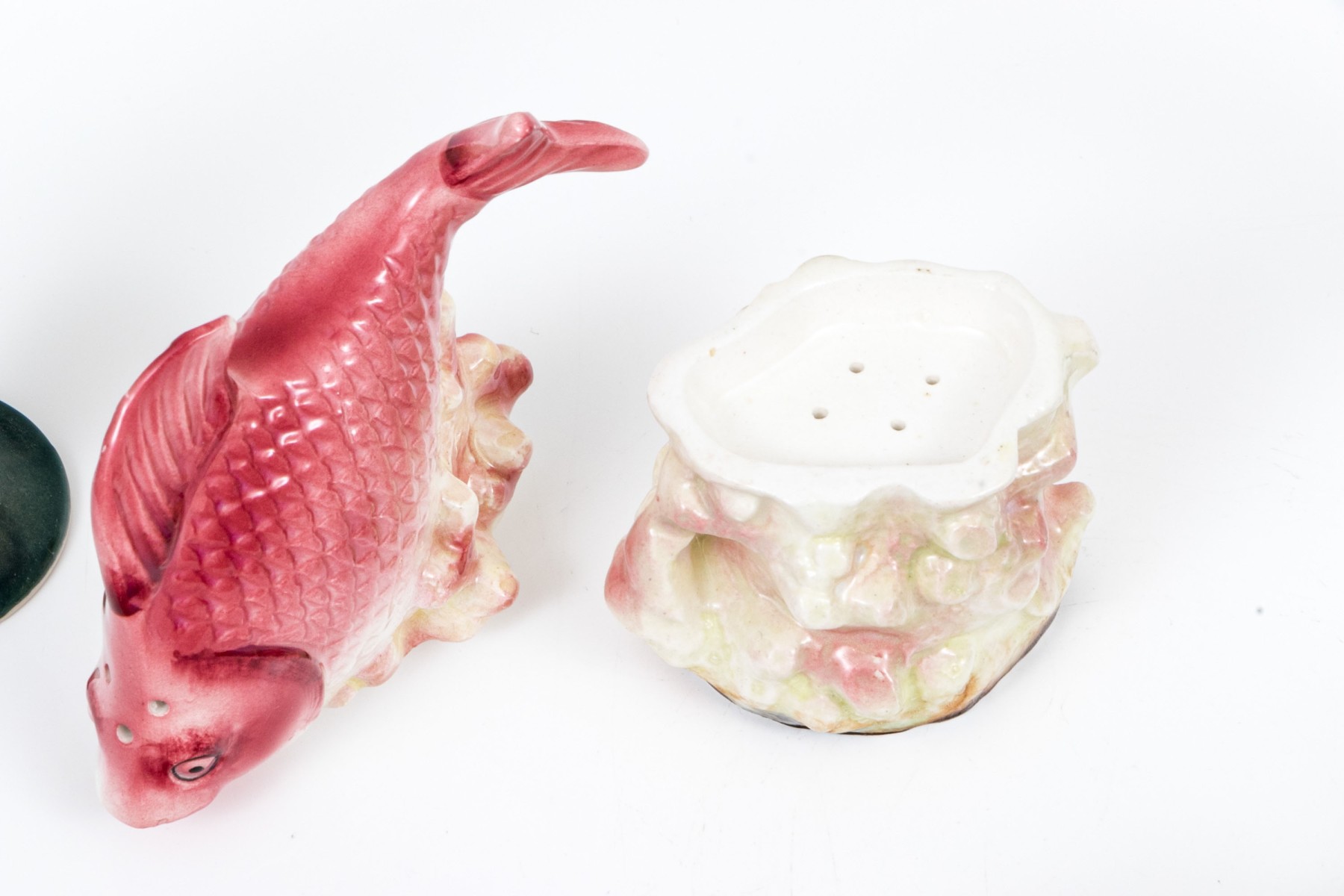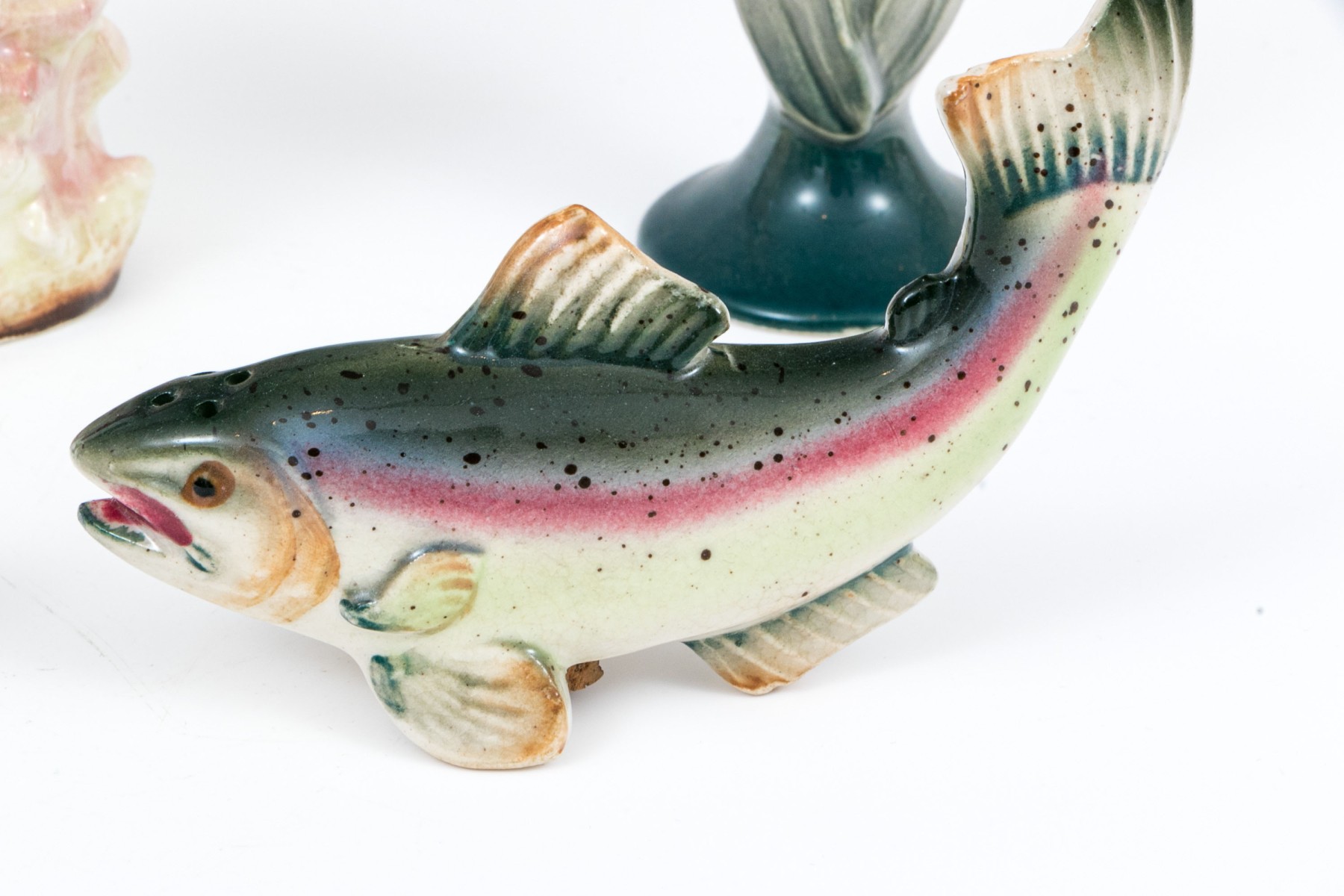 Lot of six pretty vintage table items, including fish salt and pepper shakers and lily of the valley bud vases