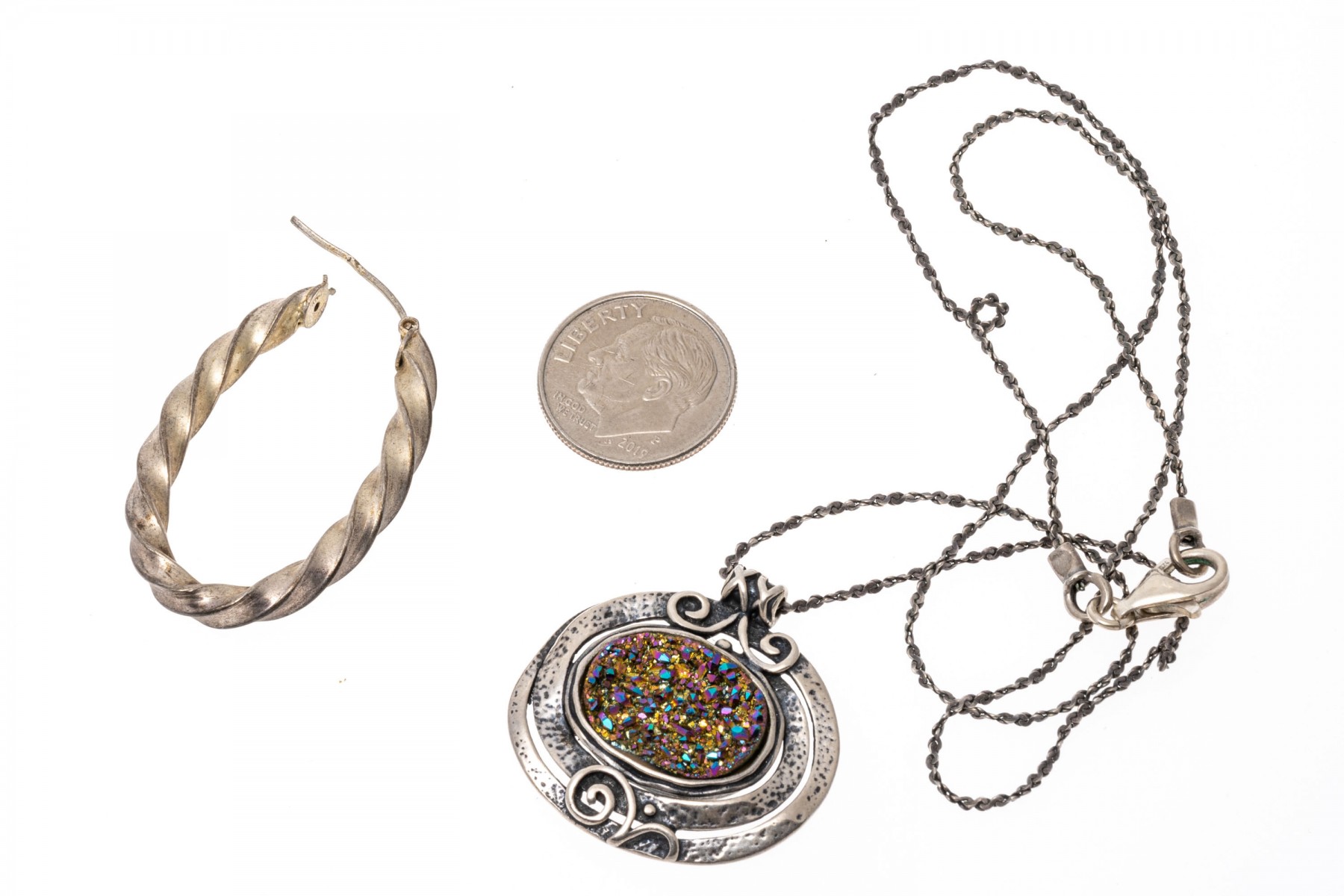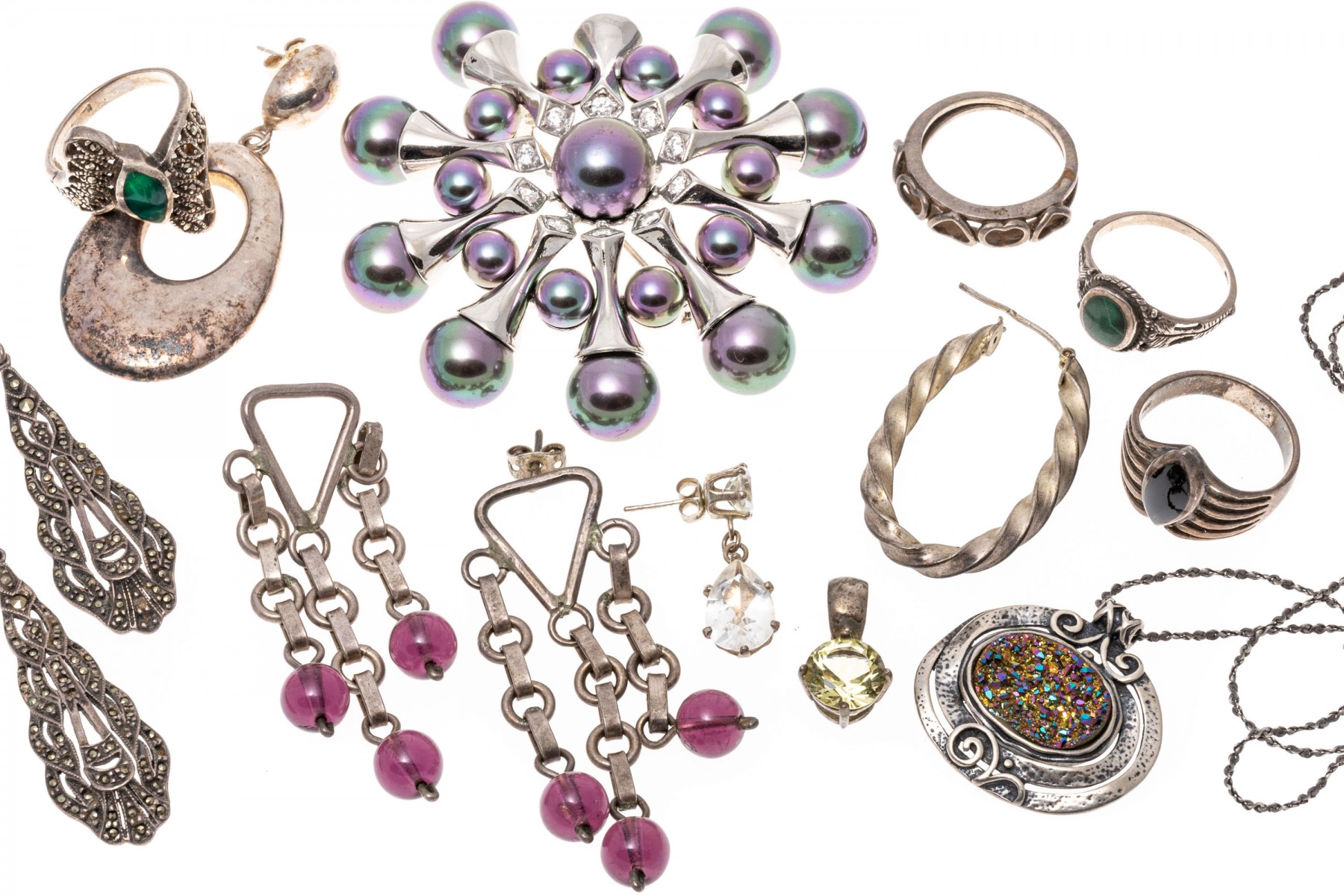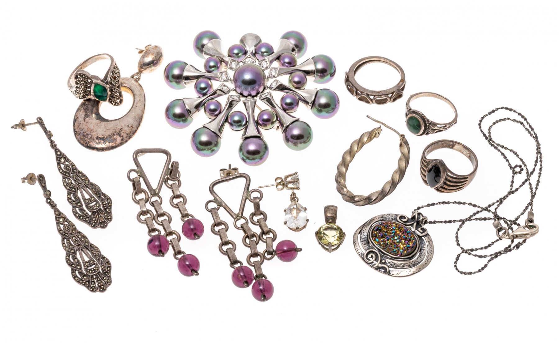 Lot sterling silver jewelry. The group contains earrings, rings, necklaces and pendants.