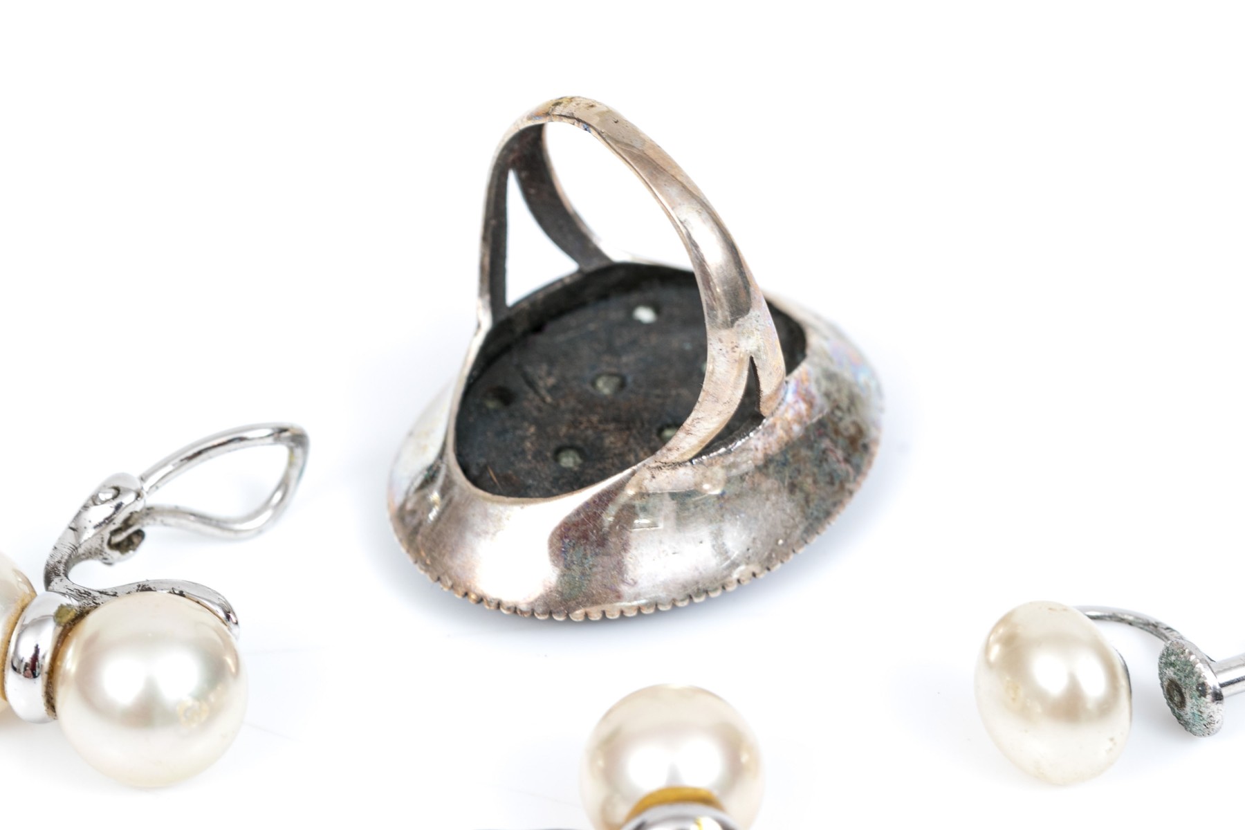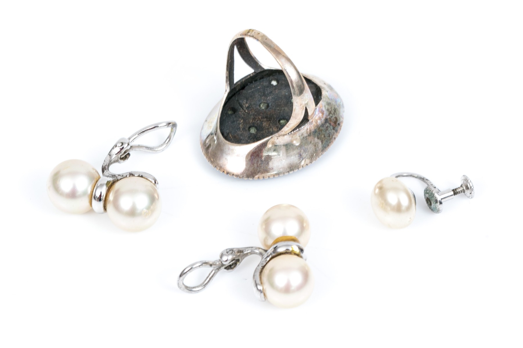Lot of sterling silver jewelry including a ring and faux pearl earrings, with a half pair of earrings