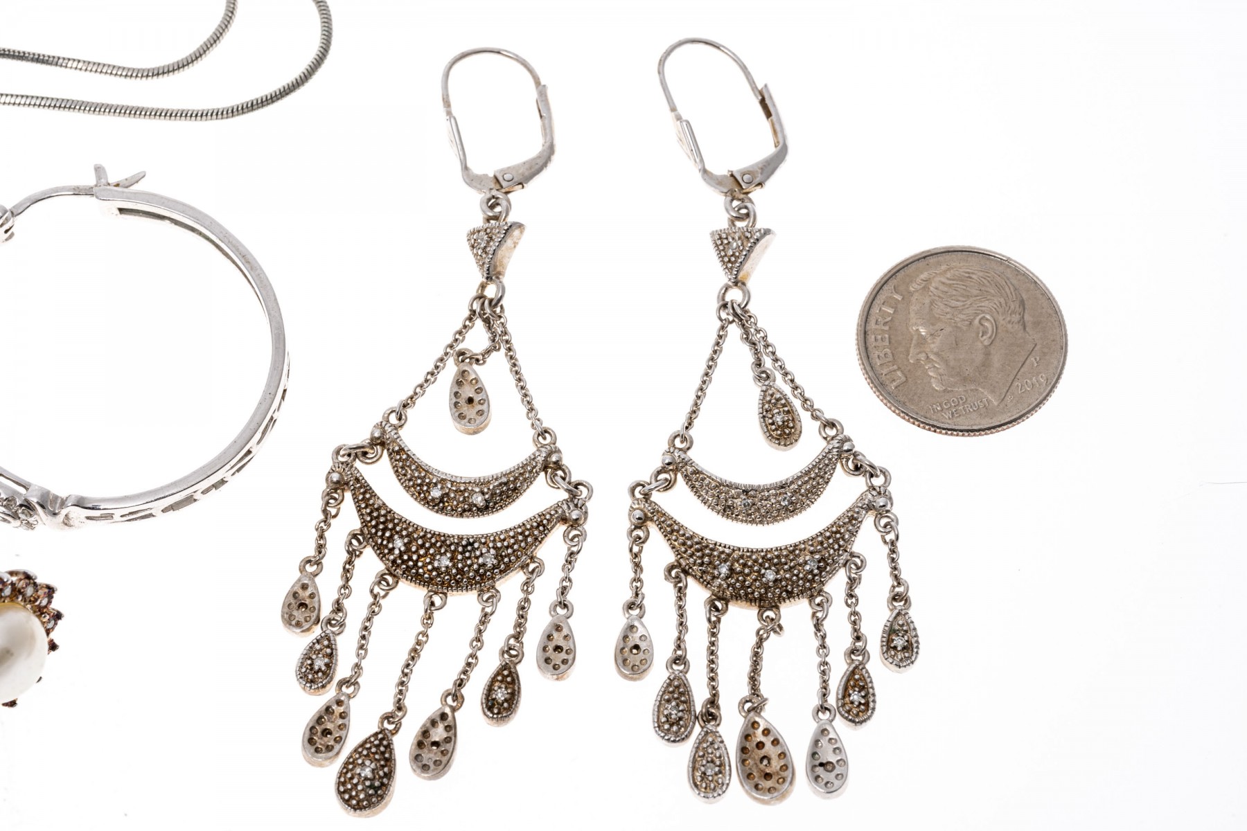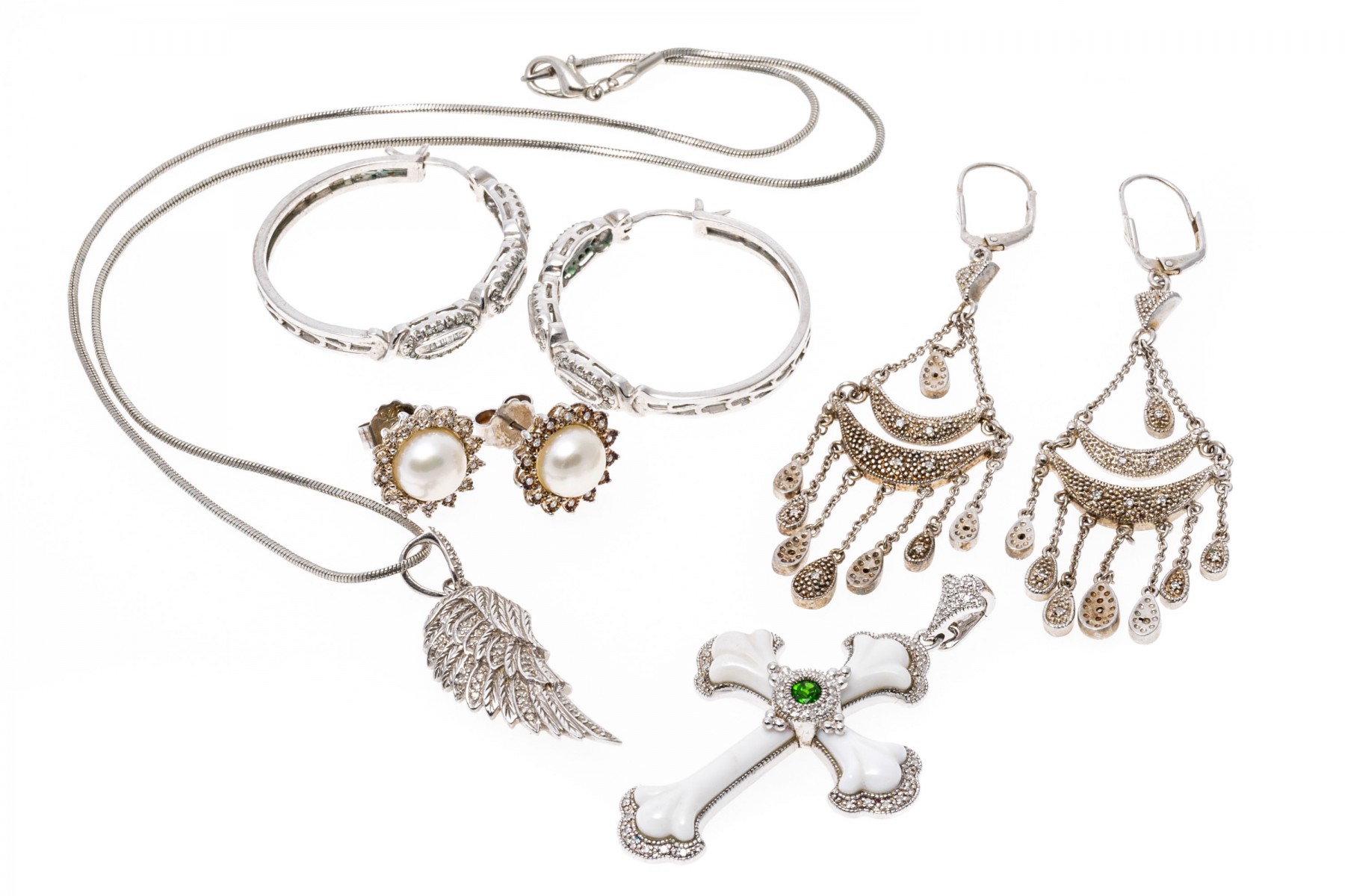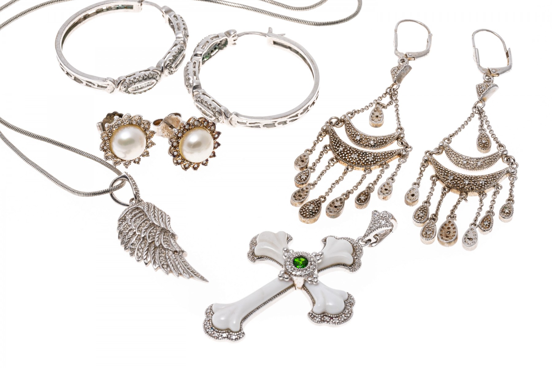 A group of sterling silver jewelry with accent diamonds. Three pairs of earrings, one with 8mm pearls. One necklace with wing pendant and one cross pendant. The accent diamonds are approximately 1.5 TCW.