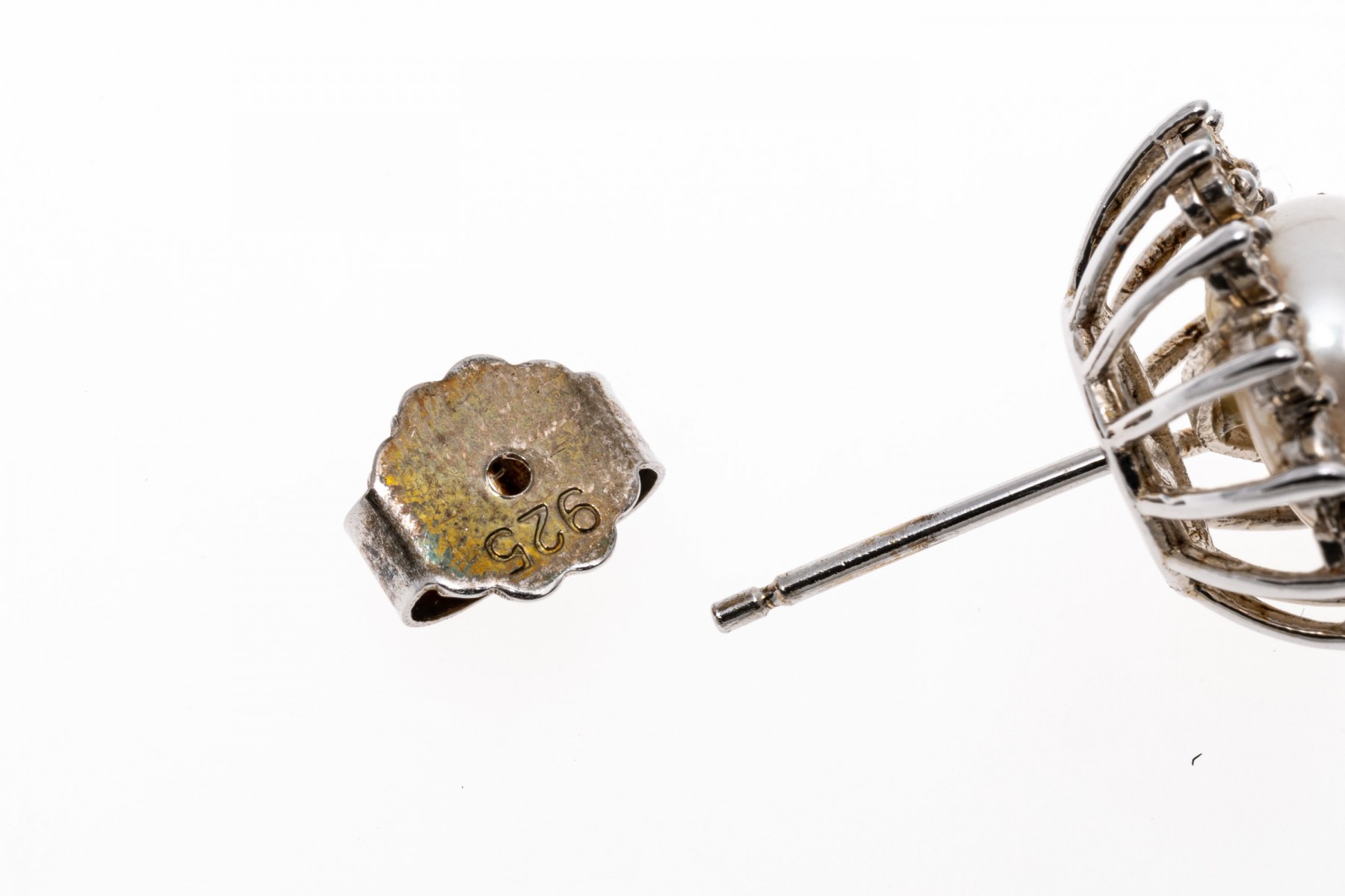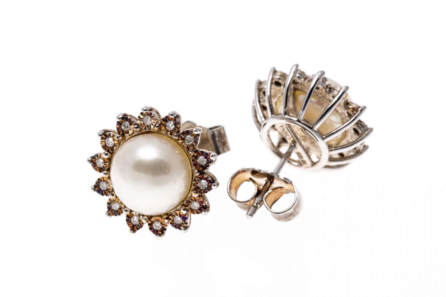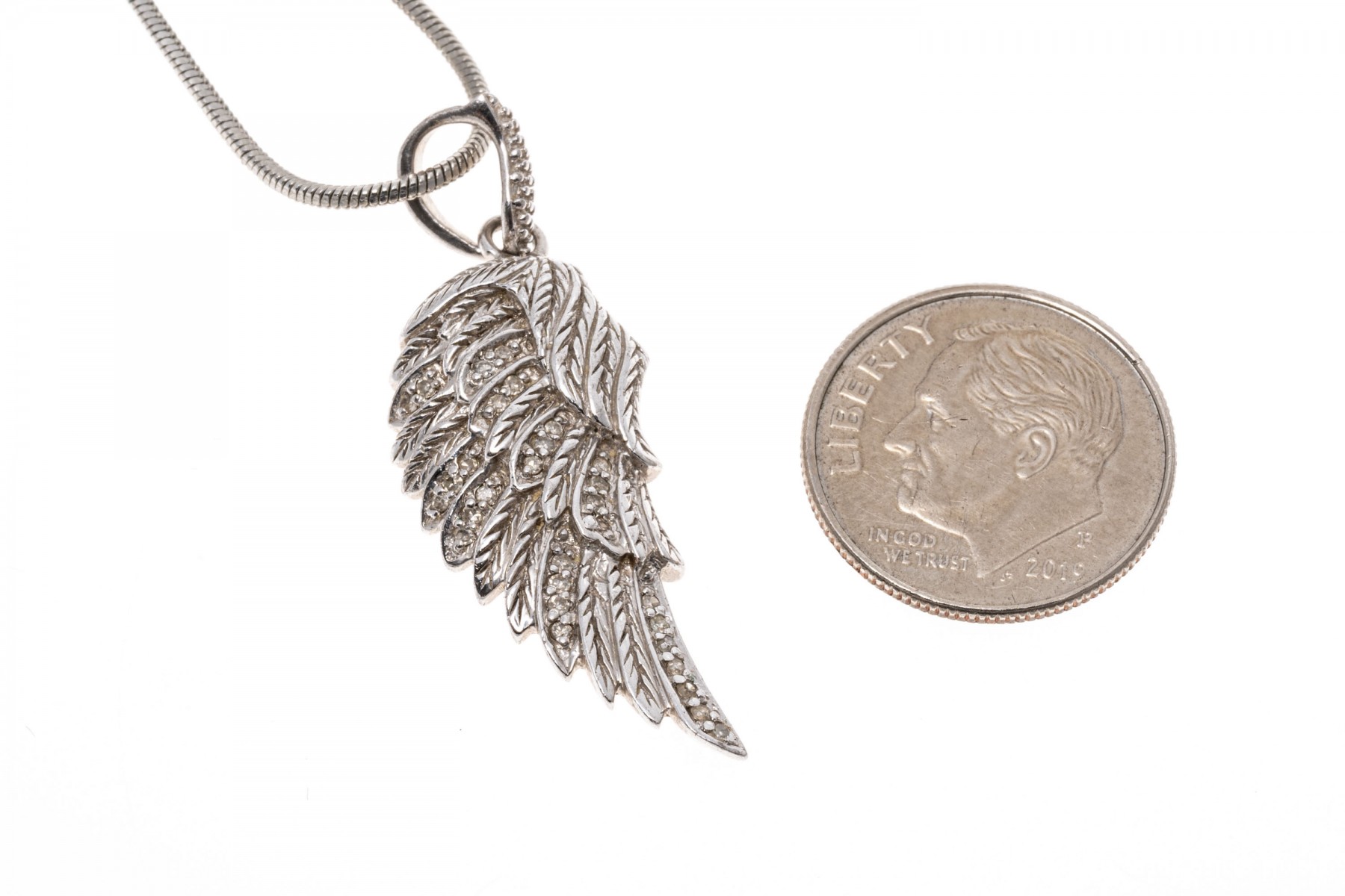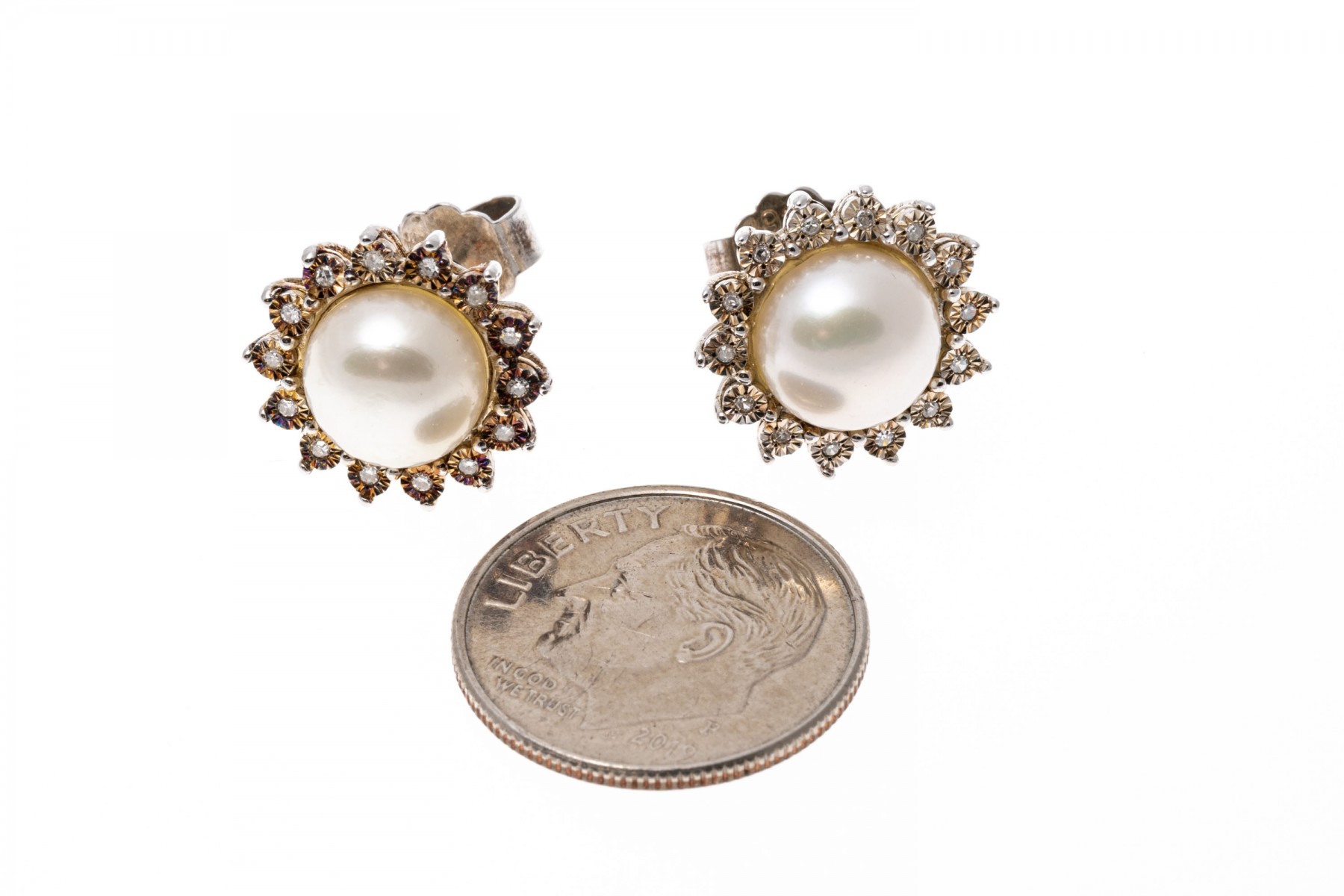A group of sterling silver jewelry with accent diamonds. Three pairs of earrings, one with 8mm pearls. One necklace with wing pendant and one cross pendant. The accent diamonds are approximately 1.5 TCW.
