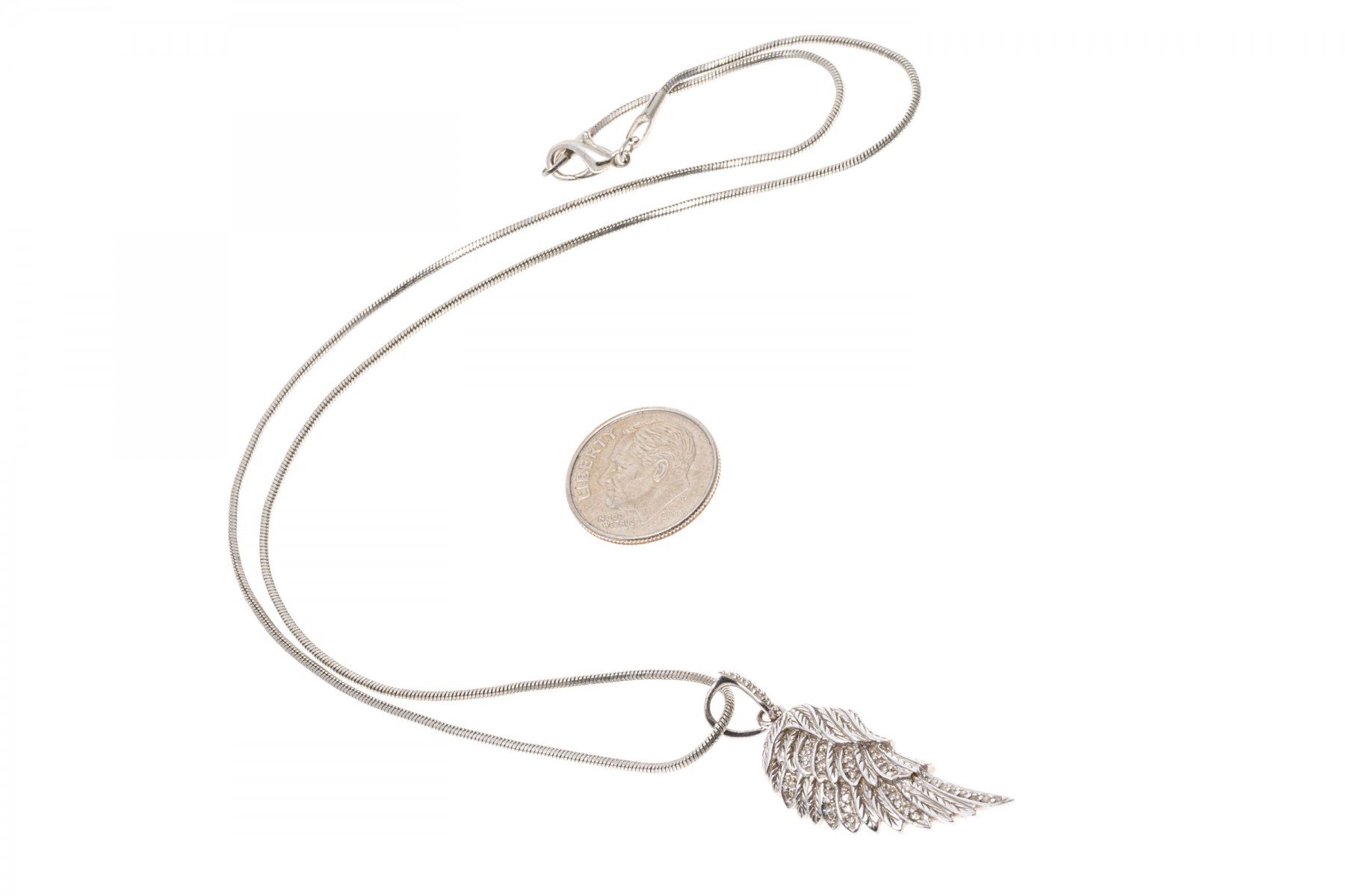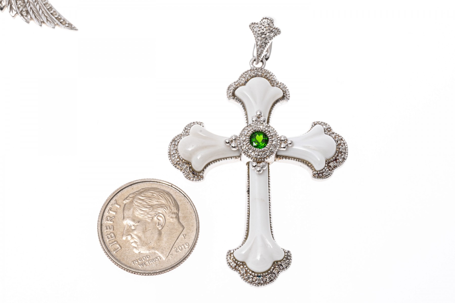 Dimensions: 18" L-Chain, 1/2" W x 1 7/16" L (with bale)-Wing Pendant, 1 1/4" D-Hoops, 1/2" D-Stud Earrings, 7/8" W x 3" L-Chandelier Earrings, 1 1/4" W x 2" L (with bale)-Cross Pendant