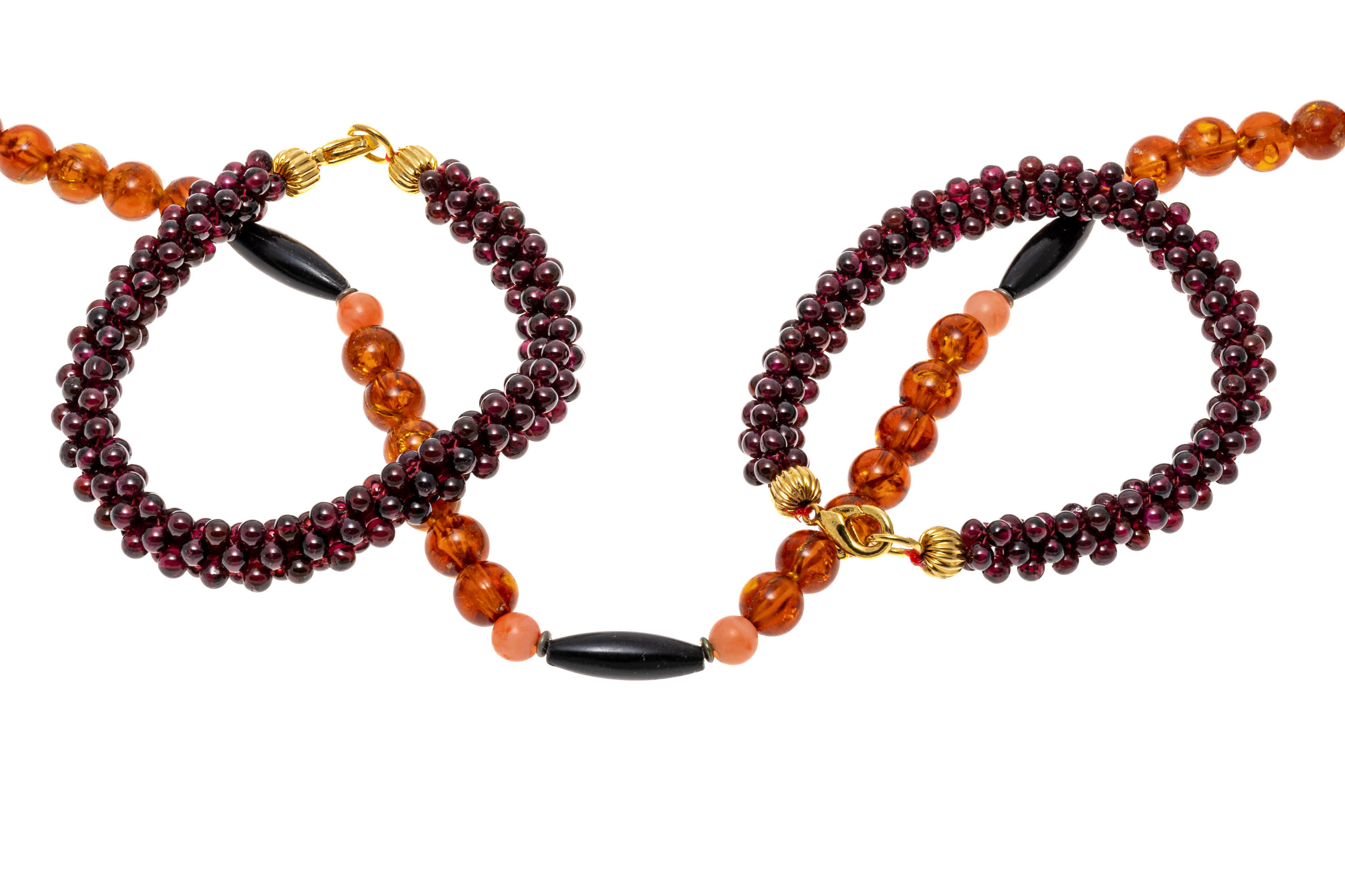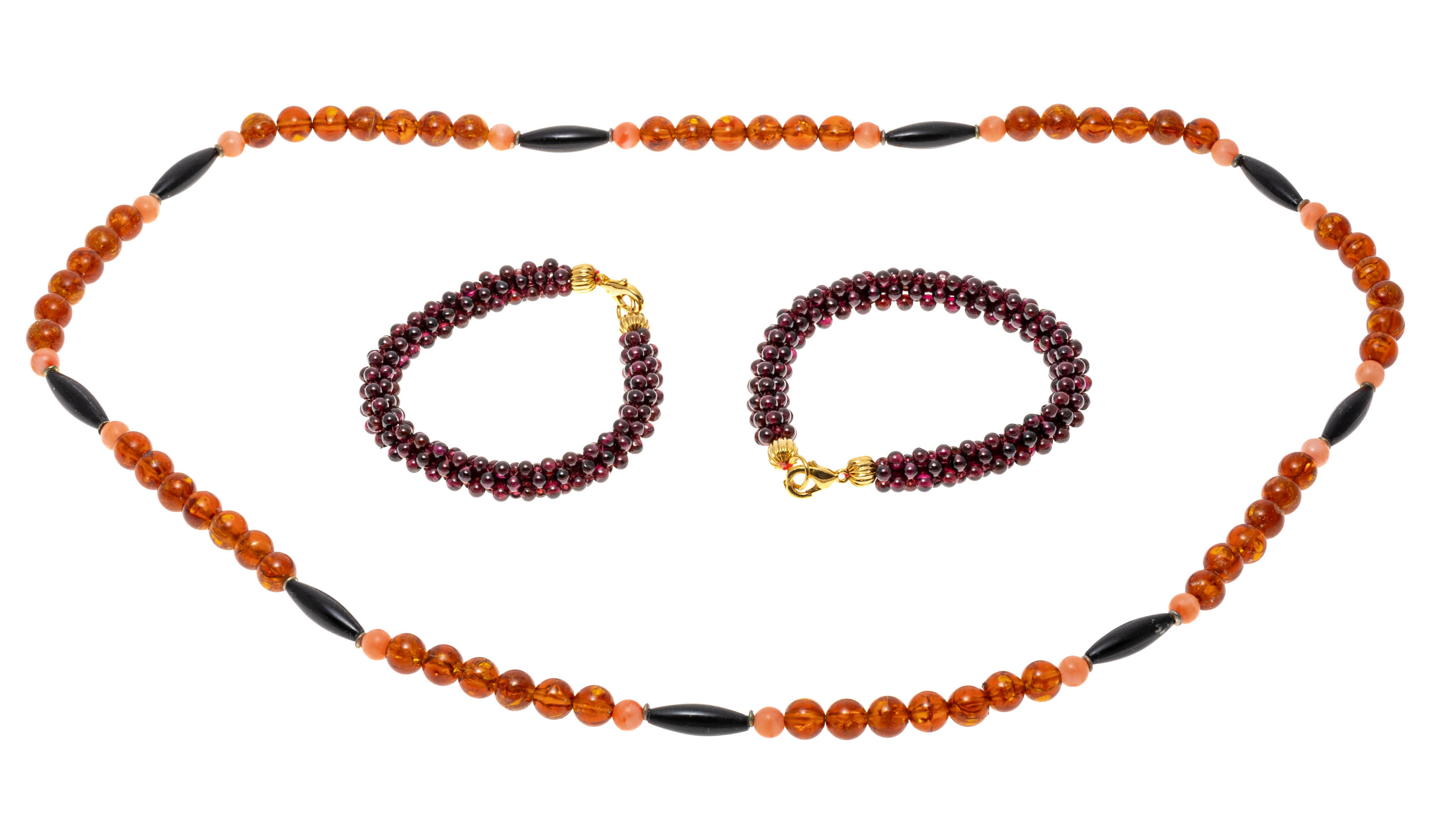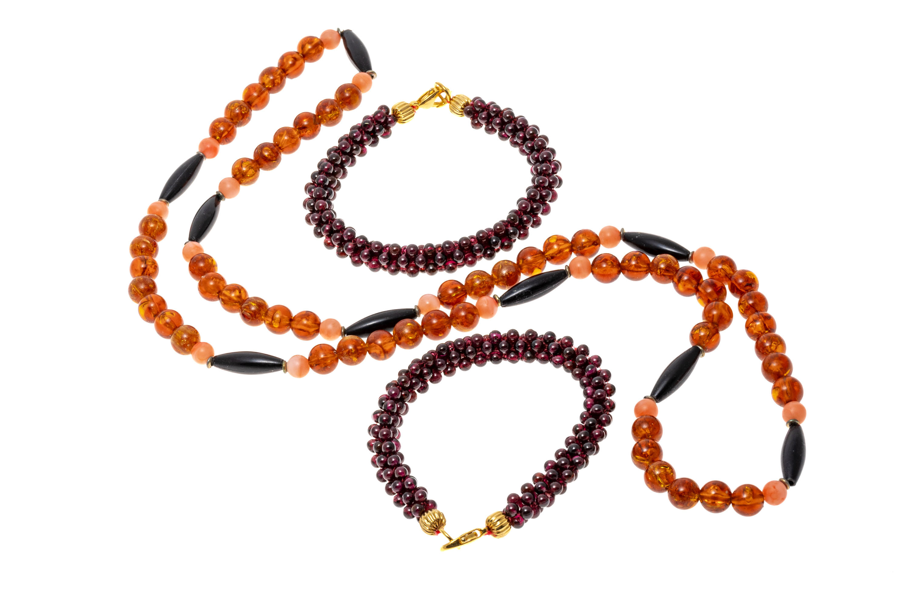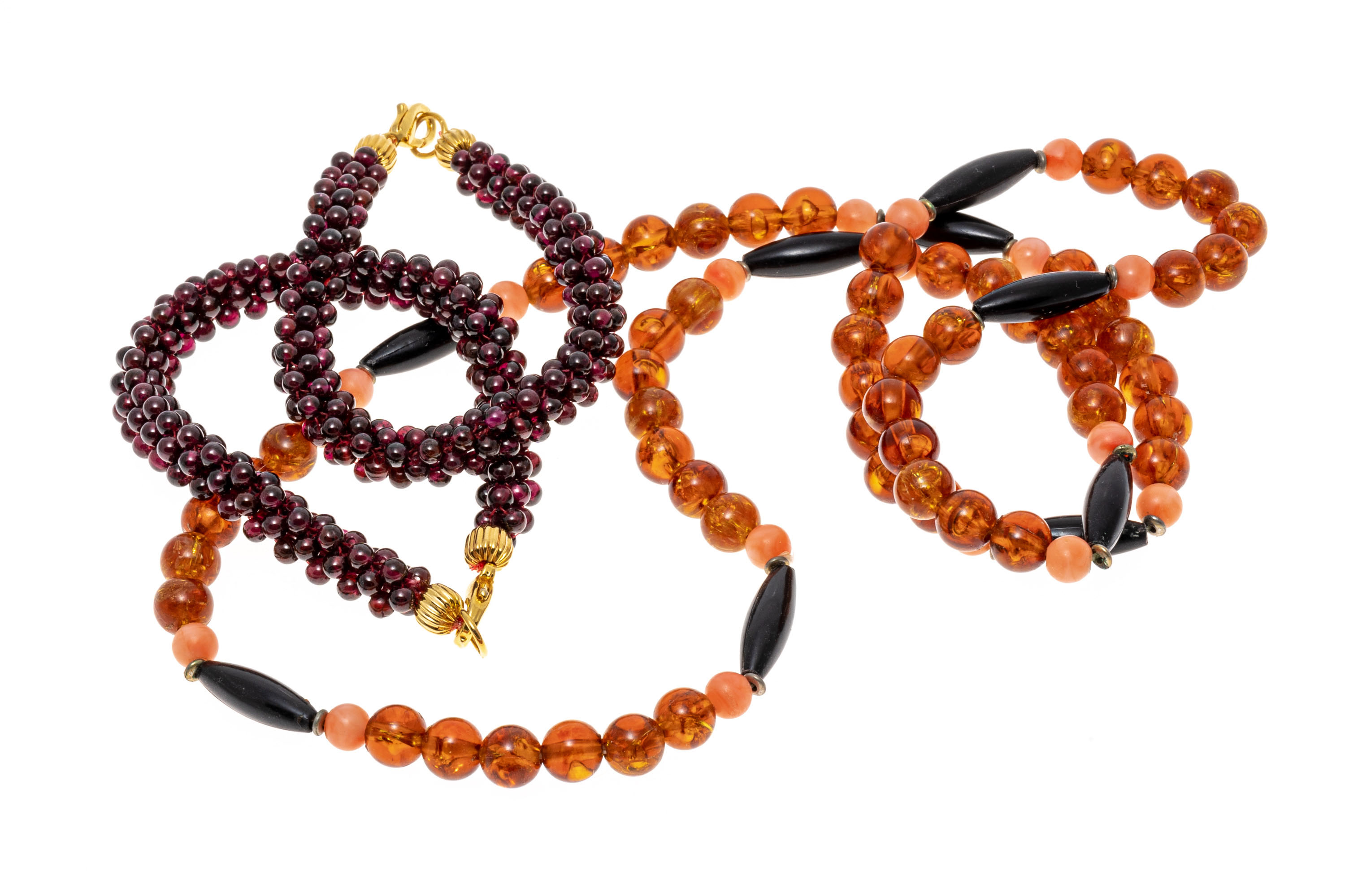 Lot of striking amber beads with a pair of garnet cluster bead bracelets