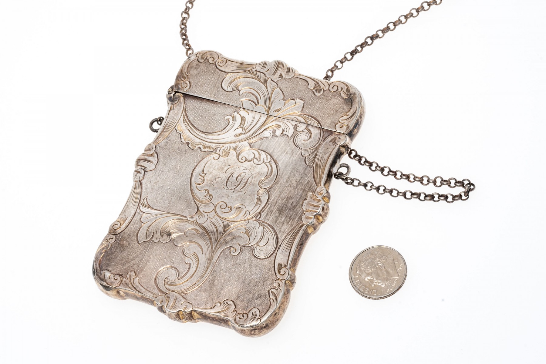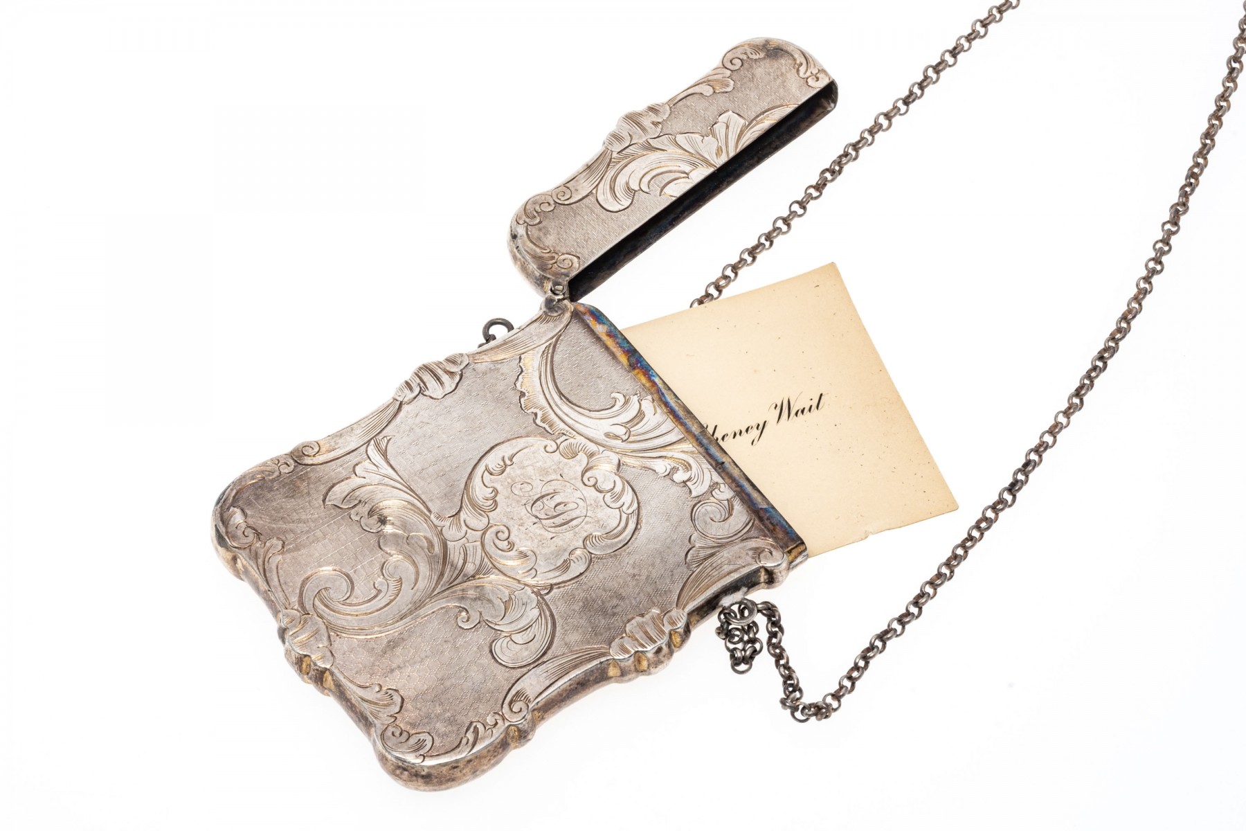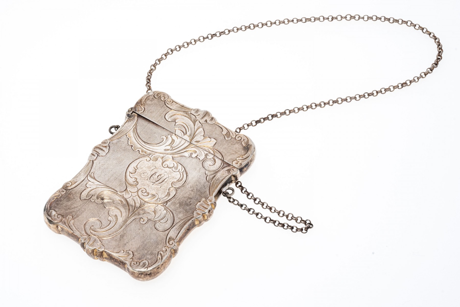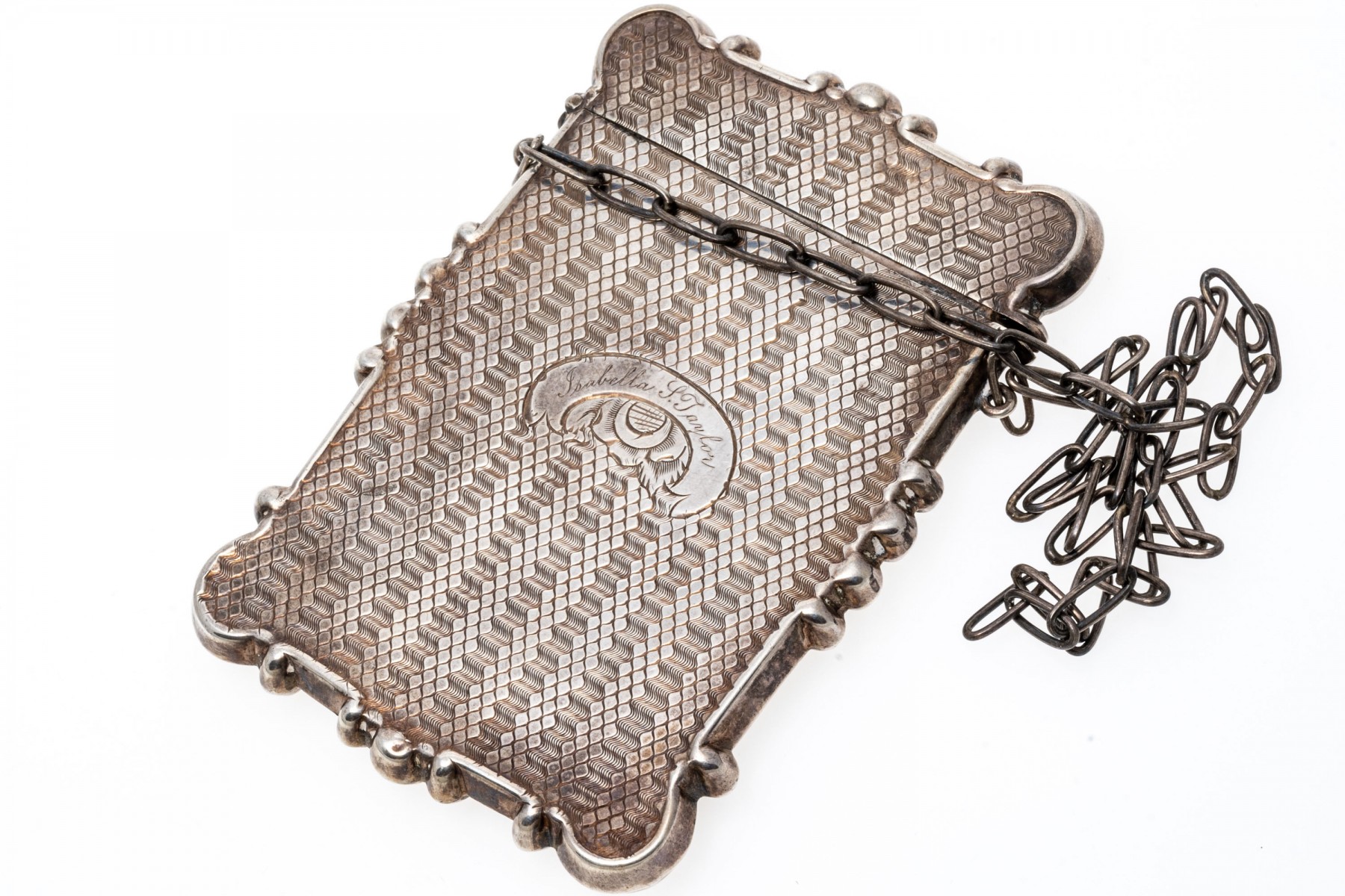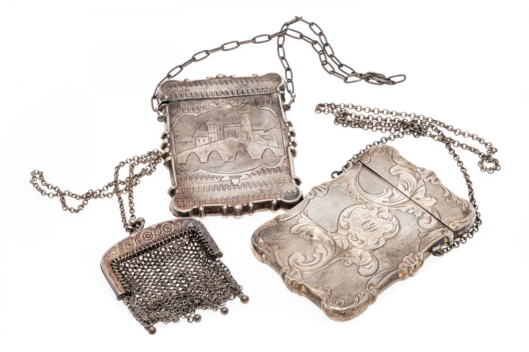 Lot of three antique sterling silver chatelaine pieces, including two card cases and one mesh change purse