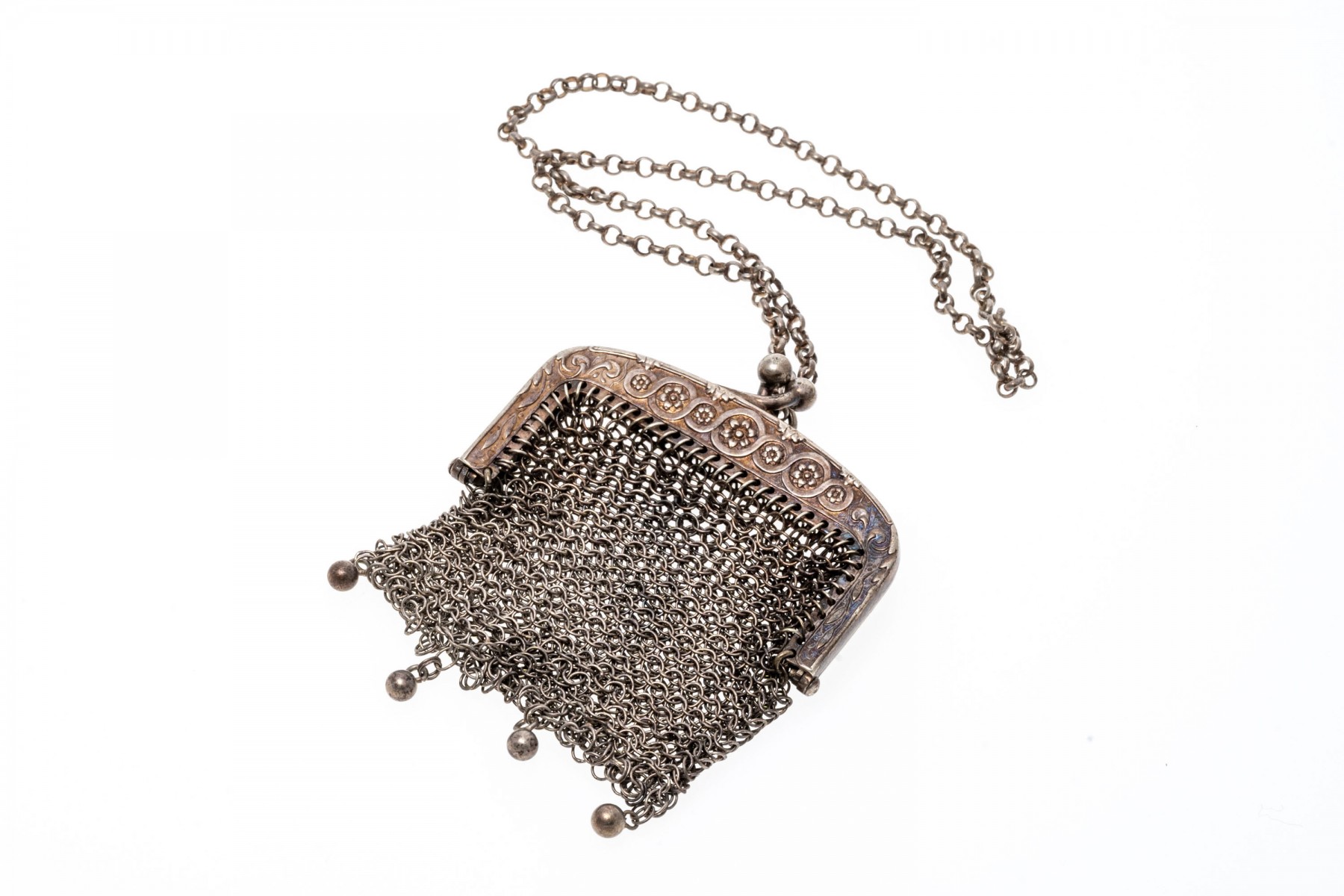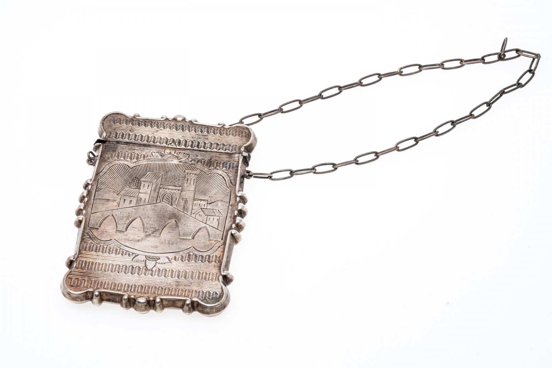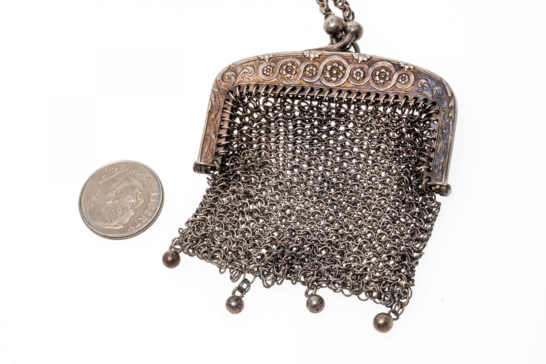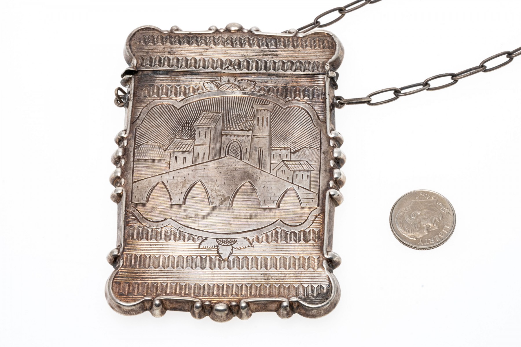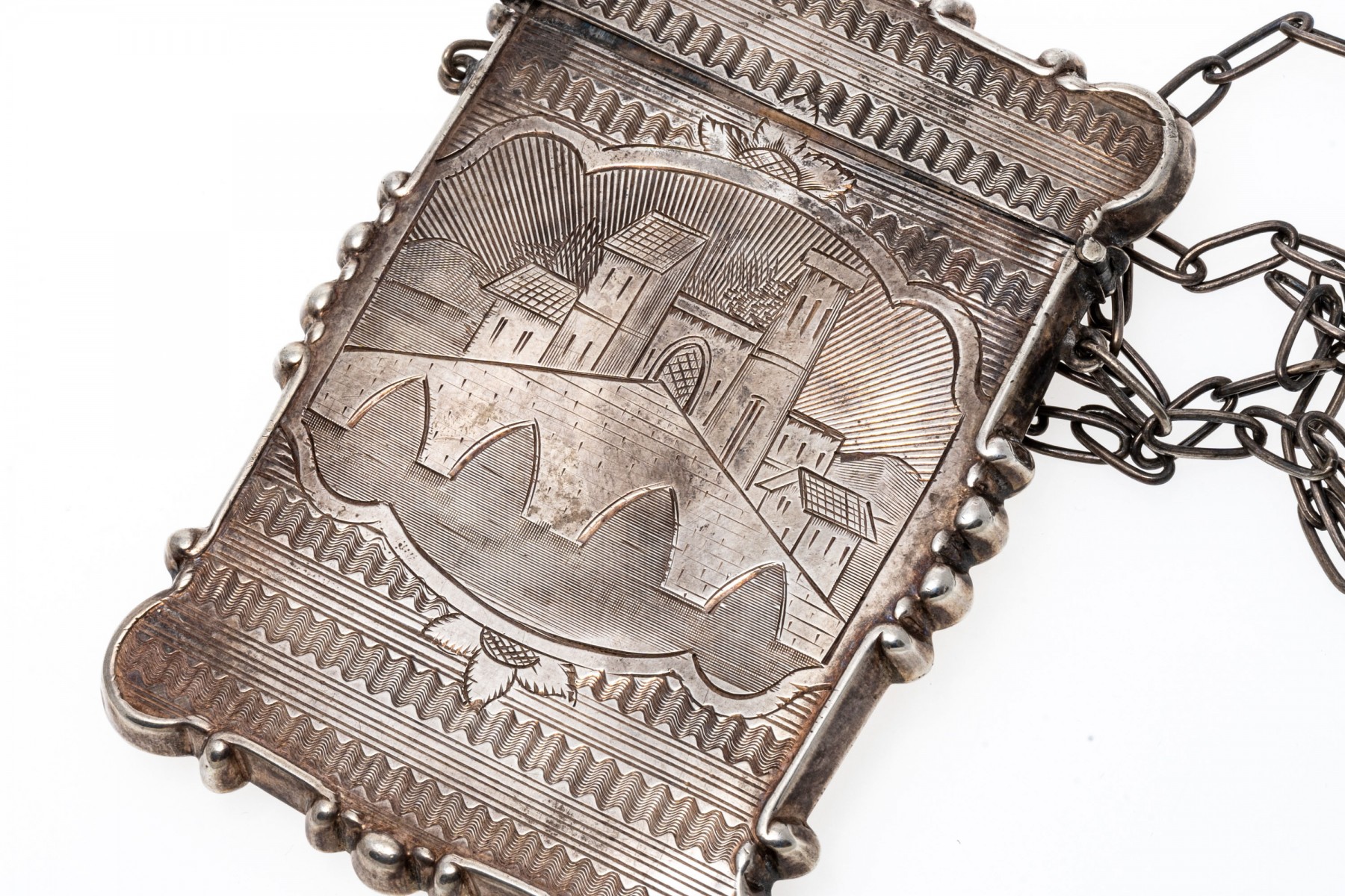 Lot of three antique sterling silver chatelaine pieces, including two card cases and one mesh change purse