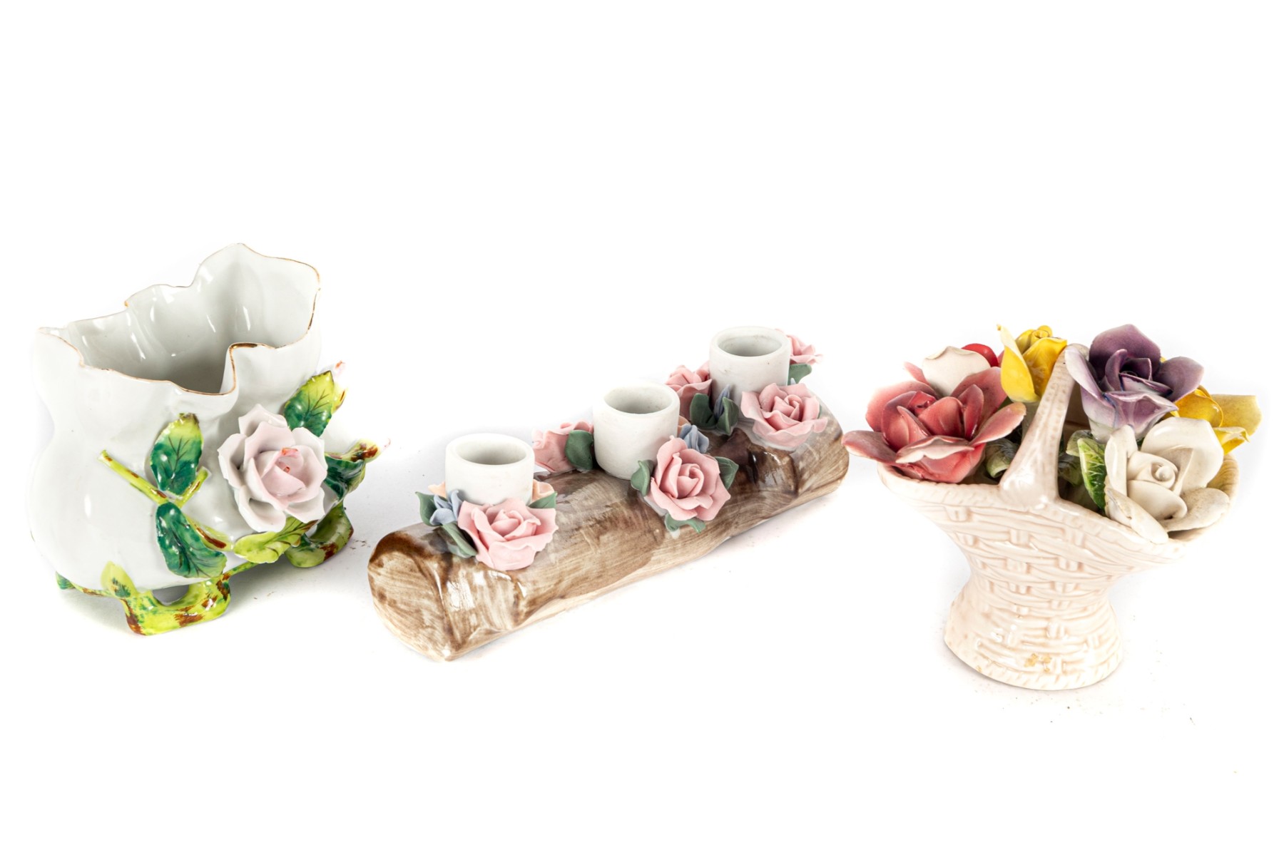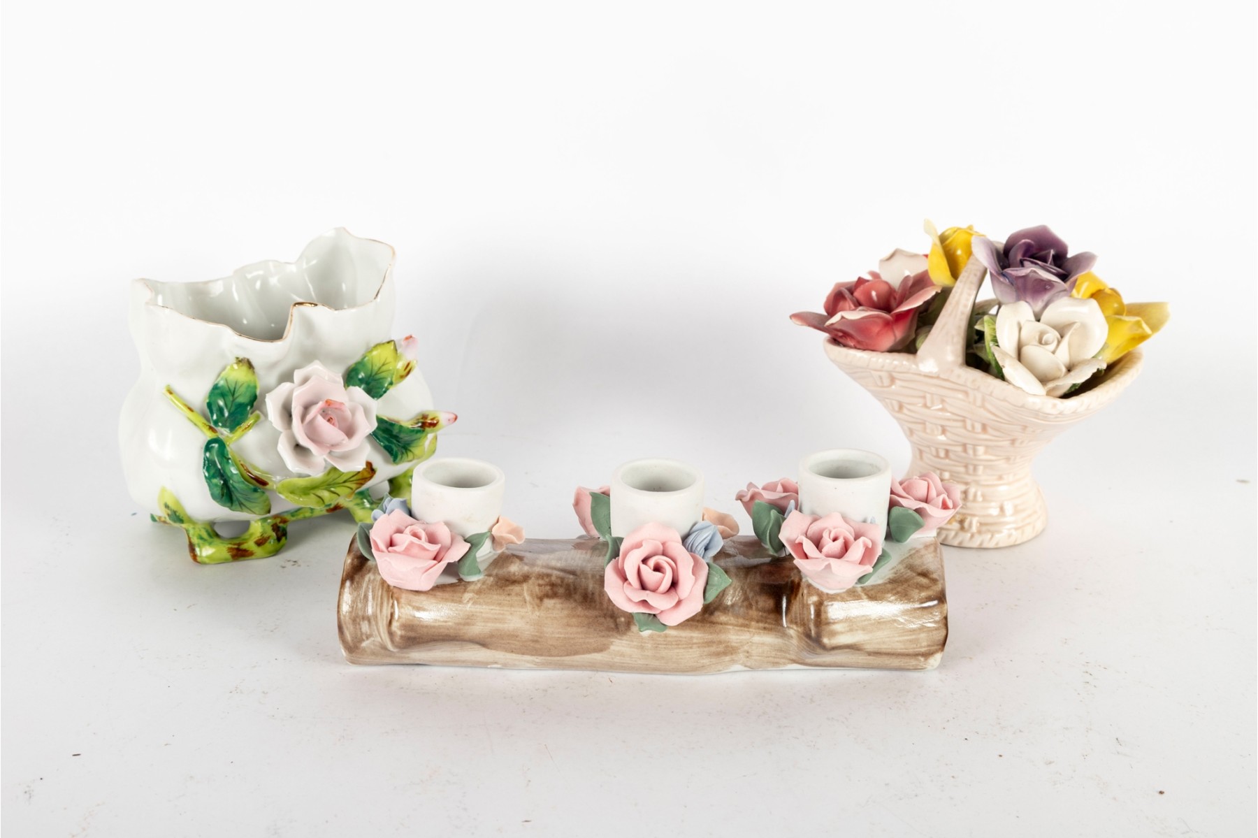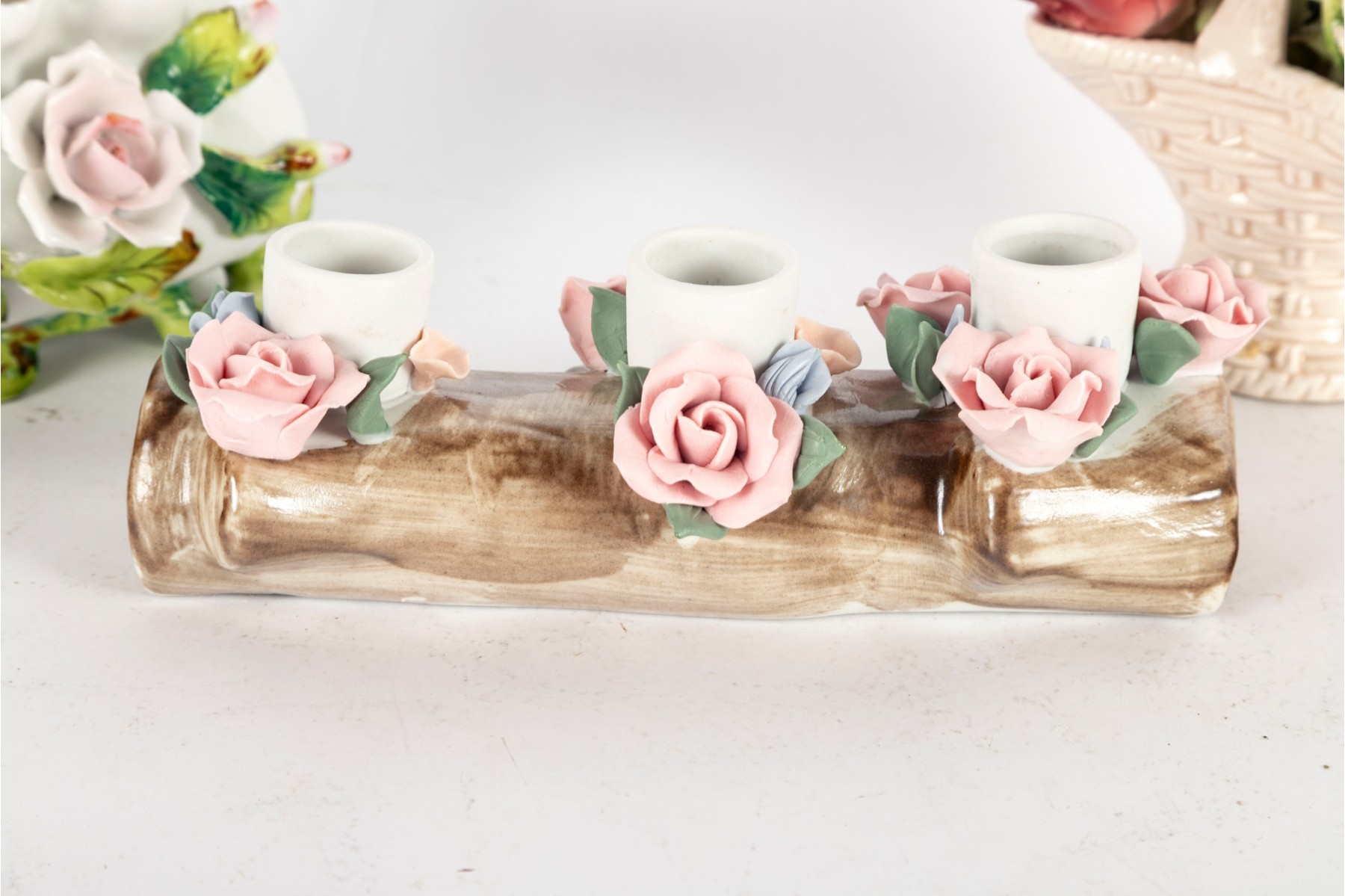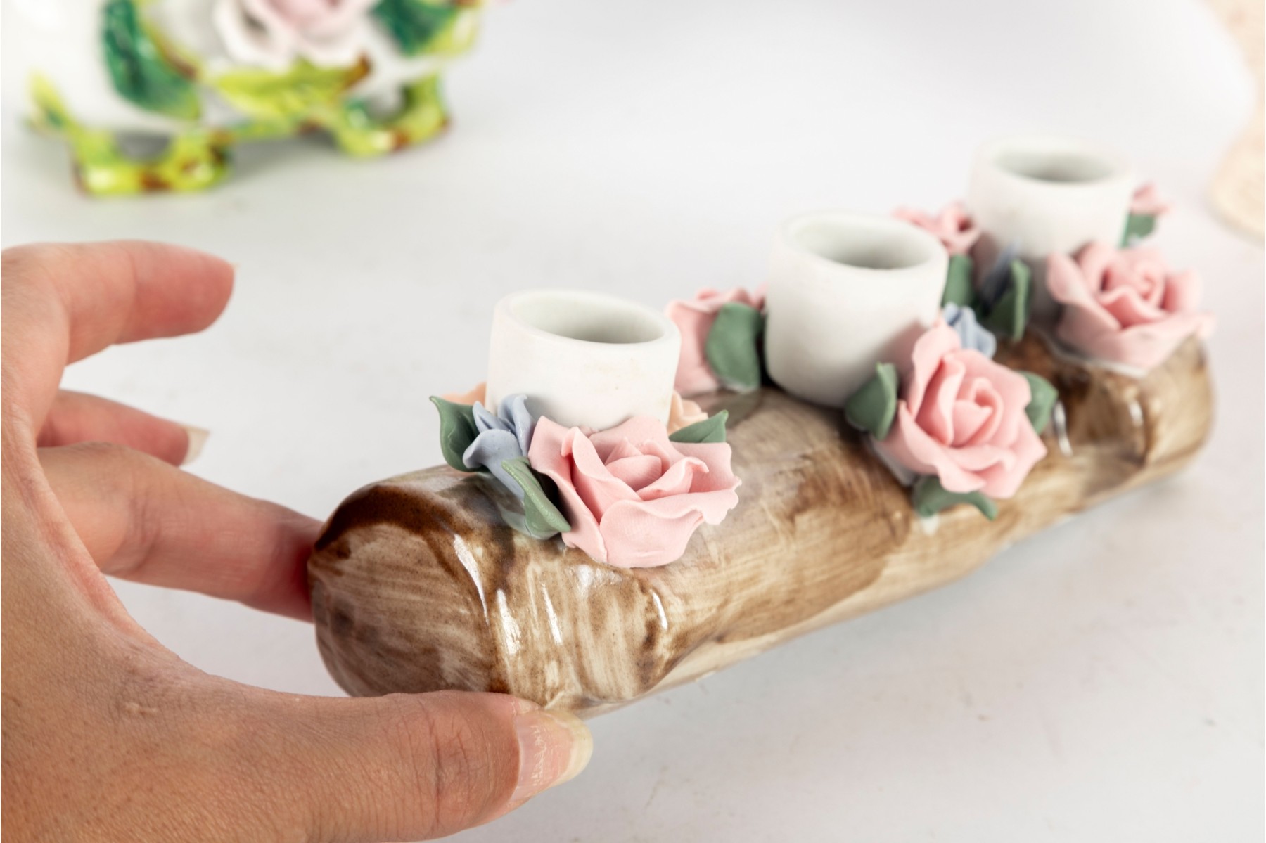 - Log-form triple bud vase or candle holder with hand-applied roses. (7" Length / 2" Depth / 2.5" Height