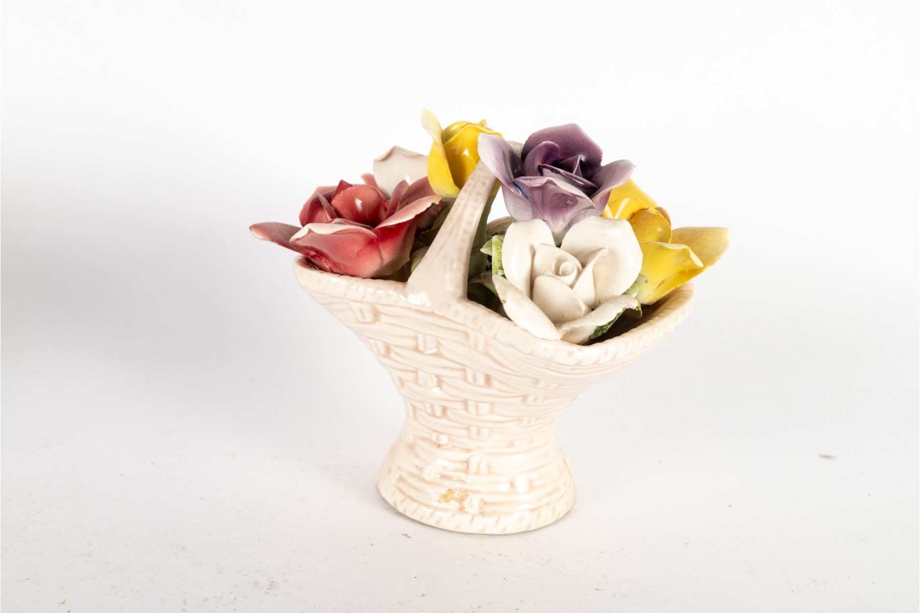- Basket-form floral arrangement with multicolored roses and foliage. (5" Length / 4" Depth / 4.5" Height)