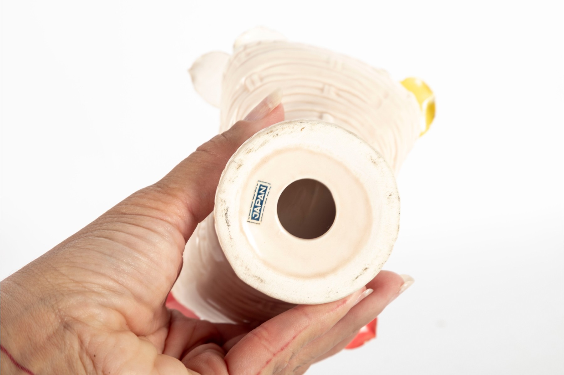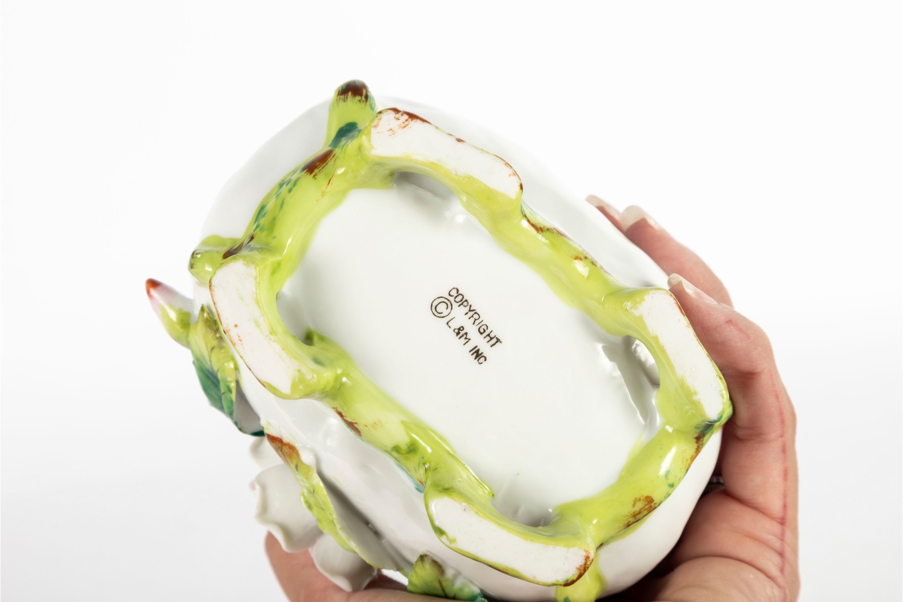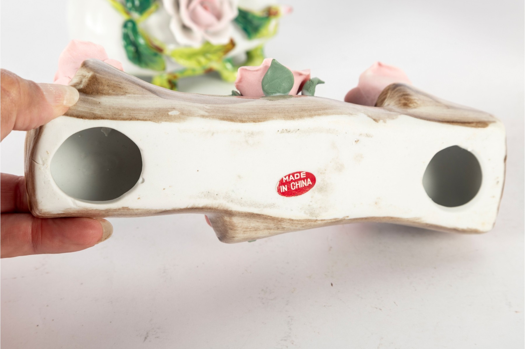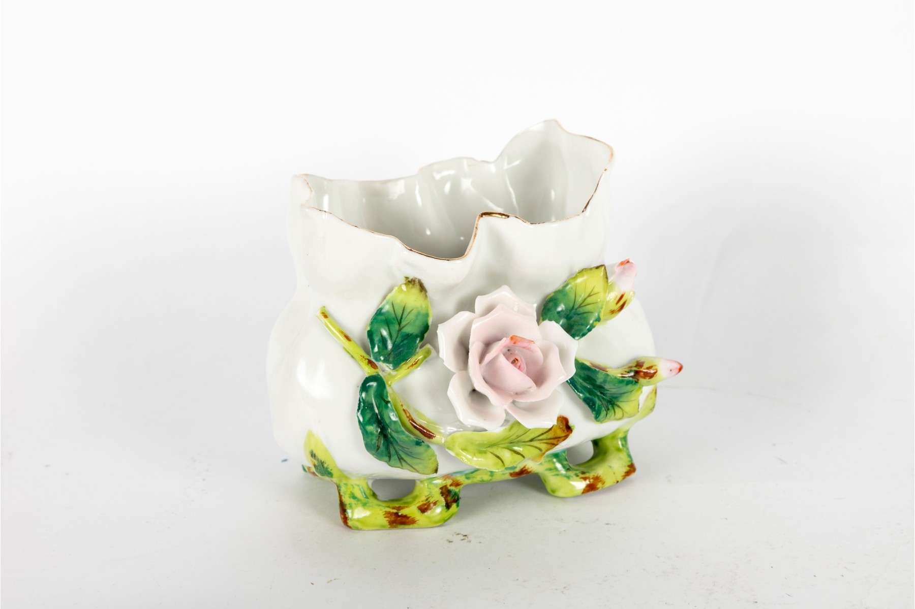 - White ruffled-edge vase with applied pink roses and green leaves. (4.5" Length / 3" Depth / 4" Height)