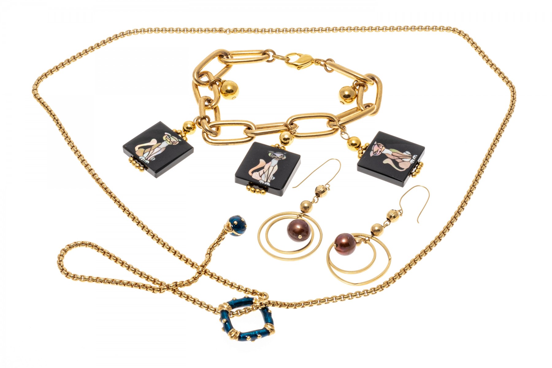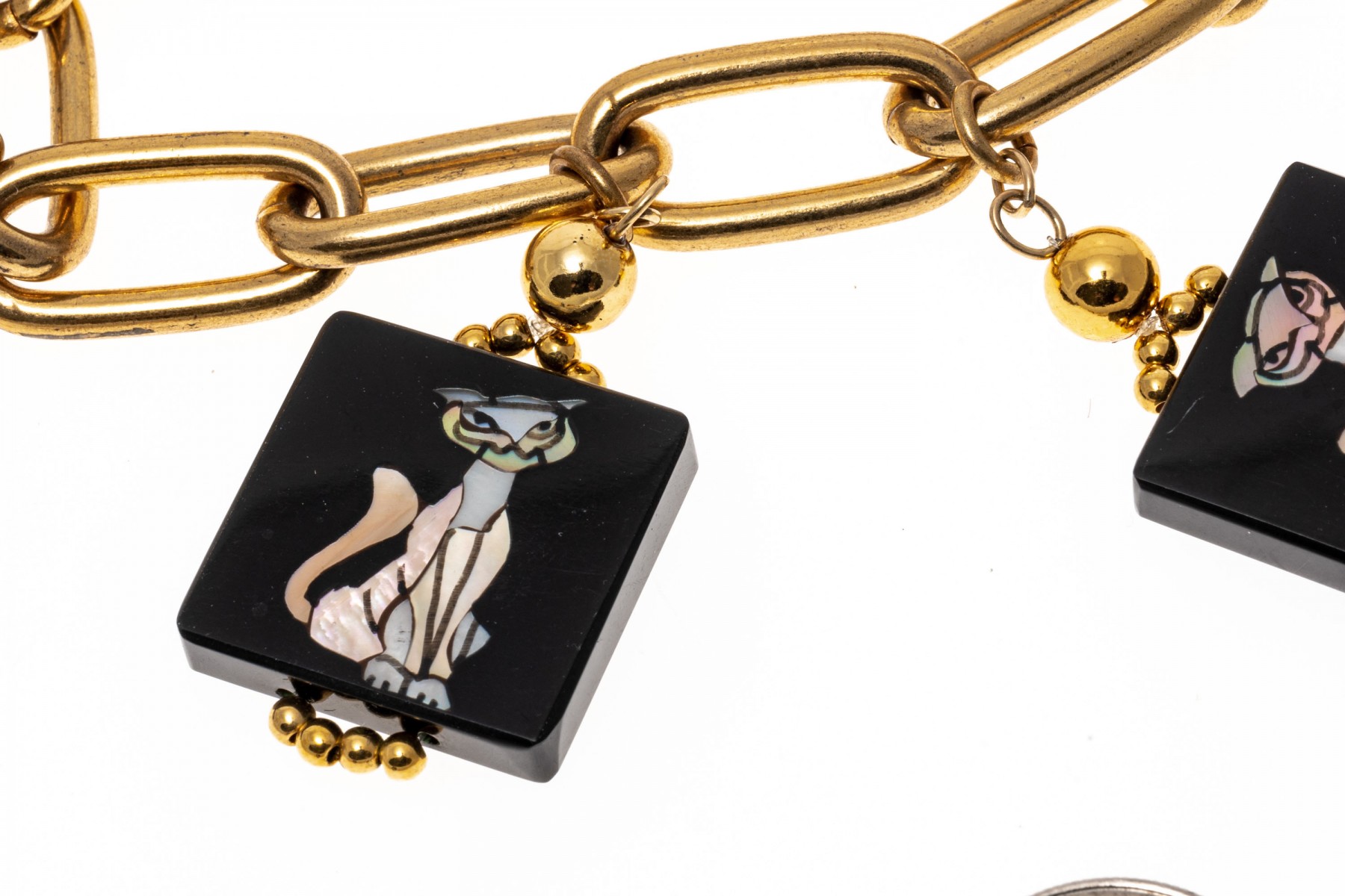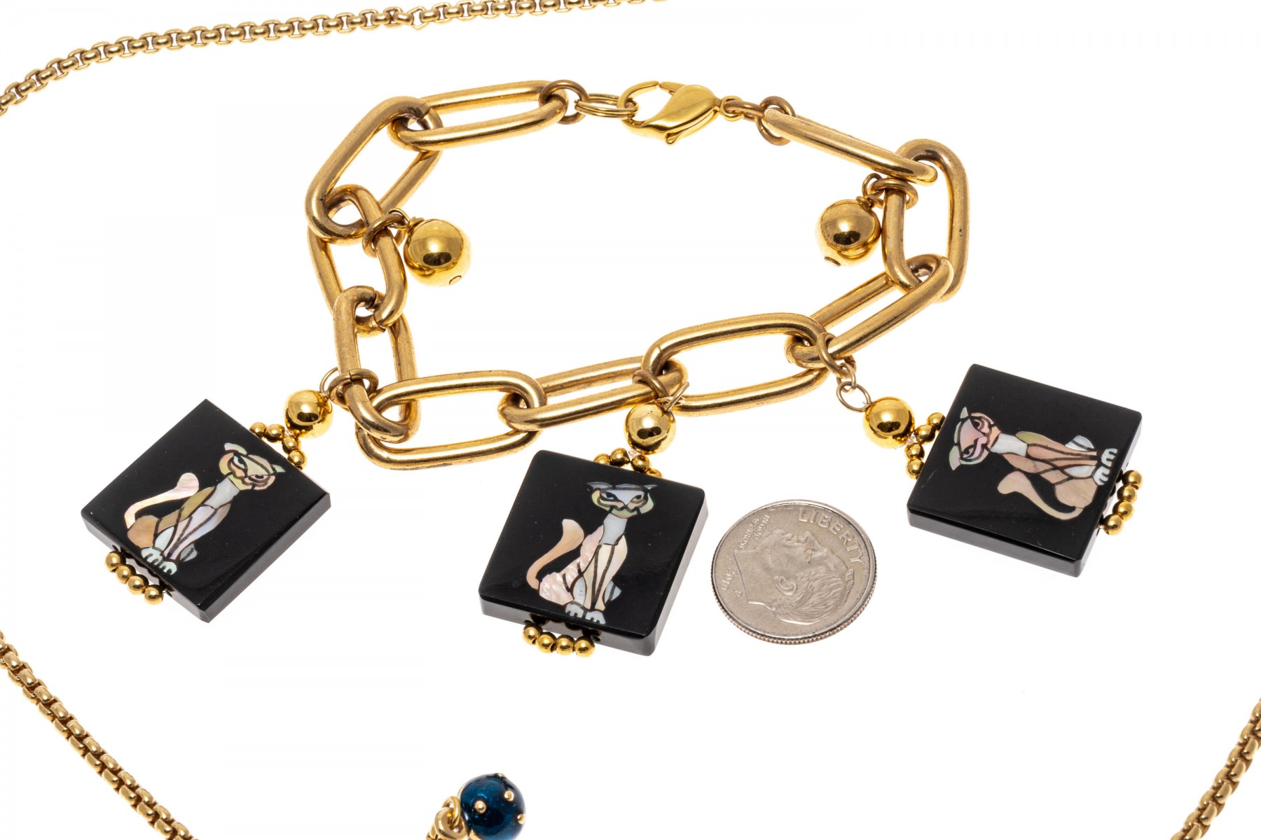 Lot of three assorted gold plated jewelry pieces, including a funky cat tile bracelet