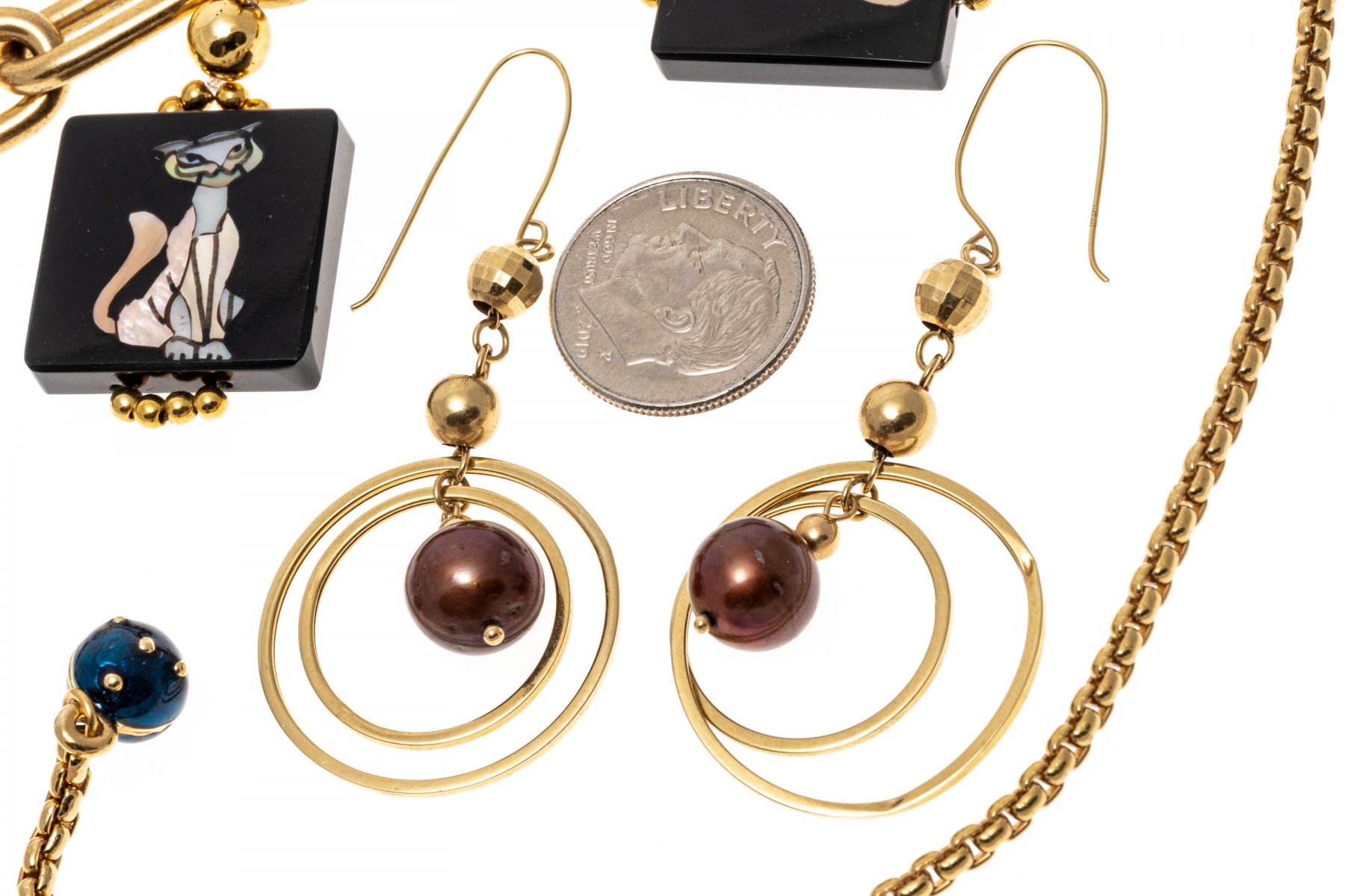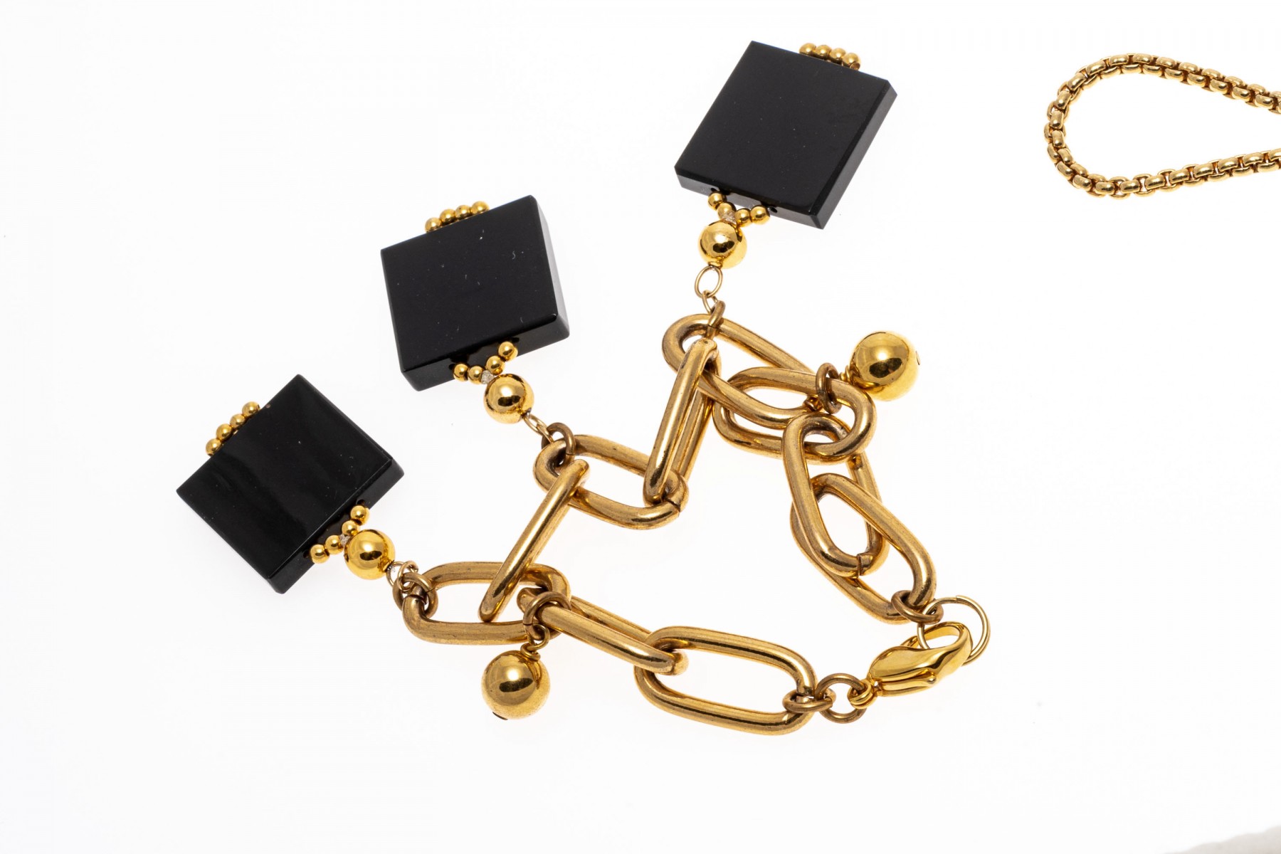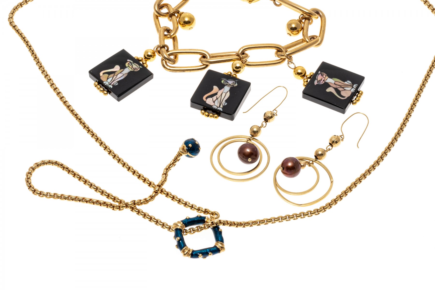Lot of three assorted gold plated jewelry pieces, including a funky cat tile bracelet