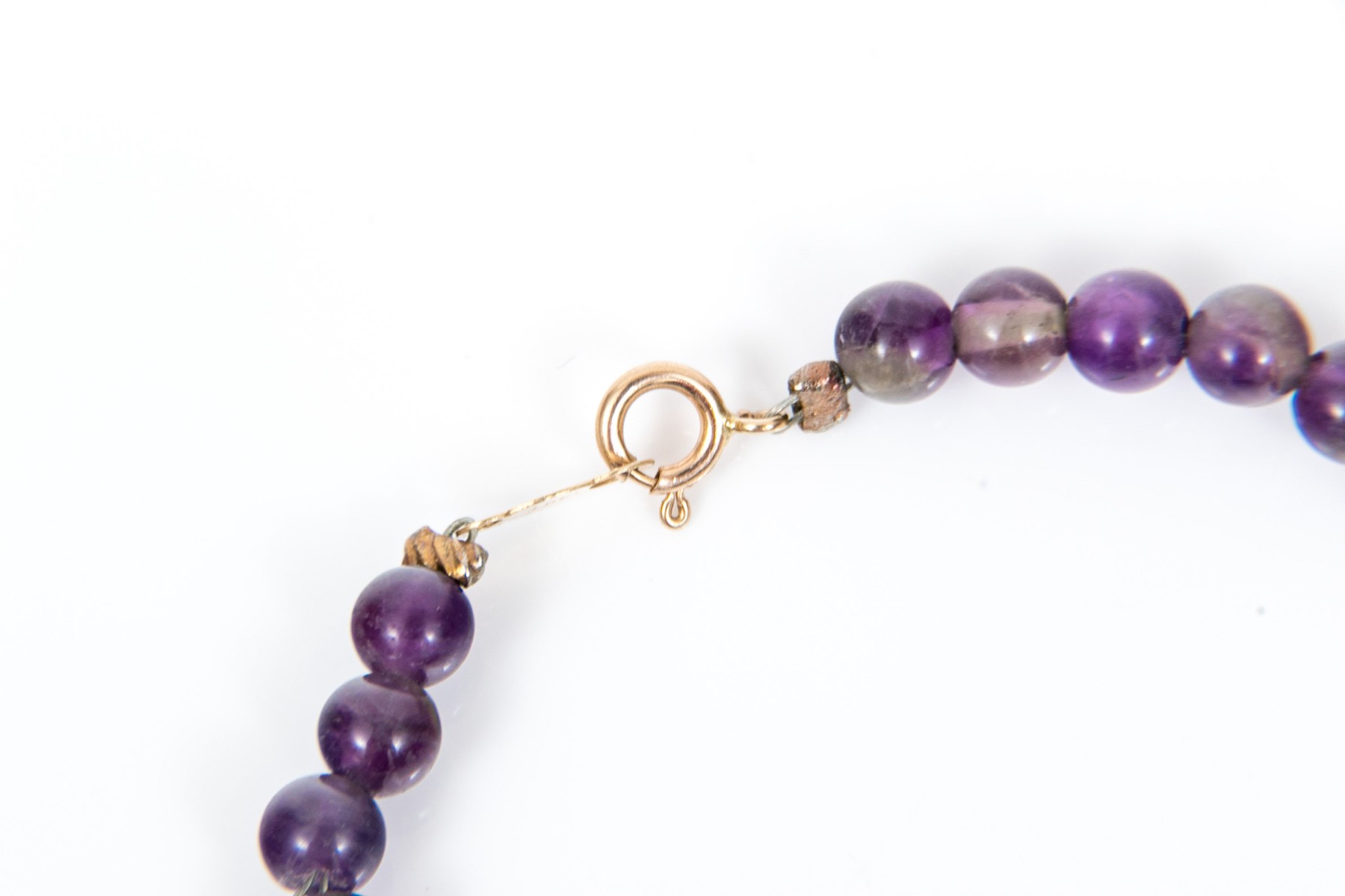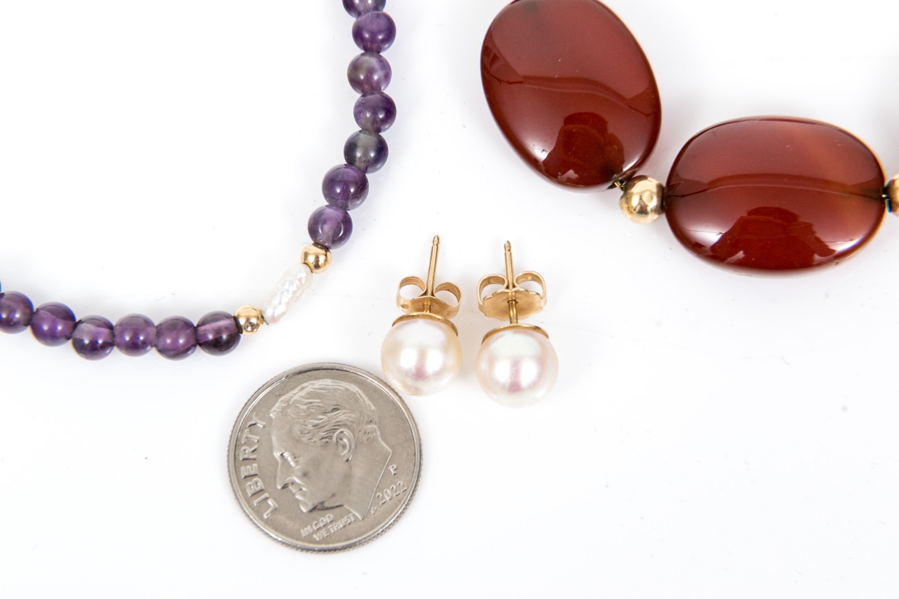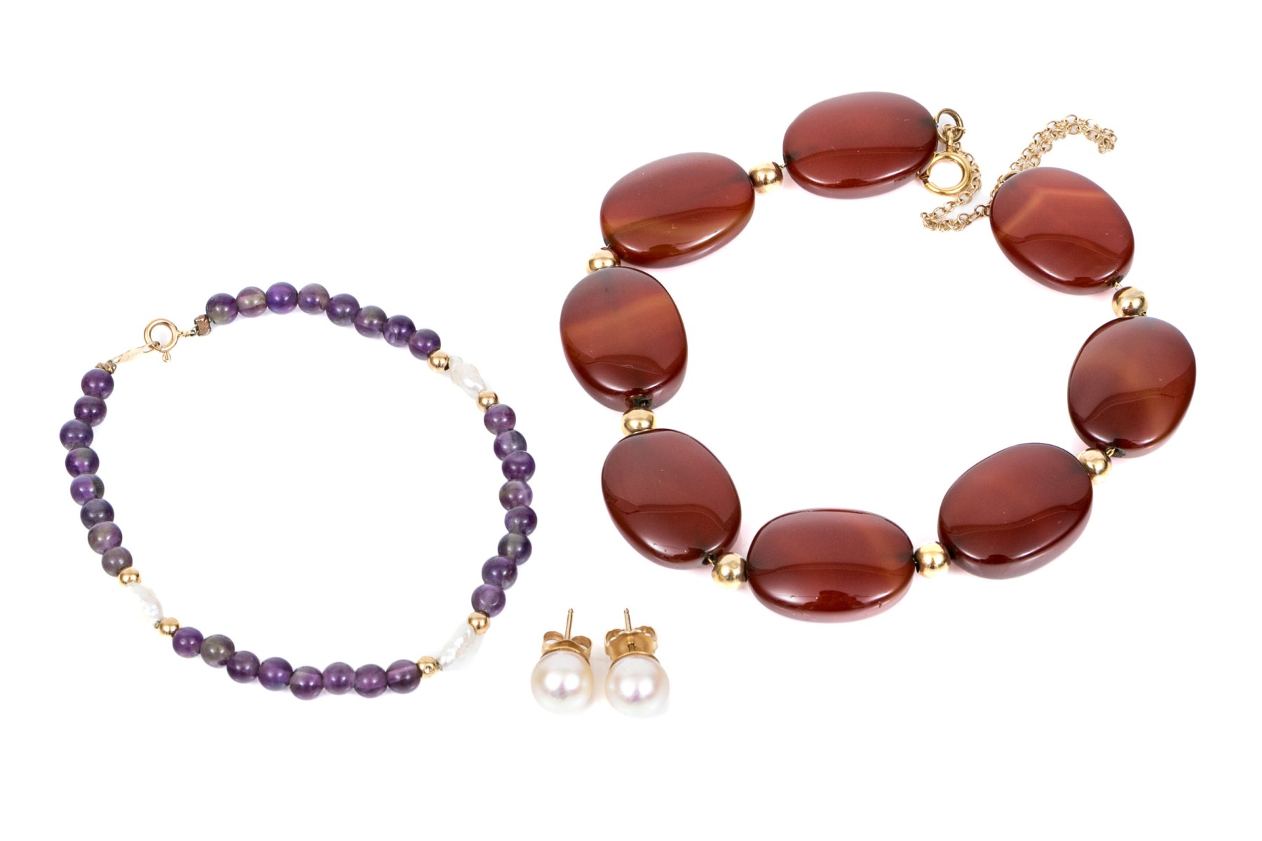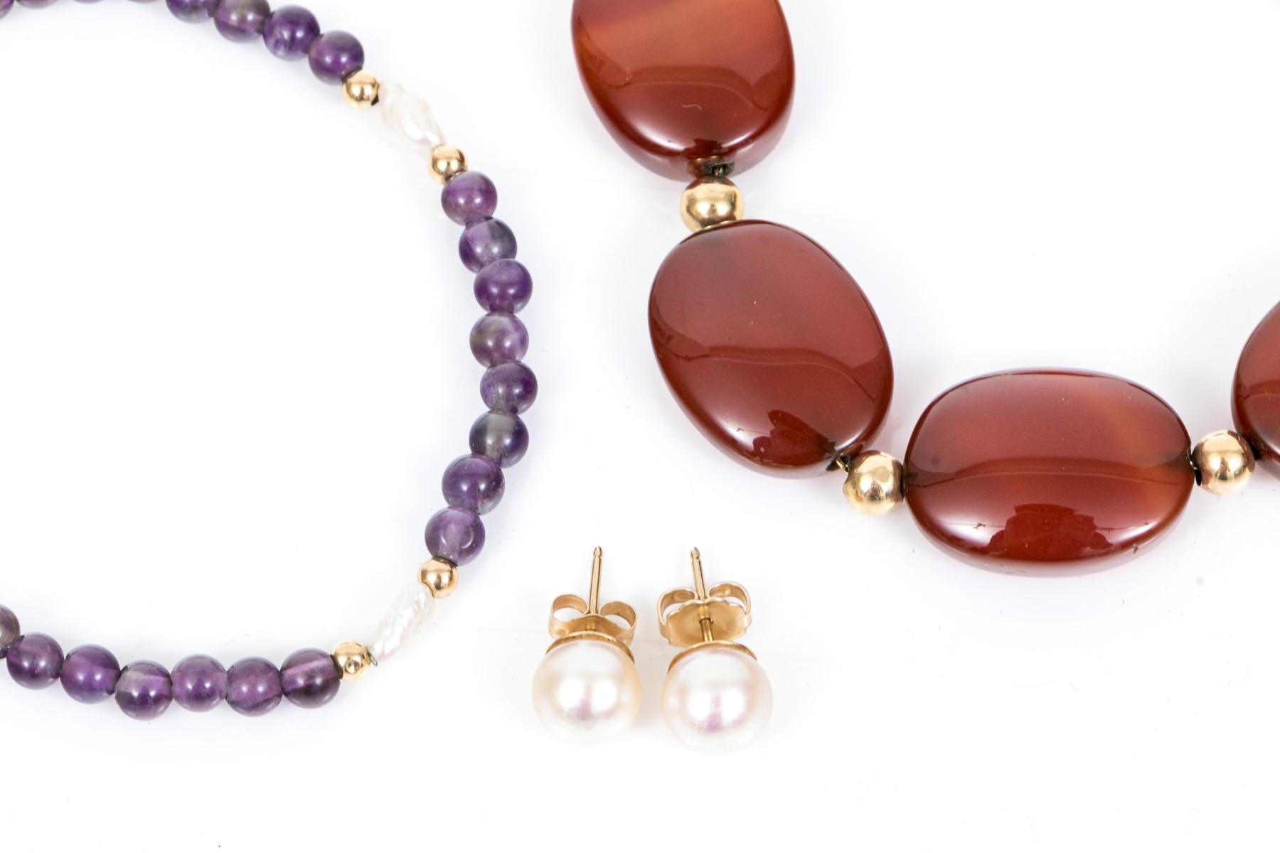 Lot of three beaded or cultured pearl jewelry pieces, including stud earrings, amethyst and cultured freshwater pearl bracelet and carnelian bracelet