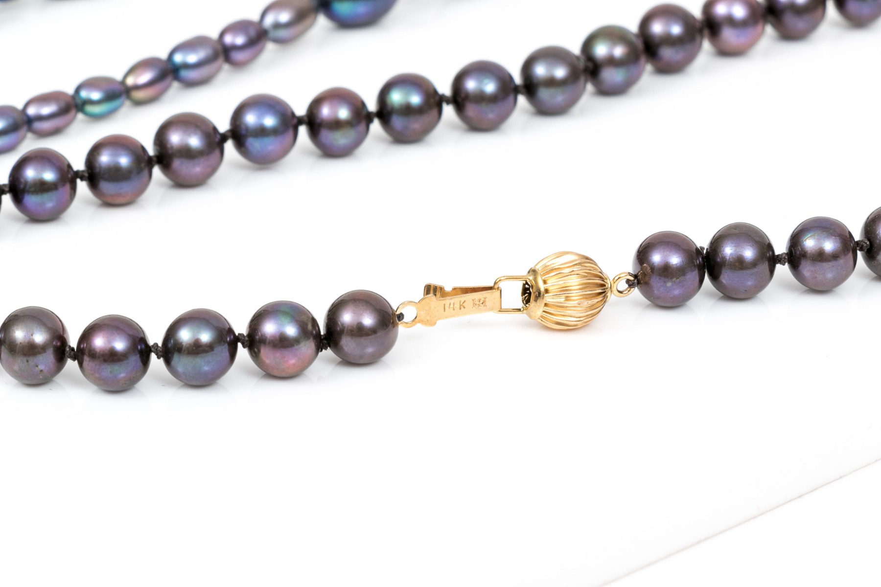 Lot of three black and grey tone cultured freshwater pearl necklaces, including rope and princess length with a 14k clasp