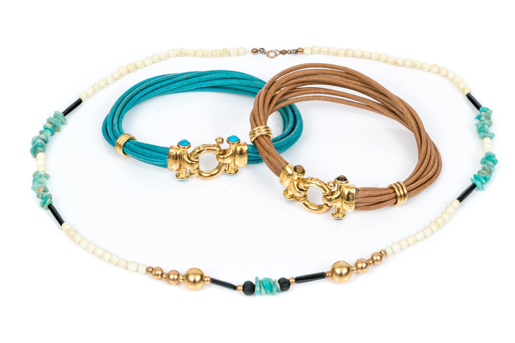 Lot of three blue and tan jewelry pieces, including two cord bracelets and a beaded necklace