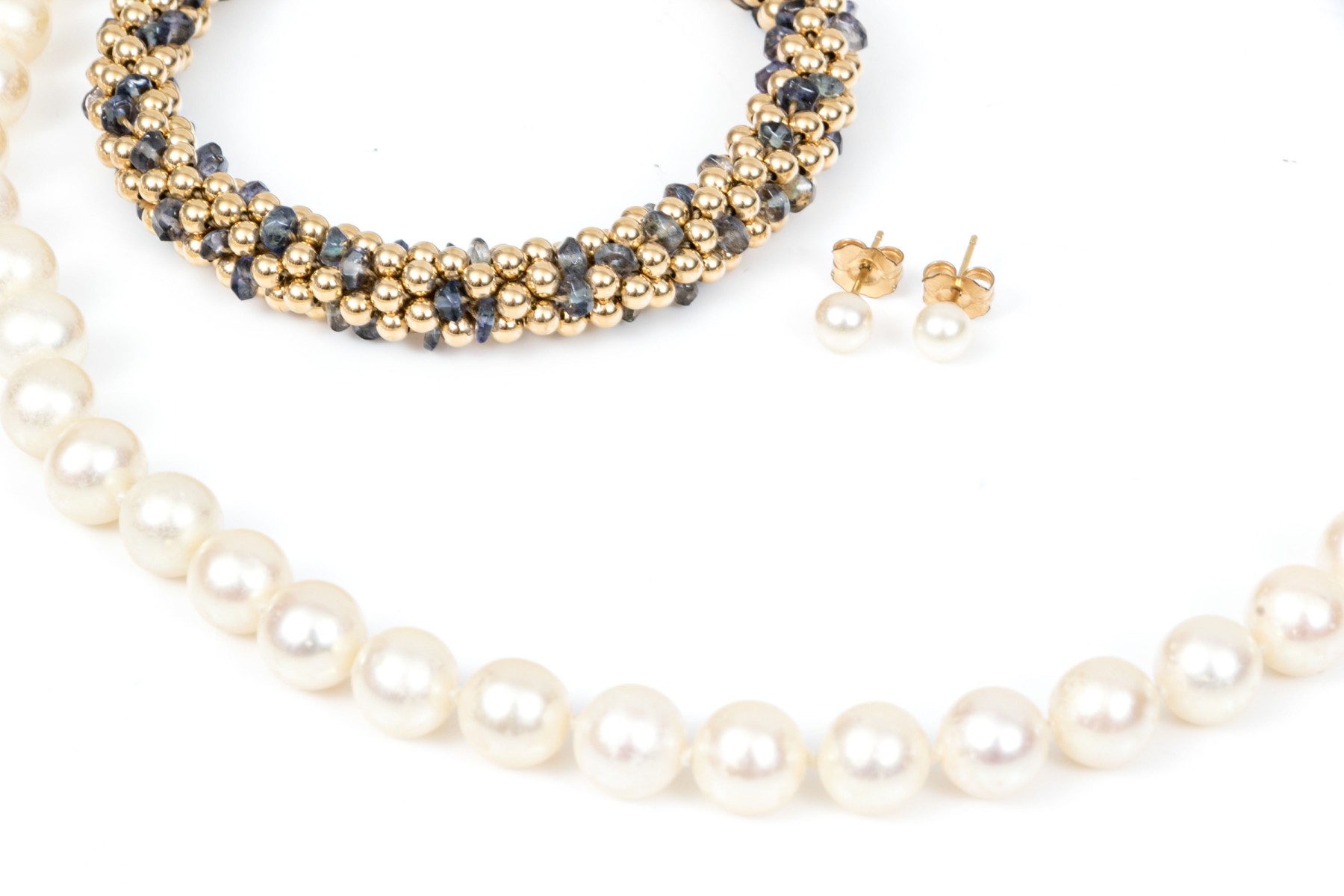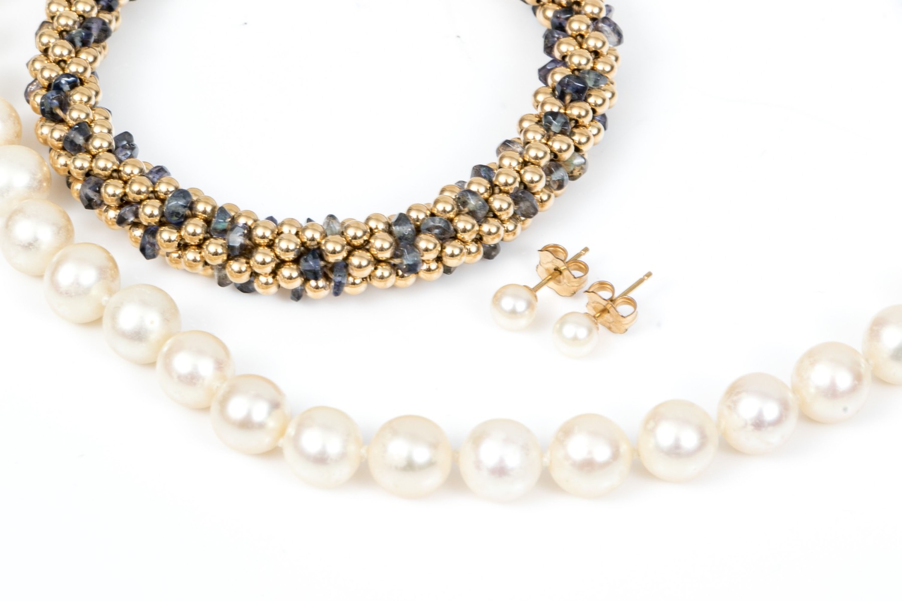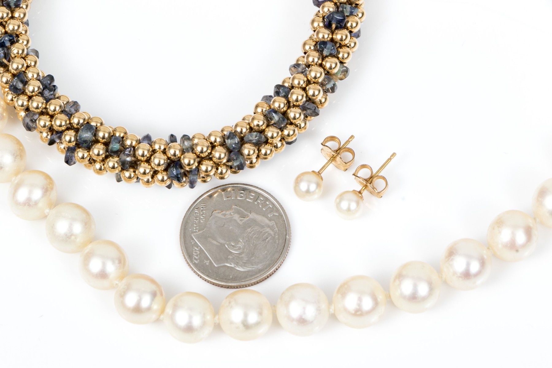 Lot of 1three assorted jewelry pieces, including 14k yellow gold cultured pearl stud earrings, blue purple tumbled bead bracelet and a bead necklace with a 14k yellow gold clasp. The pearl stud earrings are 14k, the clutches are gold filled