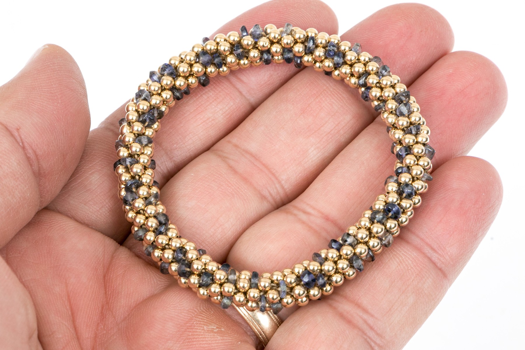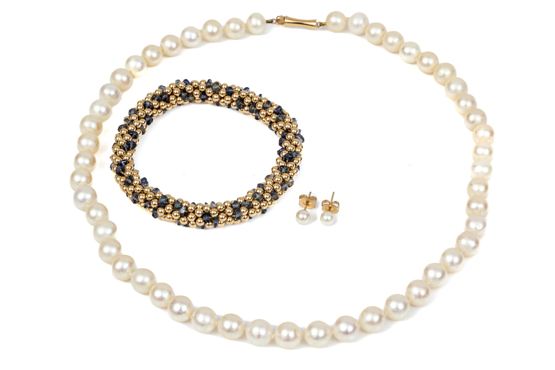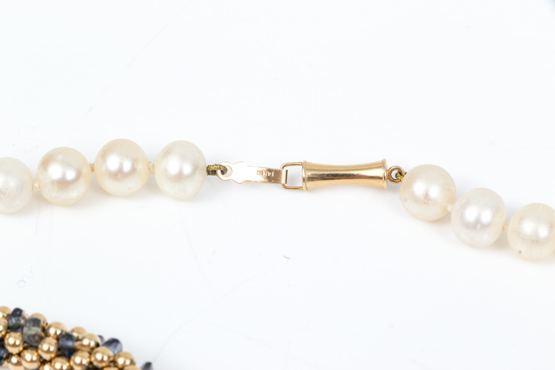 Lot of 1three assorted jewelry pieces, including 14k yellow gold cultured pearl stud earrings, blue purple tumbled bead bracelet and a bead necklace with a 14k yellow gold clasp. The pearl stud earrings are 14k, the clutches are gold filled