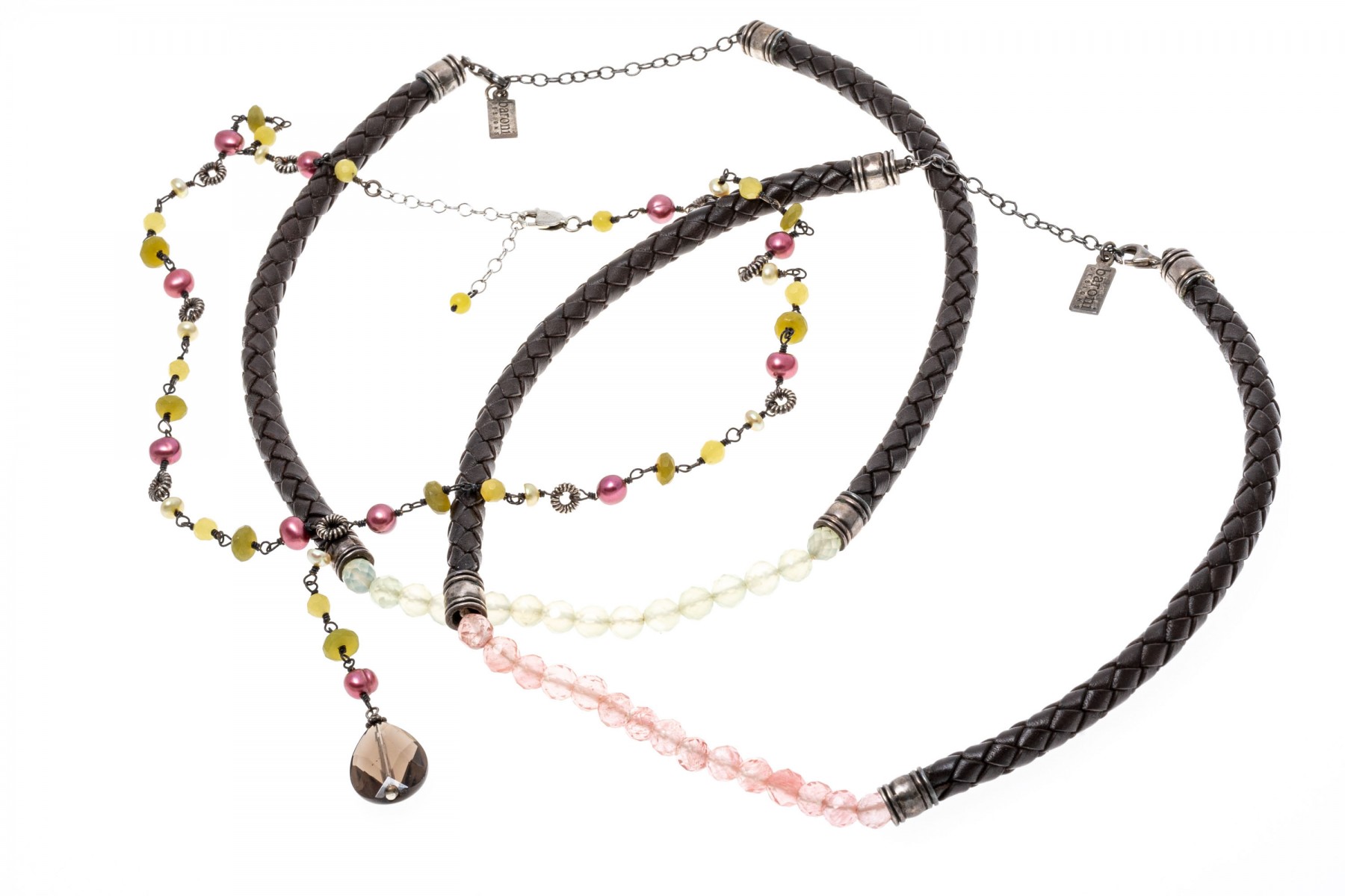 Lot of three pretty pink and green motif bead and woven leather necklaces