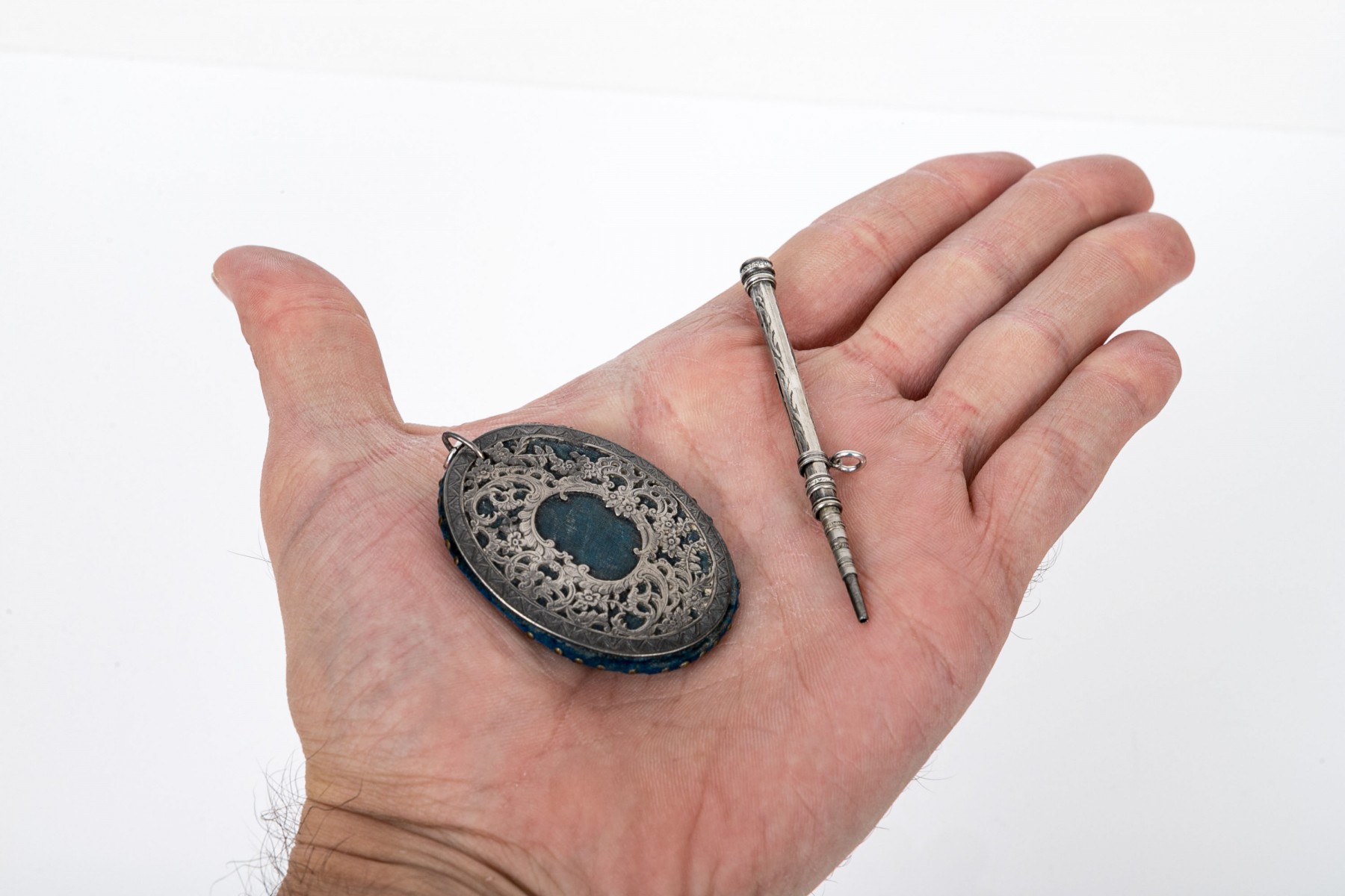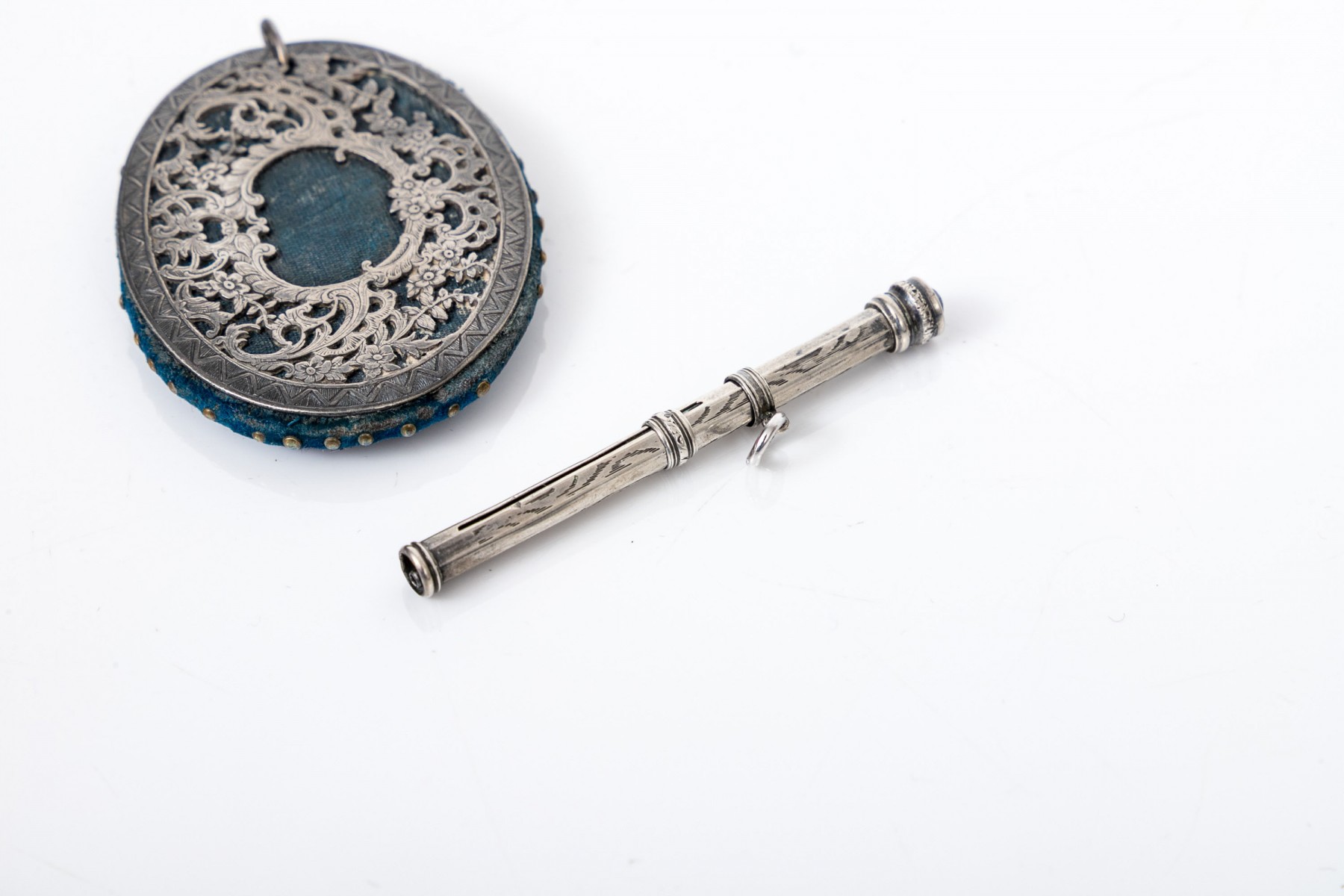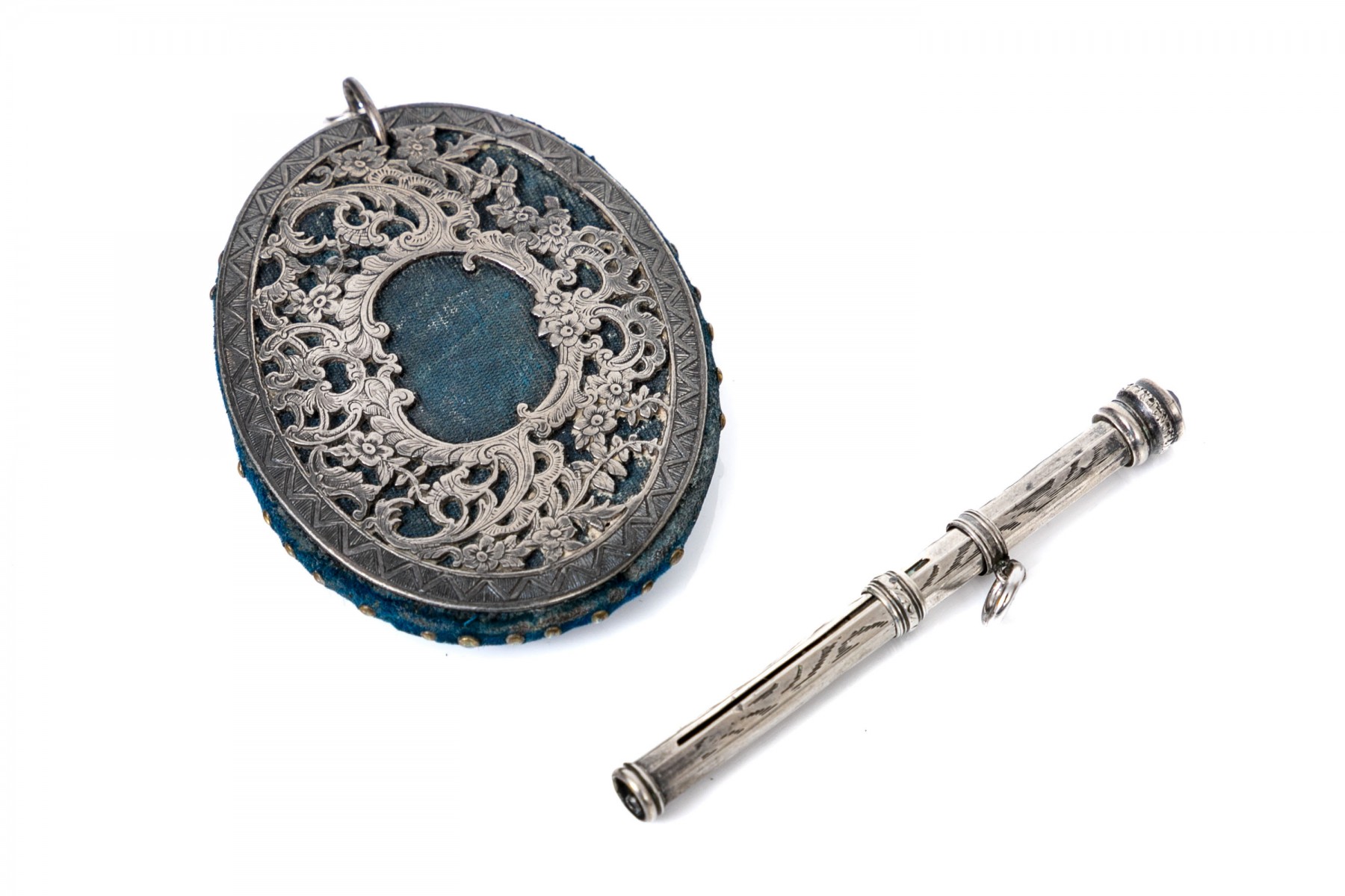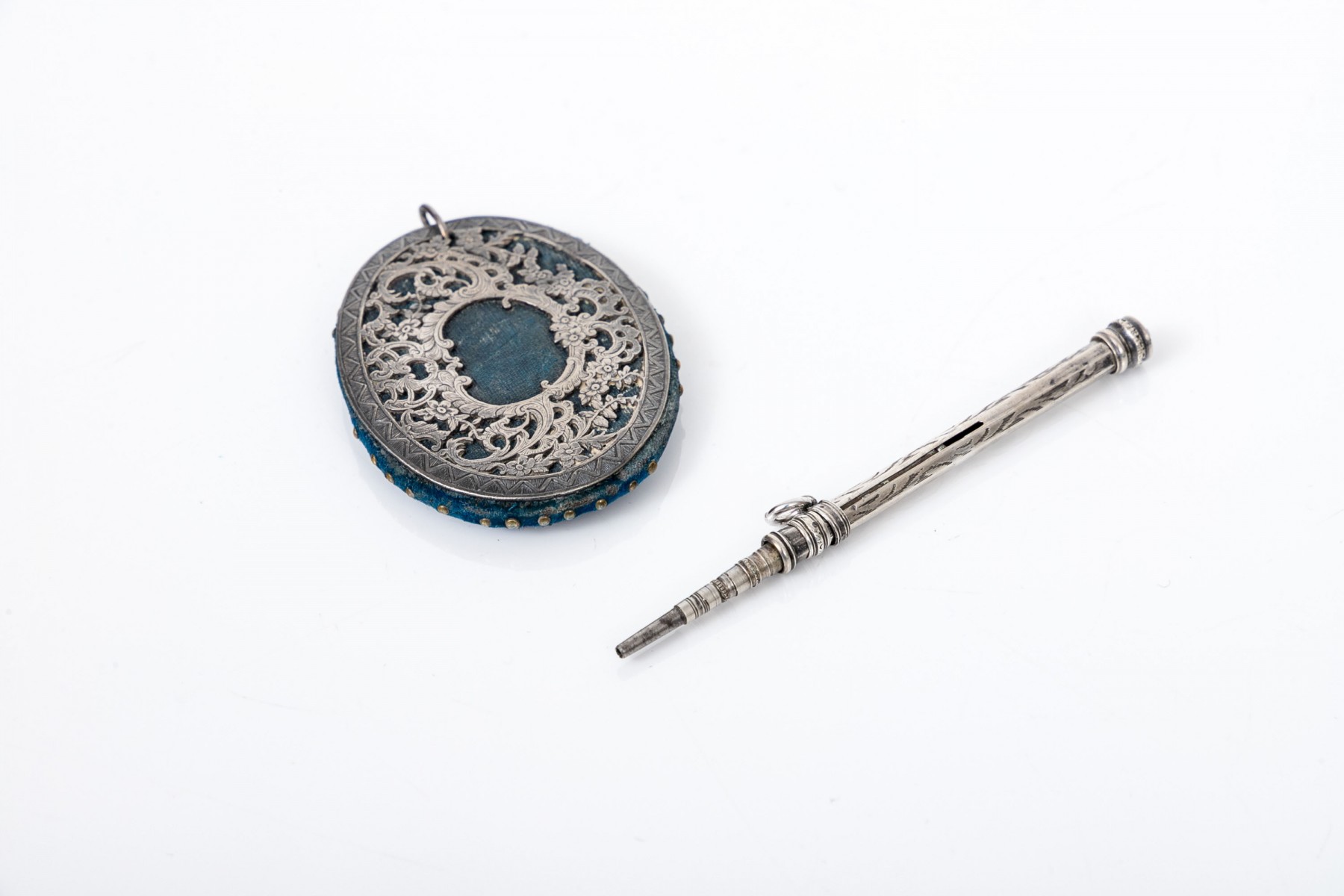 Lot of two antique chatelaine items including a sterling retractable pencil (no lead) and a pin cushion