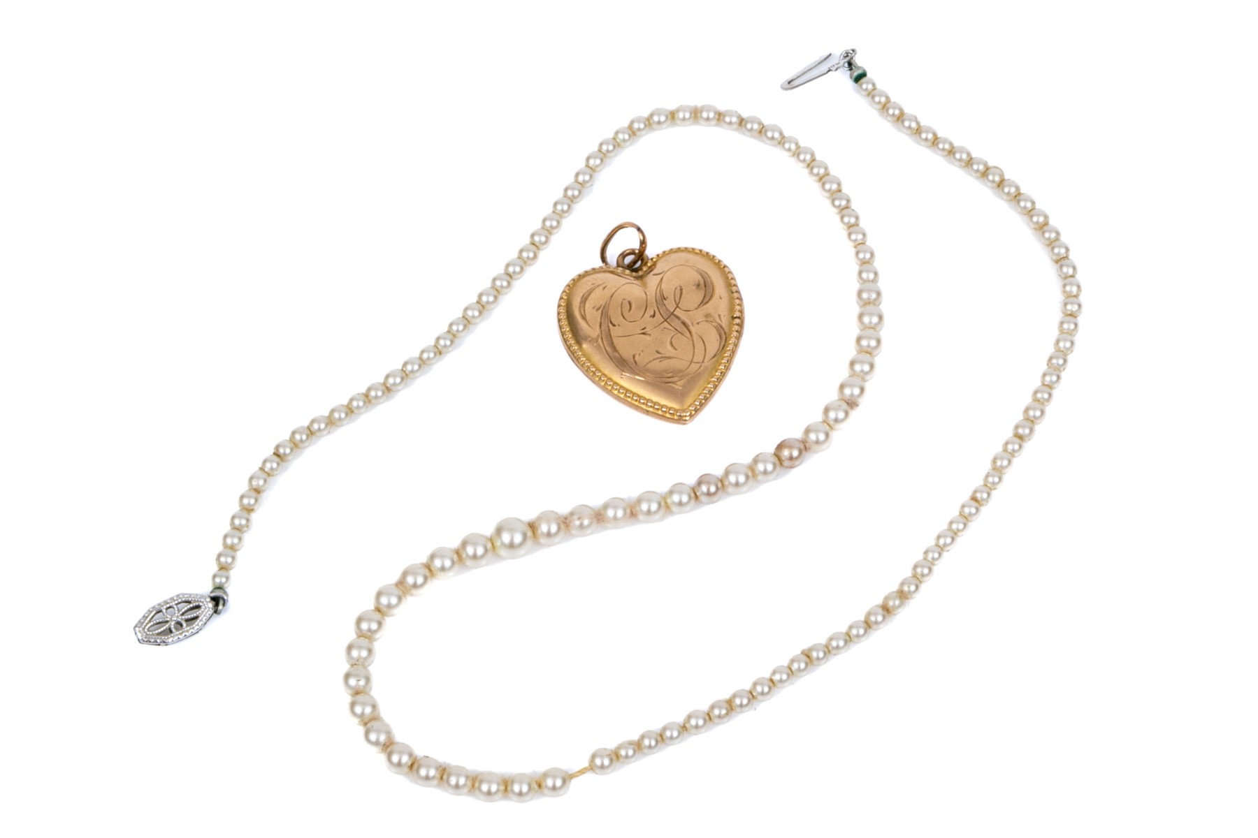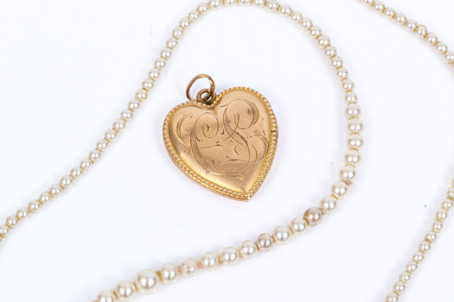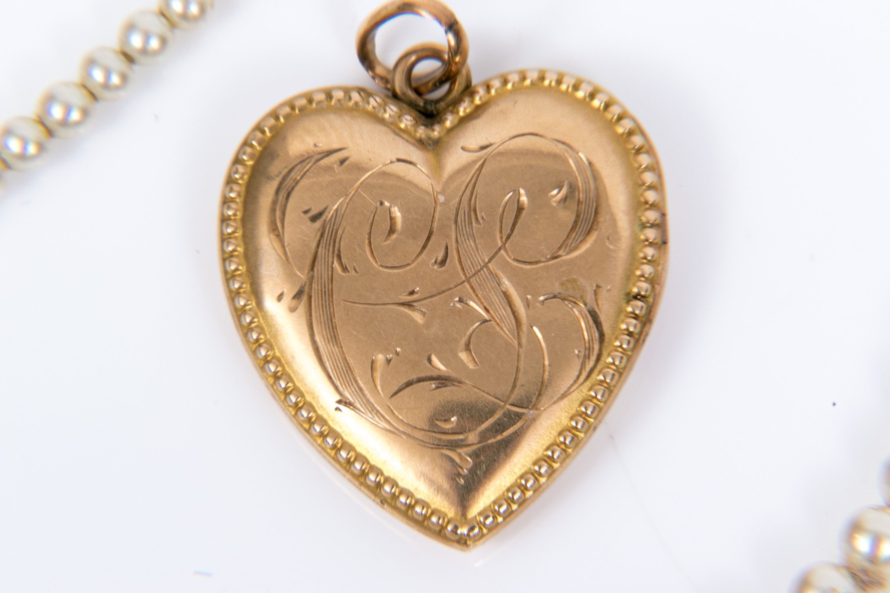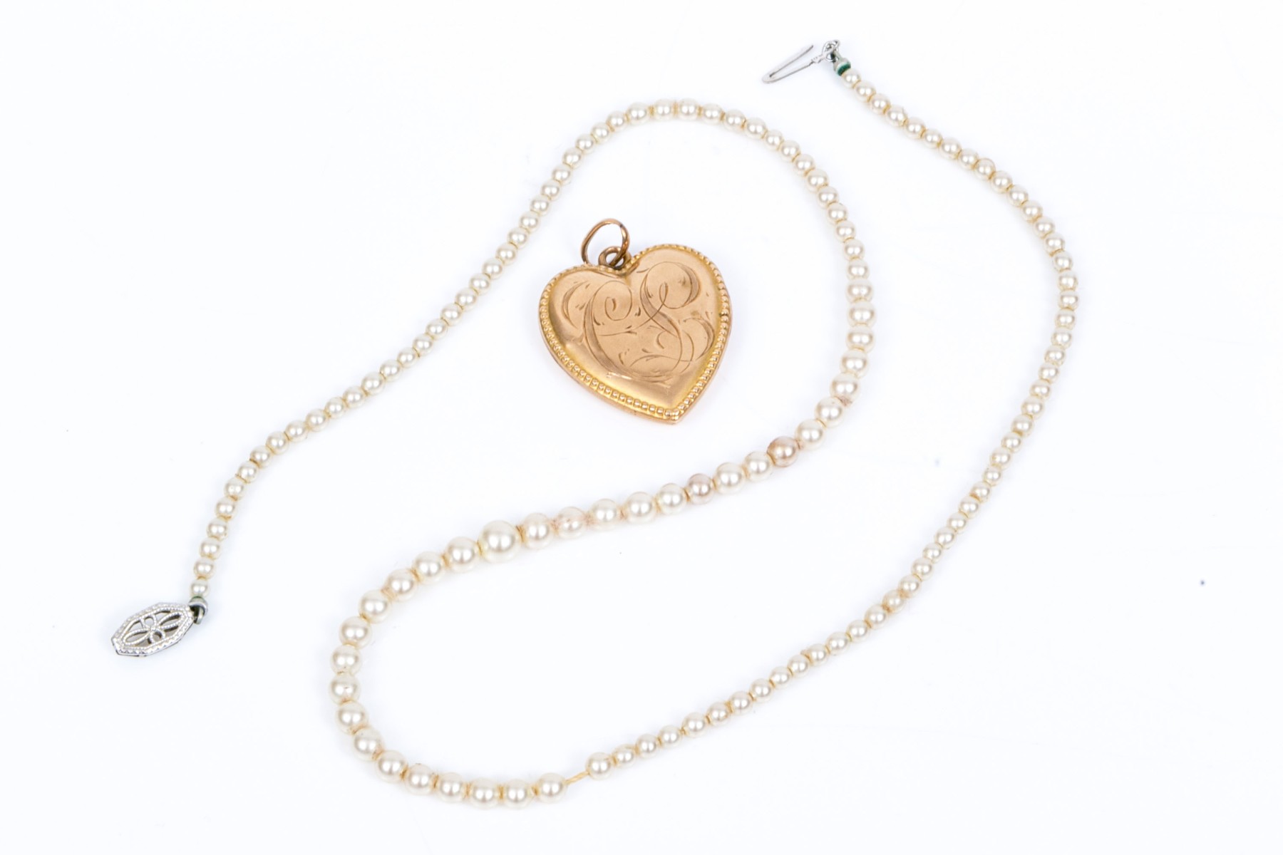 Lot of two assorted 10k jewelry pieces, including a locket and a faux pearl strand