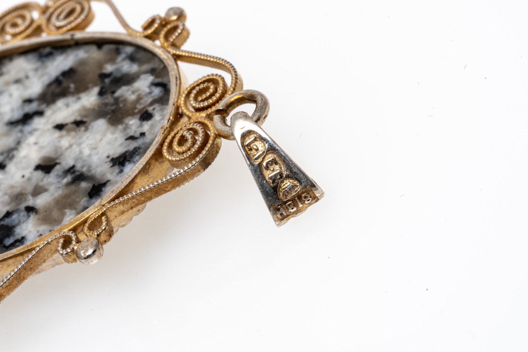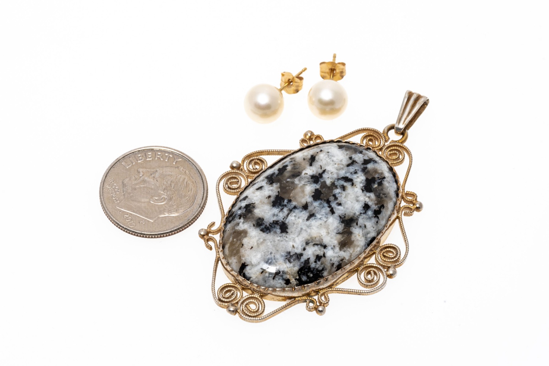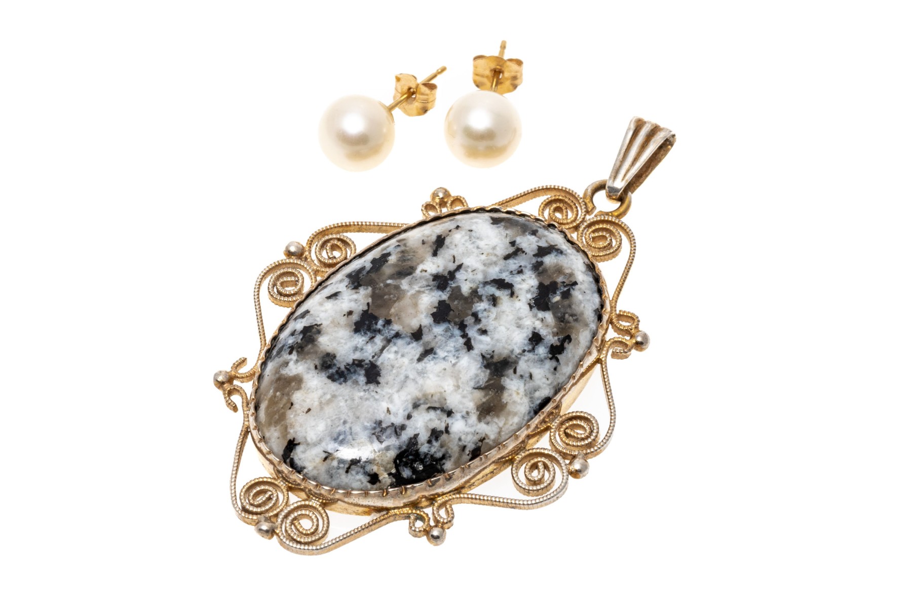 Lot of two jewelry pieces including a pair of 14k cultured pearl earrings and 813 silver scrolled pendant. The earrings are finished by posts and clutch style backs