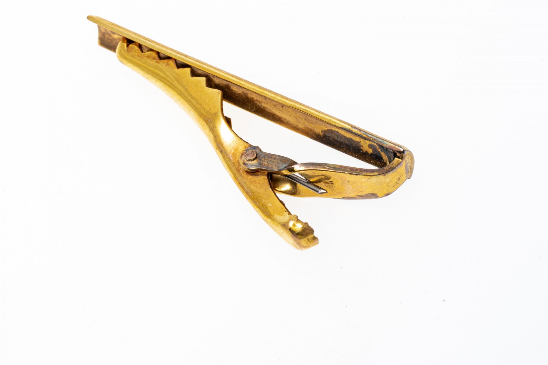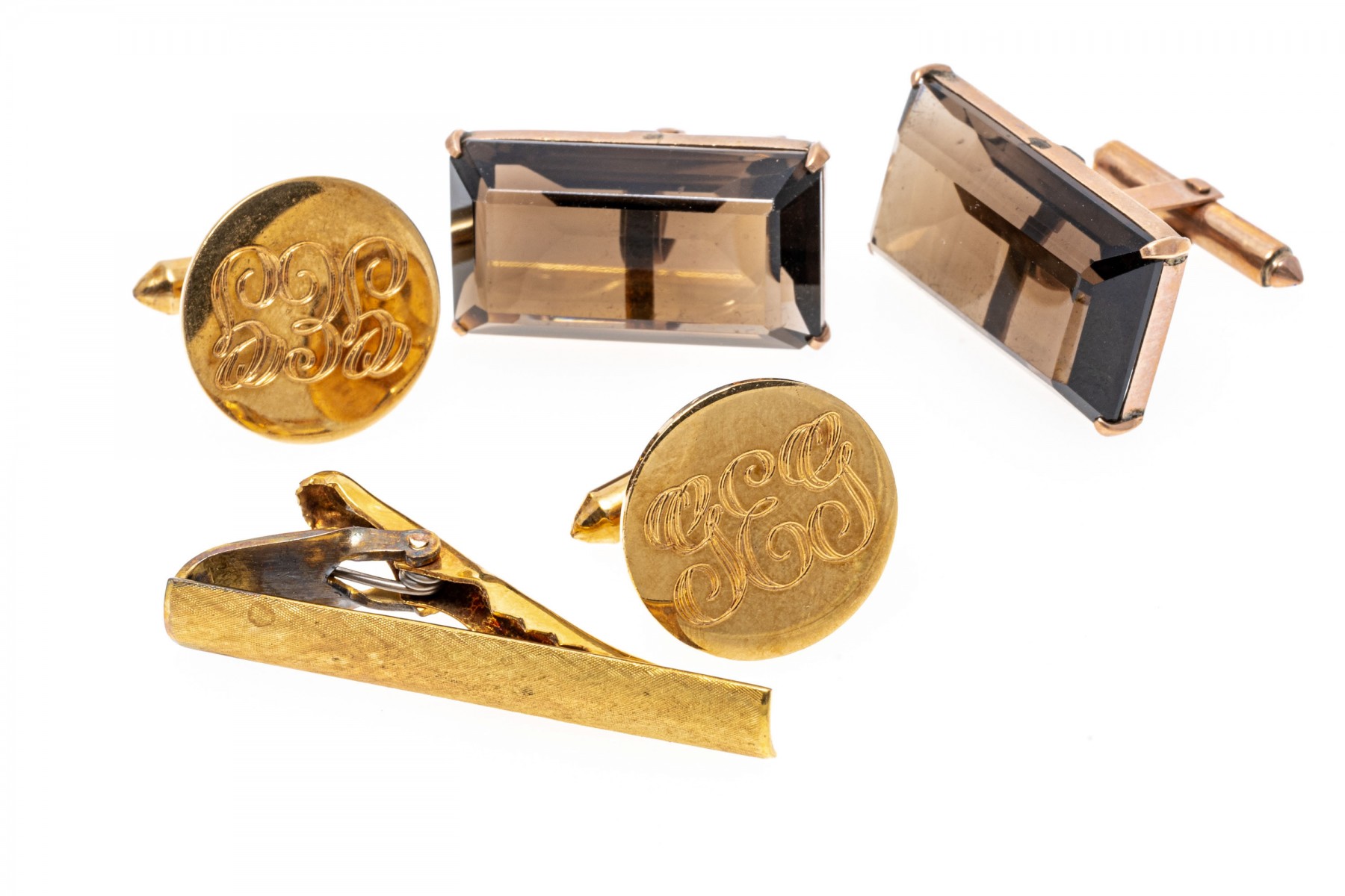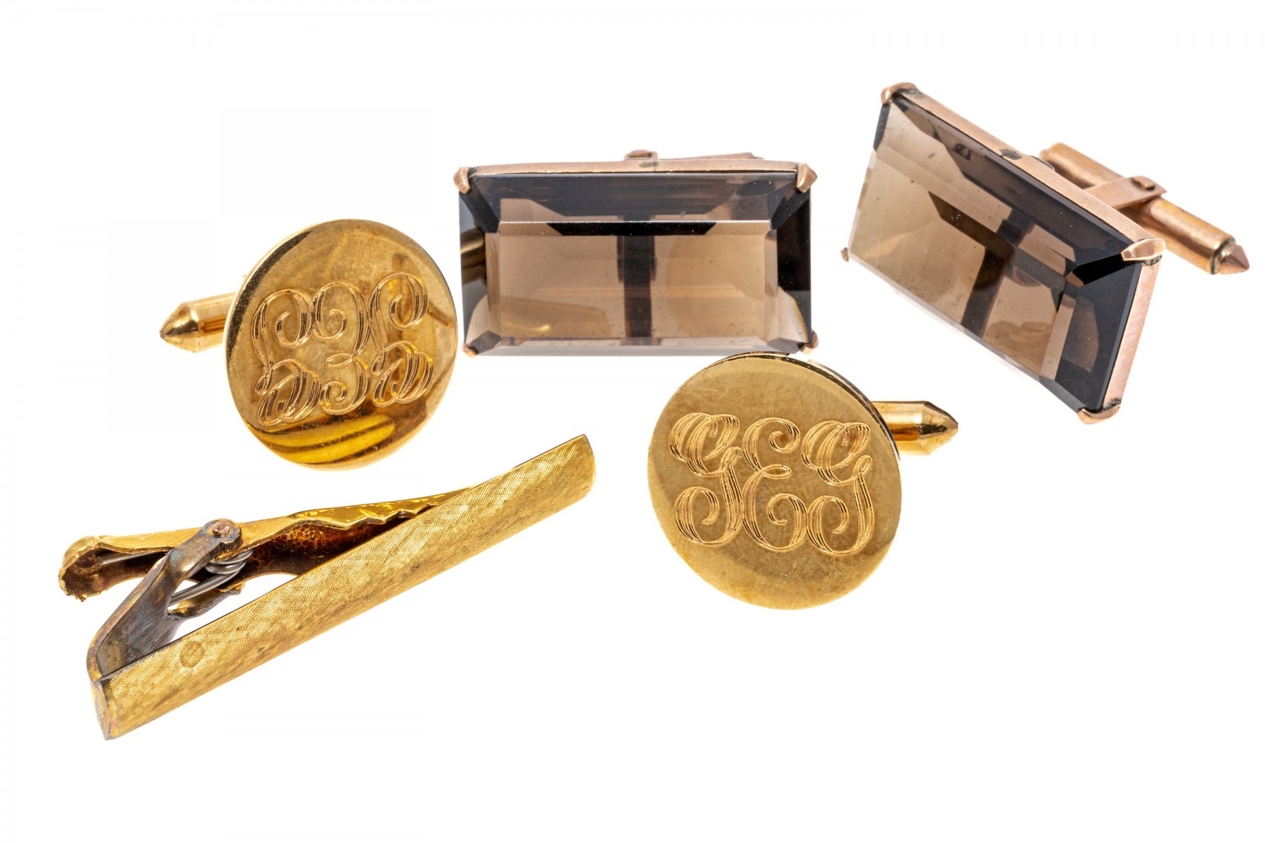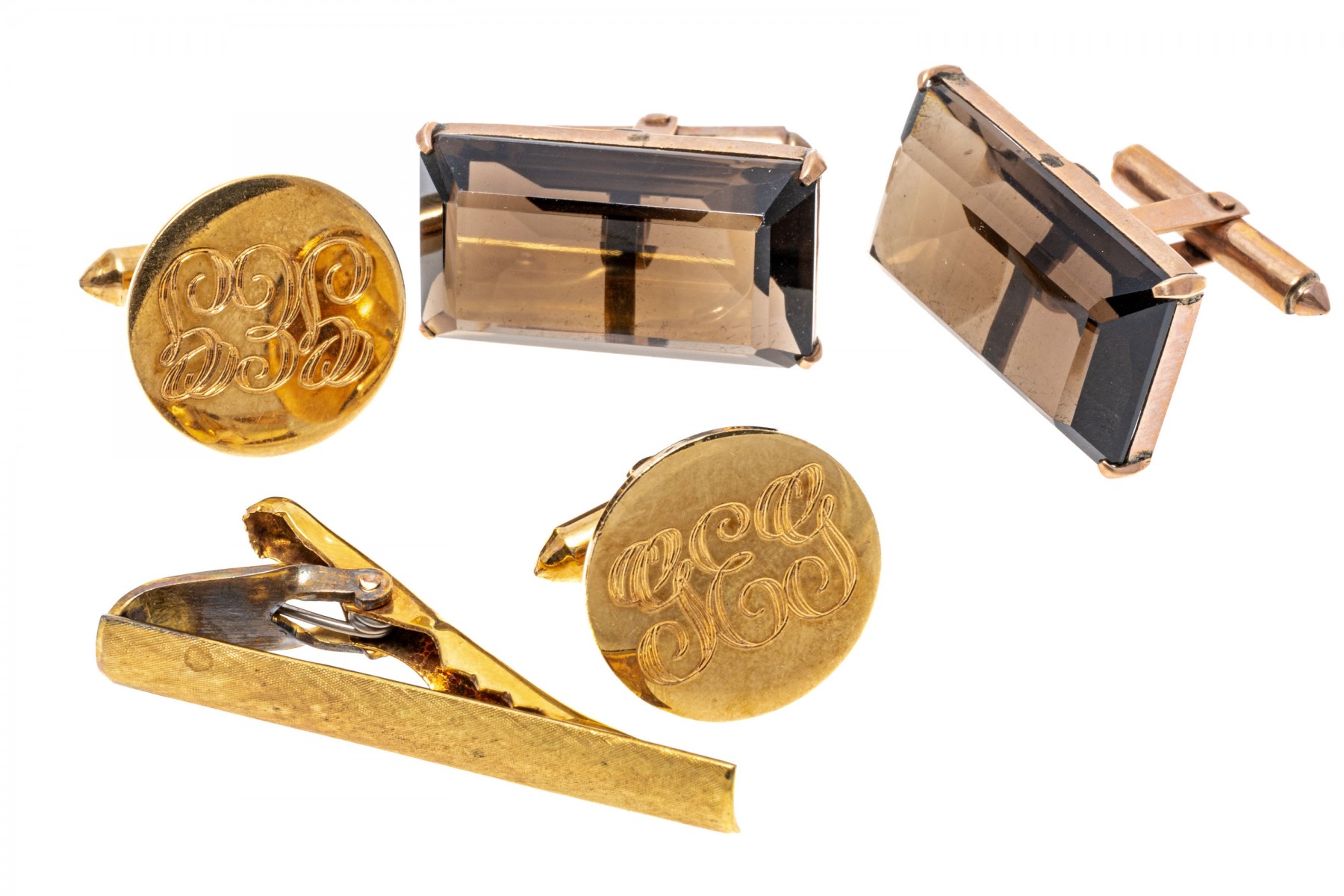 Lot of two lever style back cufflinks and one tie bar; 10k and 14k