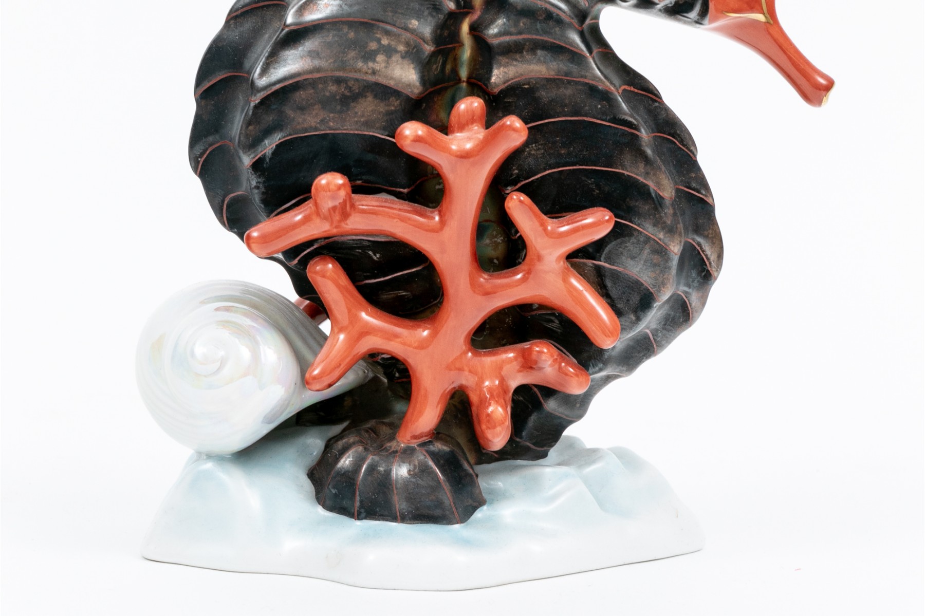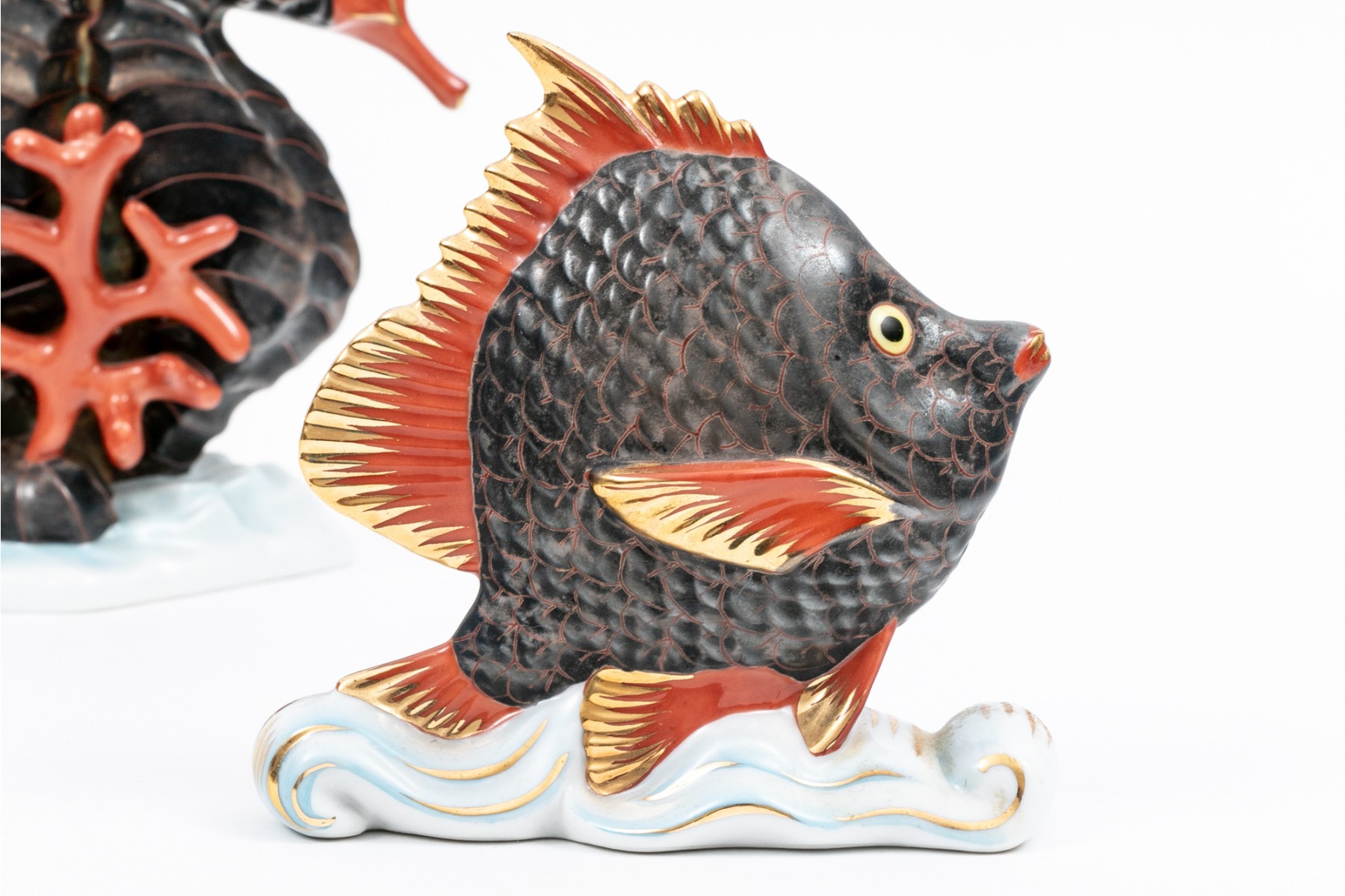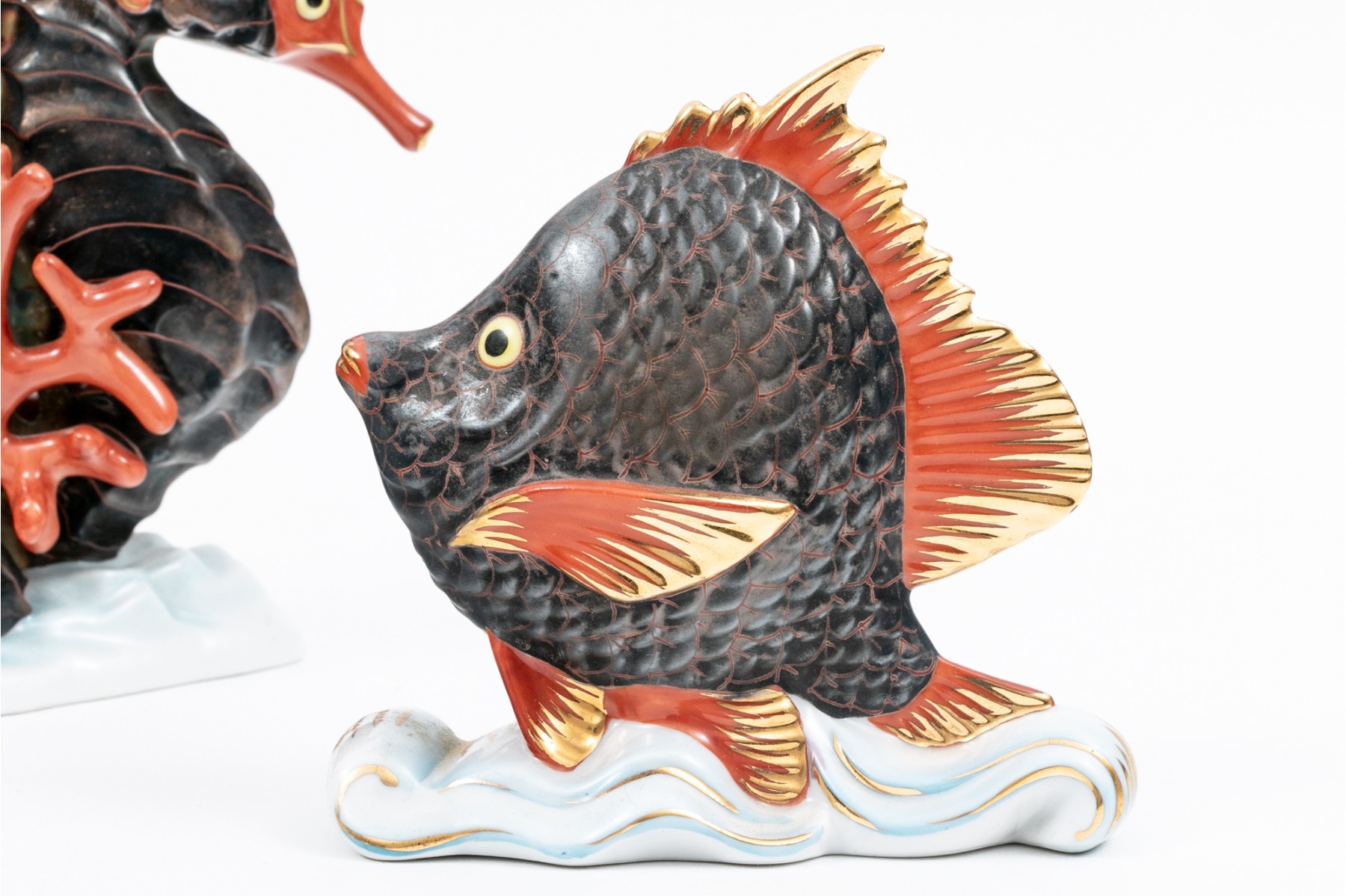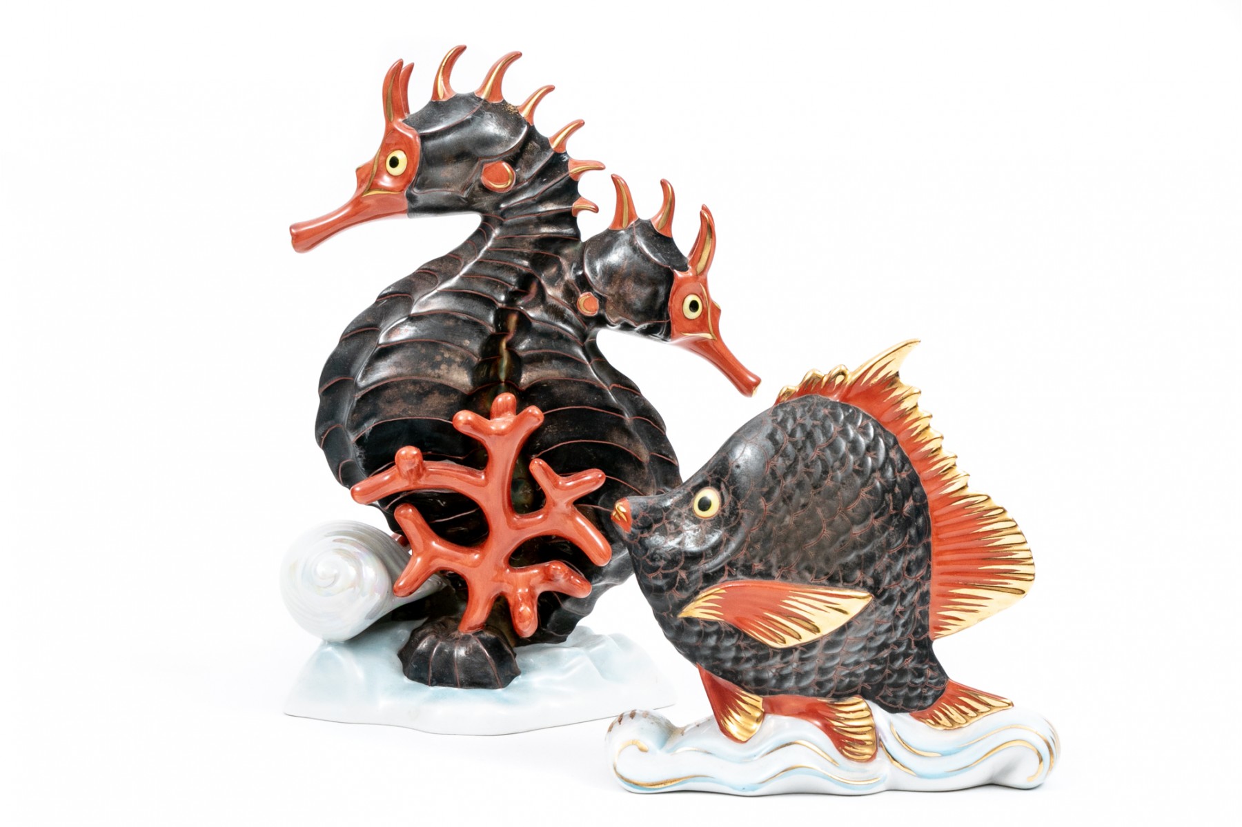 A set of compatible nautical Herend pieces of a fish and a pair of seahorses. Hand painted in a metallic grey, red, and gilt paint. The fish having the classic Herend fishnet patten. Both marked underfoot.