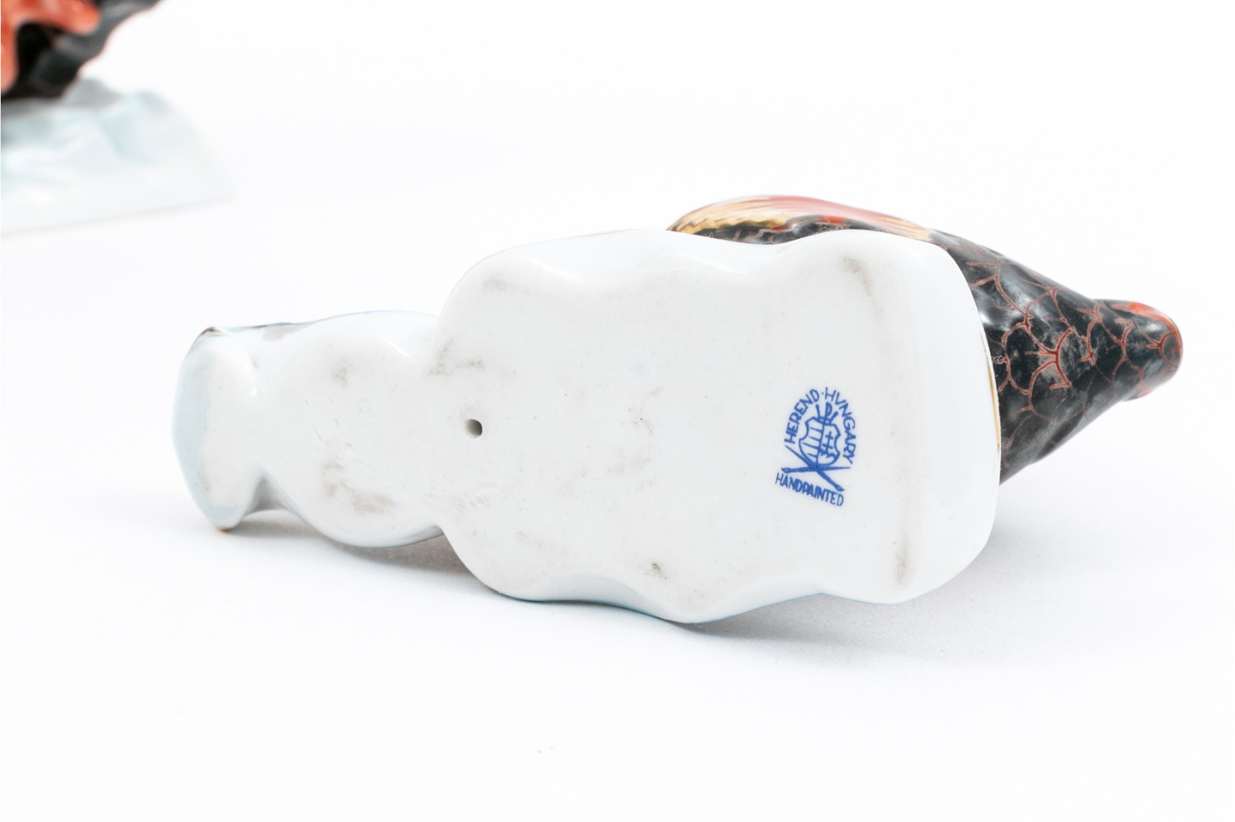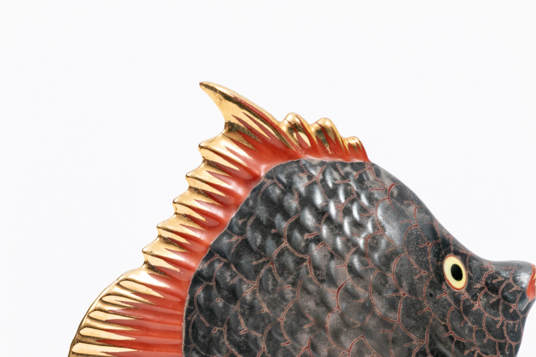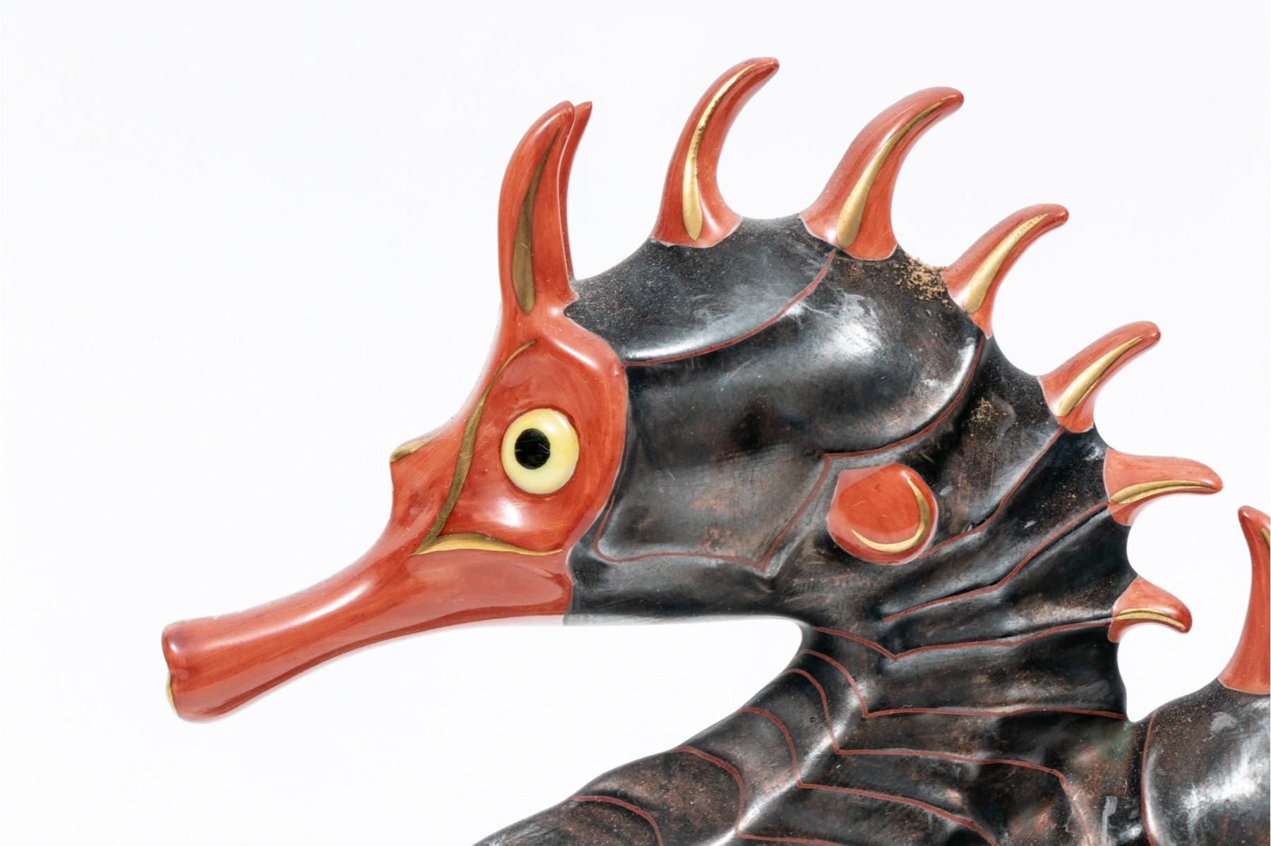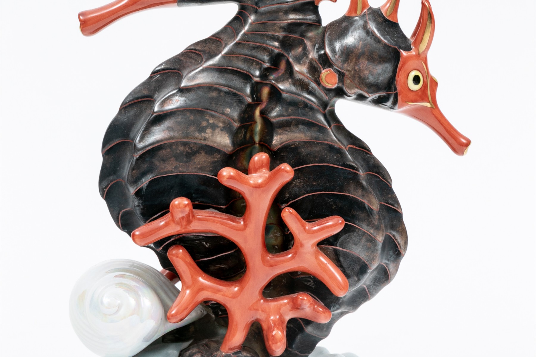 A set of compatible nautical Herend pieces of a fish and a pair of seahorses. Hand painted in a metallic grey, red, and gilt paint. The fish having the classic Herend fishnet patten. Both marked underfoot.