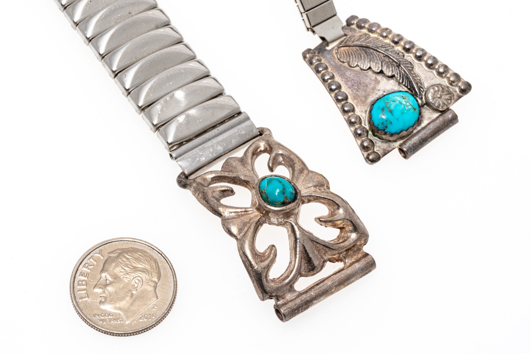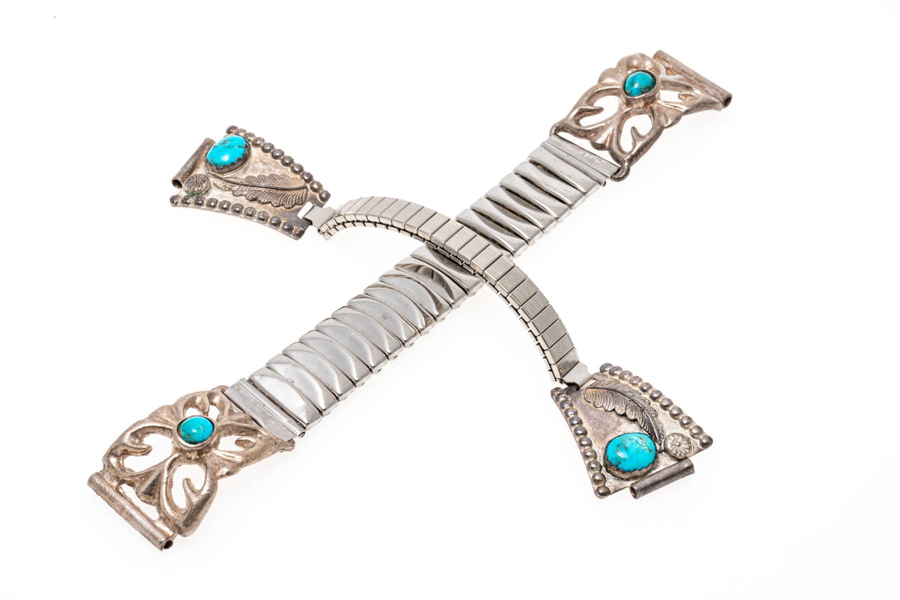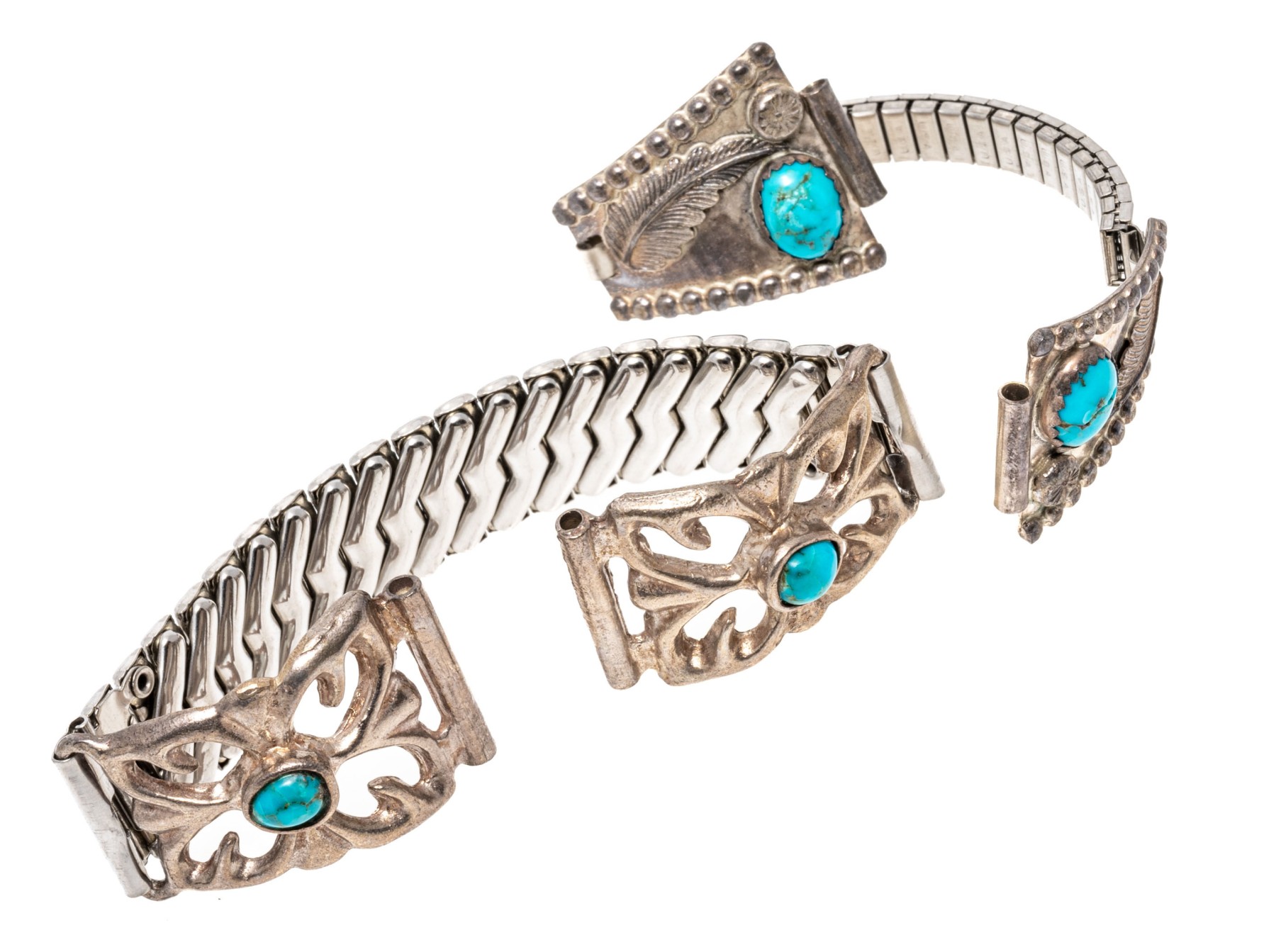 Lot of two Southwestern sterling silver ended expansion style watch bands, with steel expansion sections