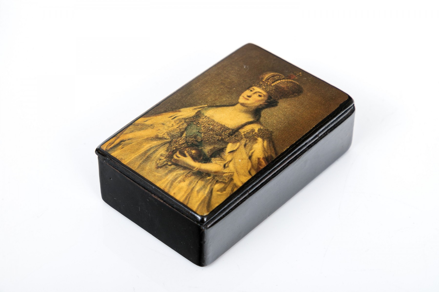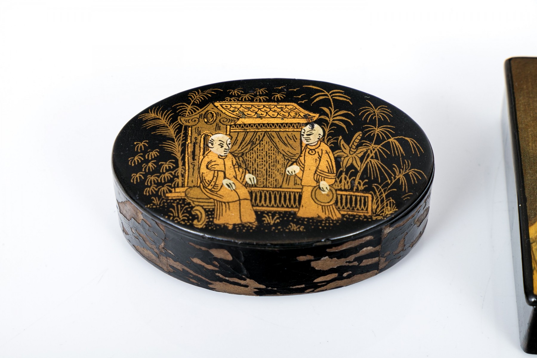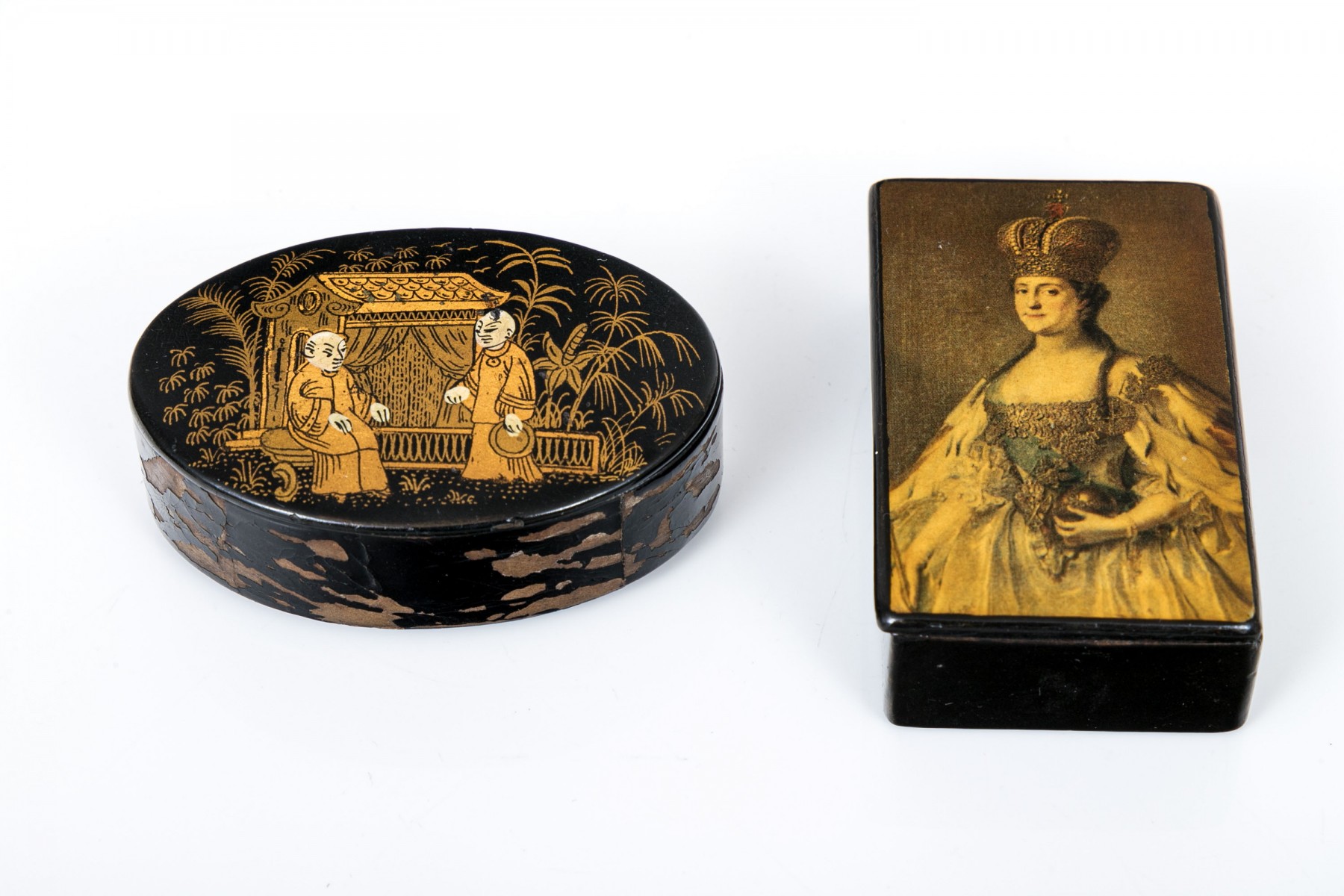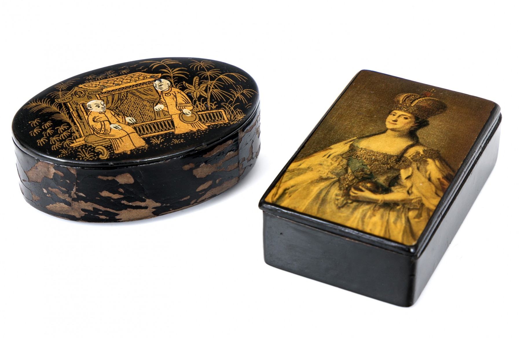 Lot of two vintage laquer boxes, one Asian motif and one with regalia motifs
