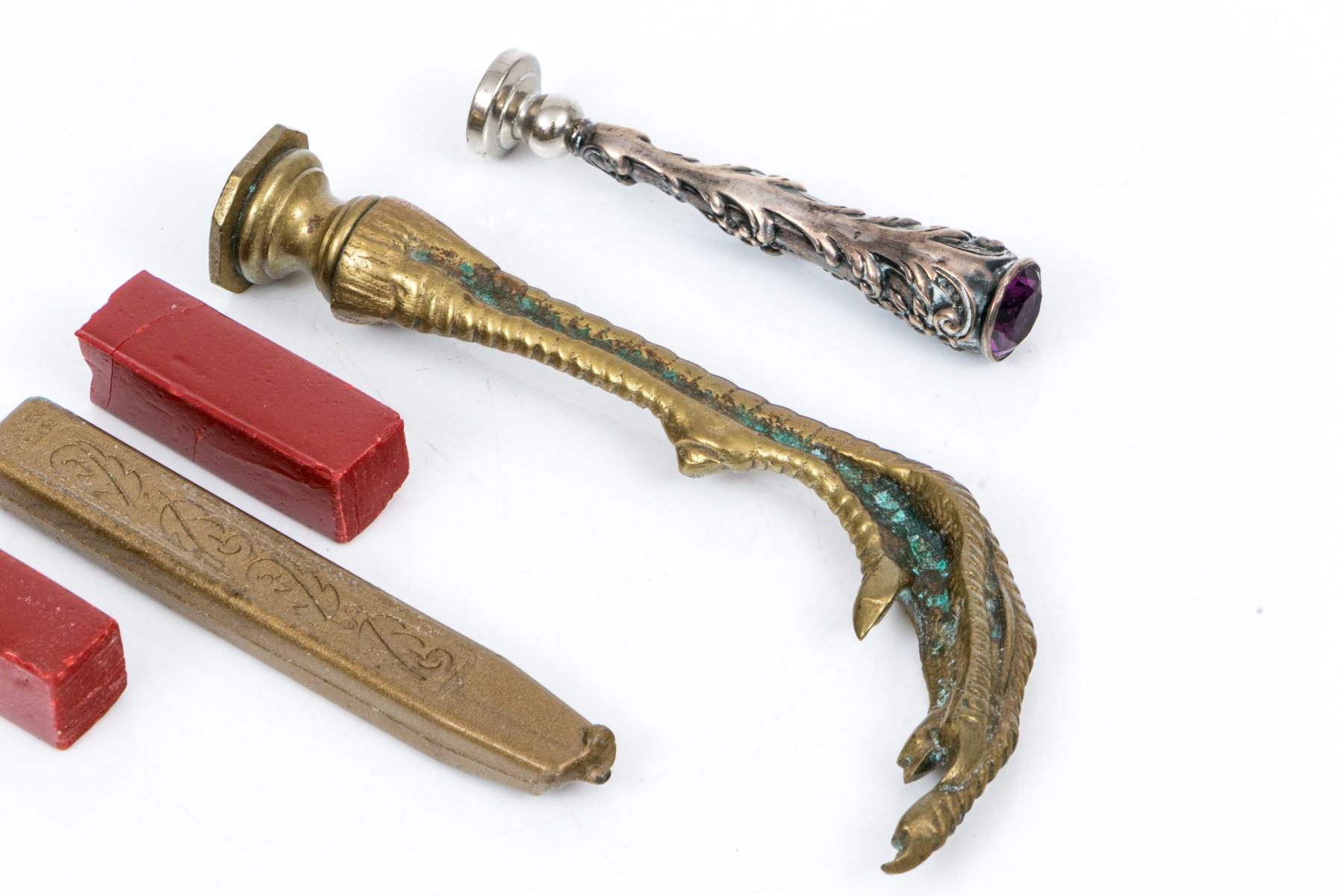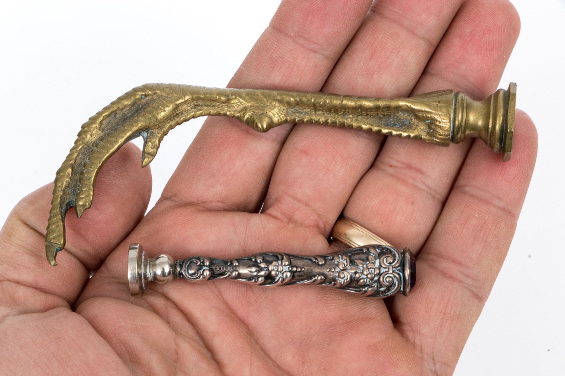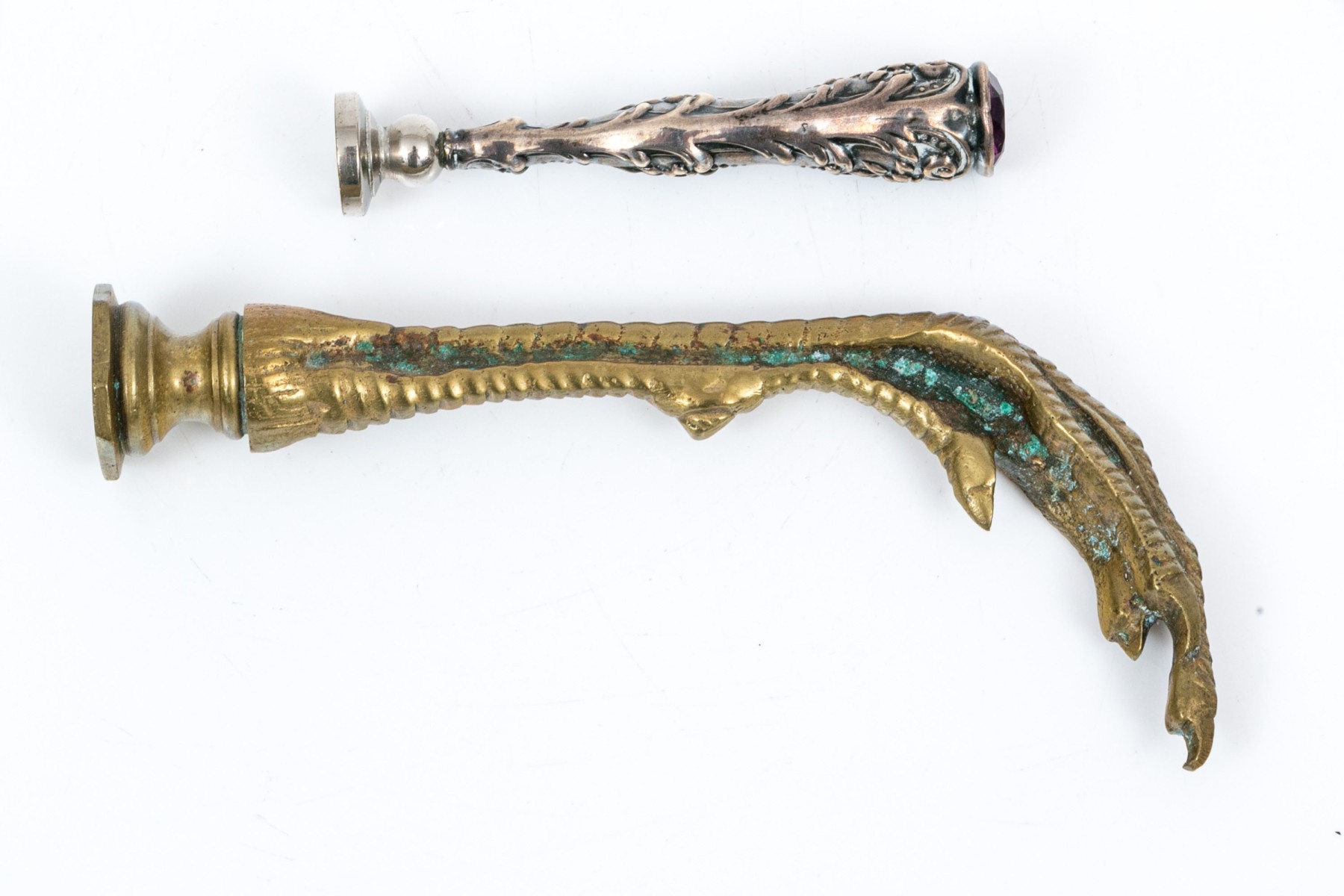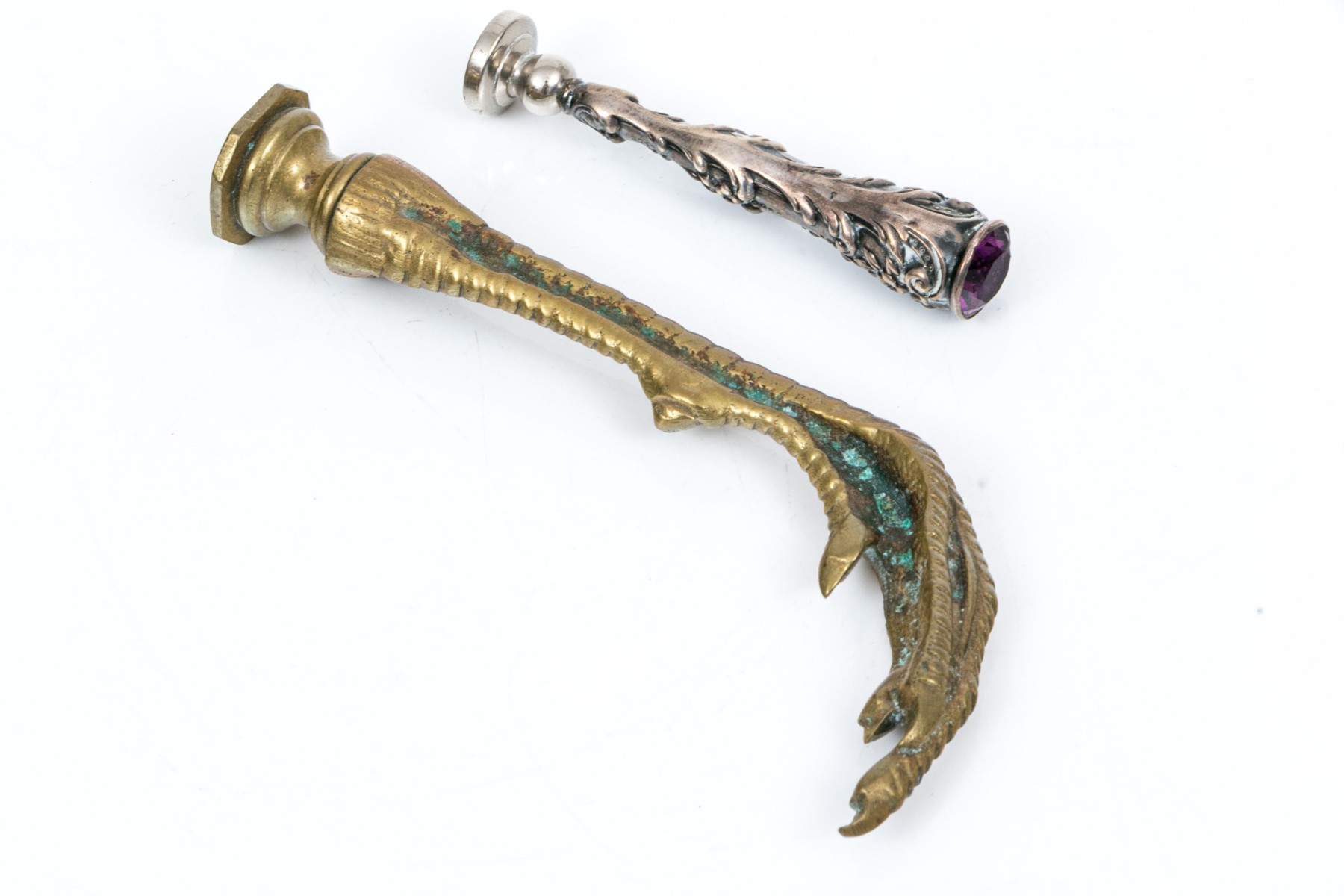 Lot of two vintage wax seal stamps, silver repousse and brass talon motifs, with wax