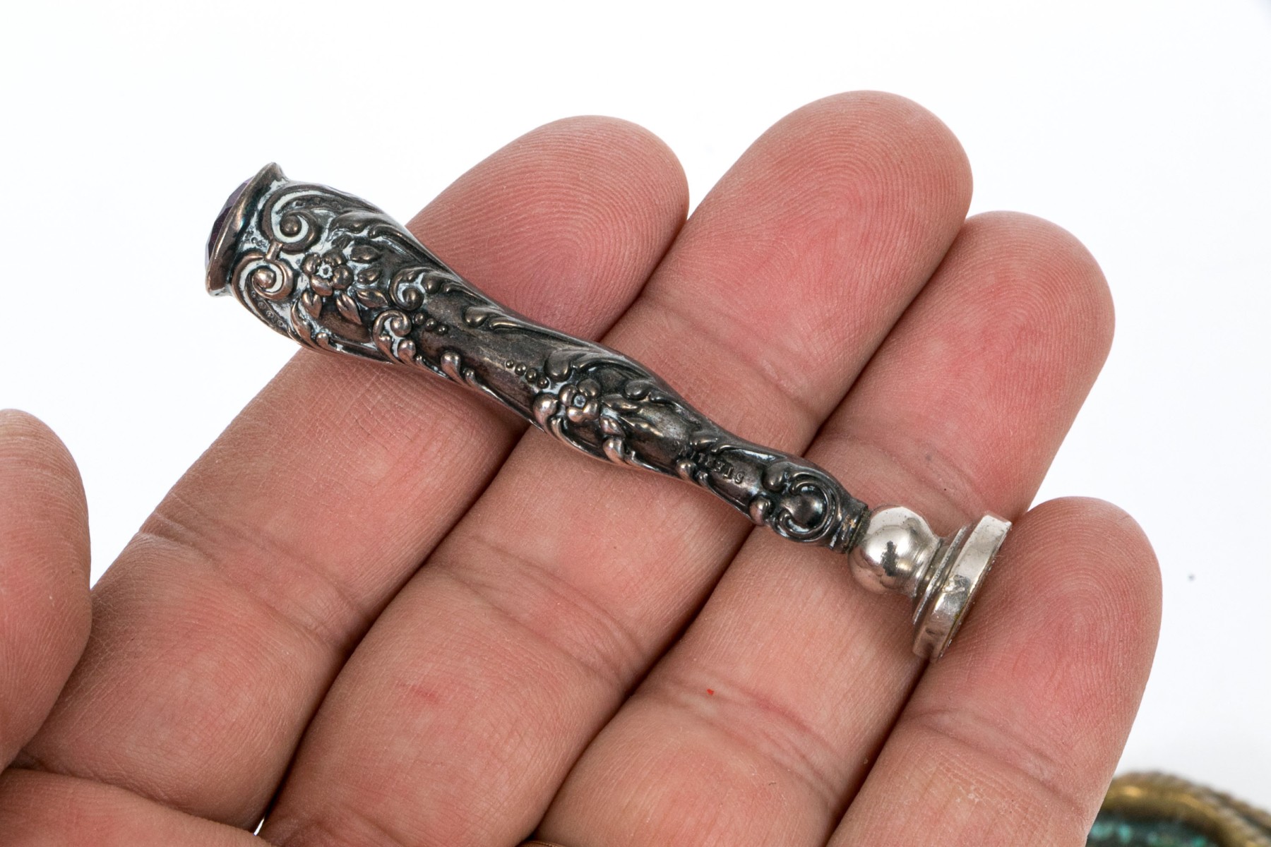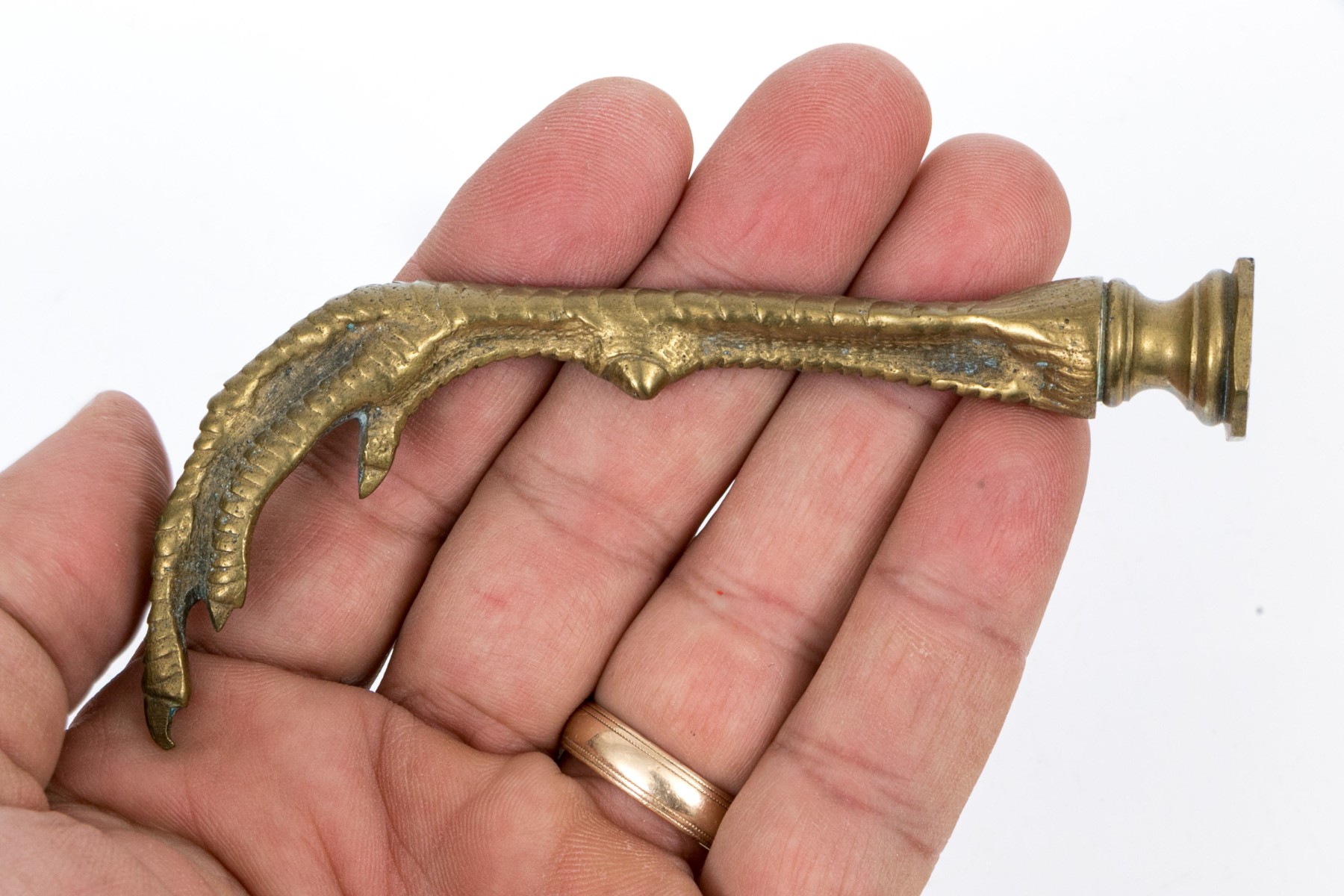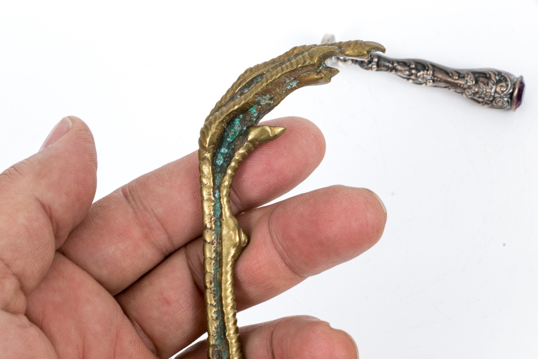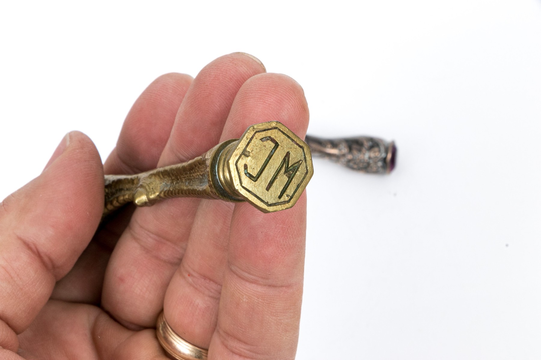 Lot of two vintage wax seal stamps, silver repousse and brass talon motifs, with wax