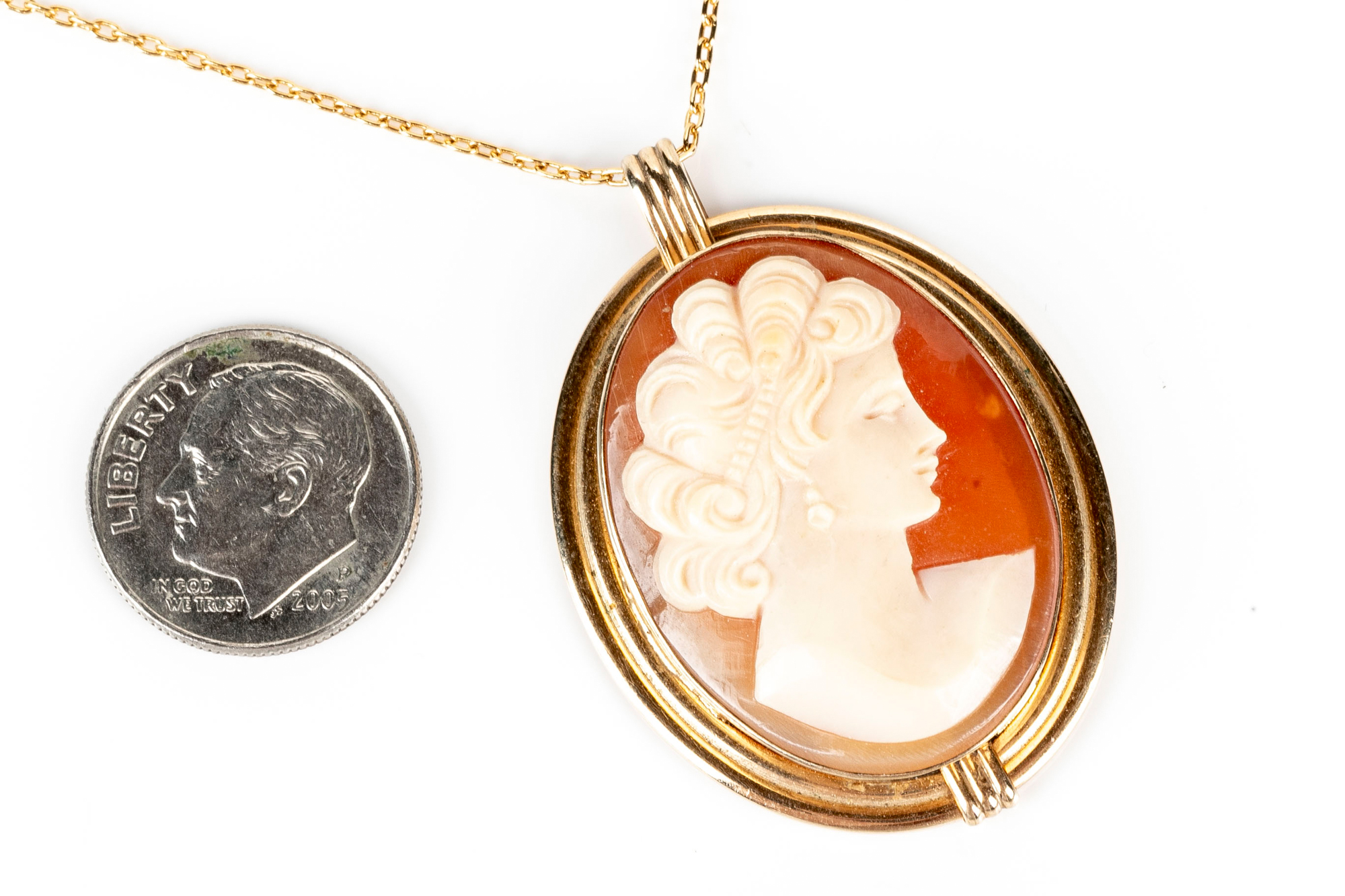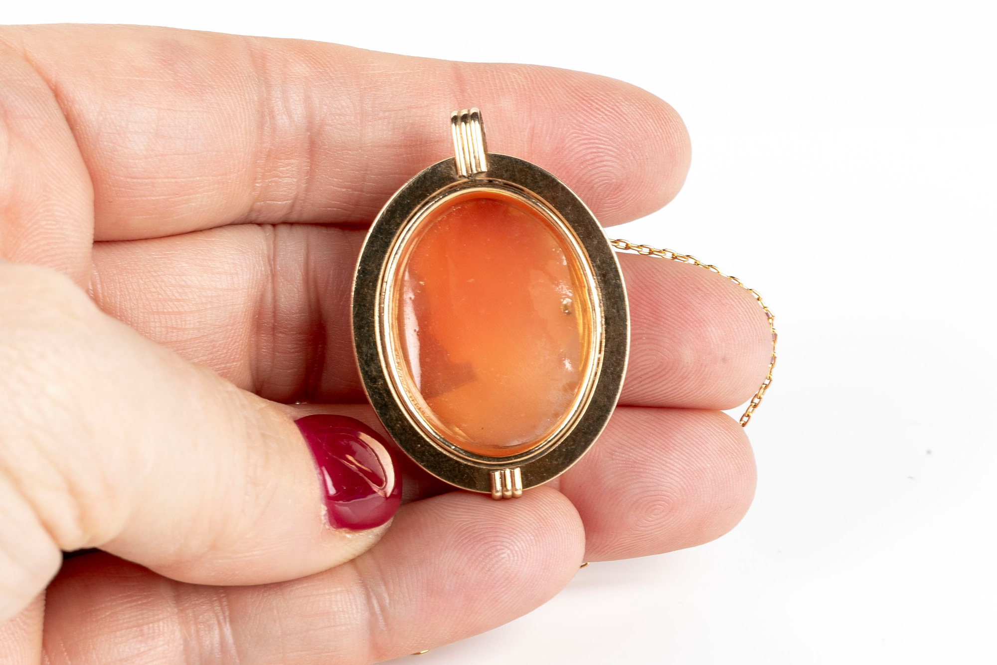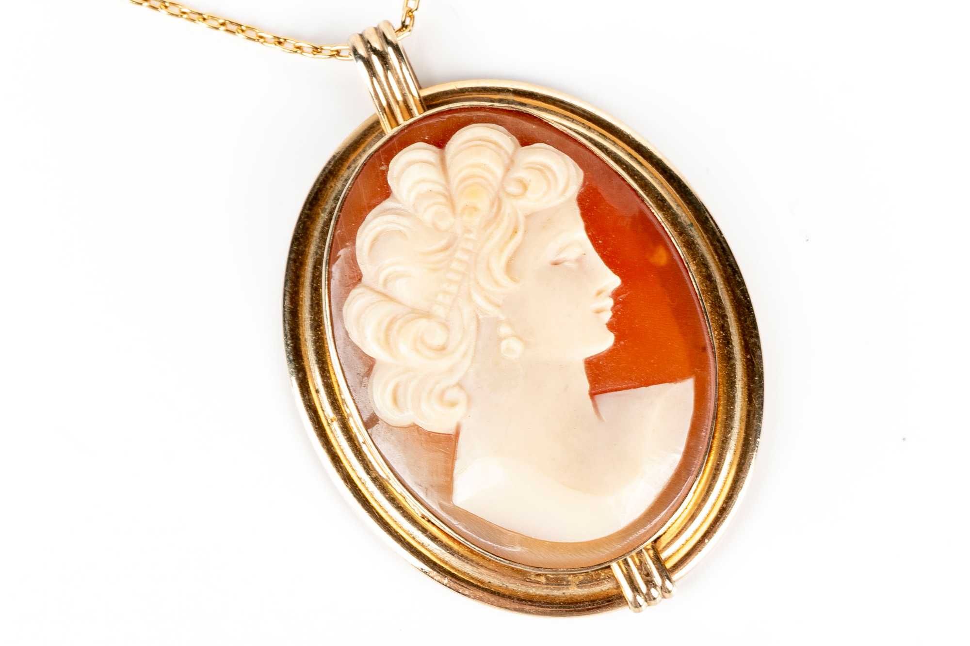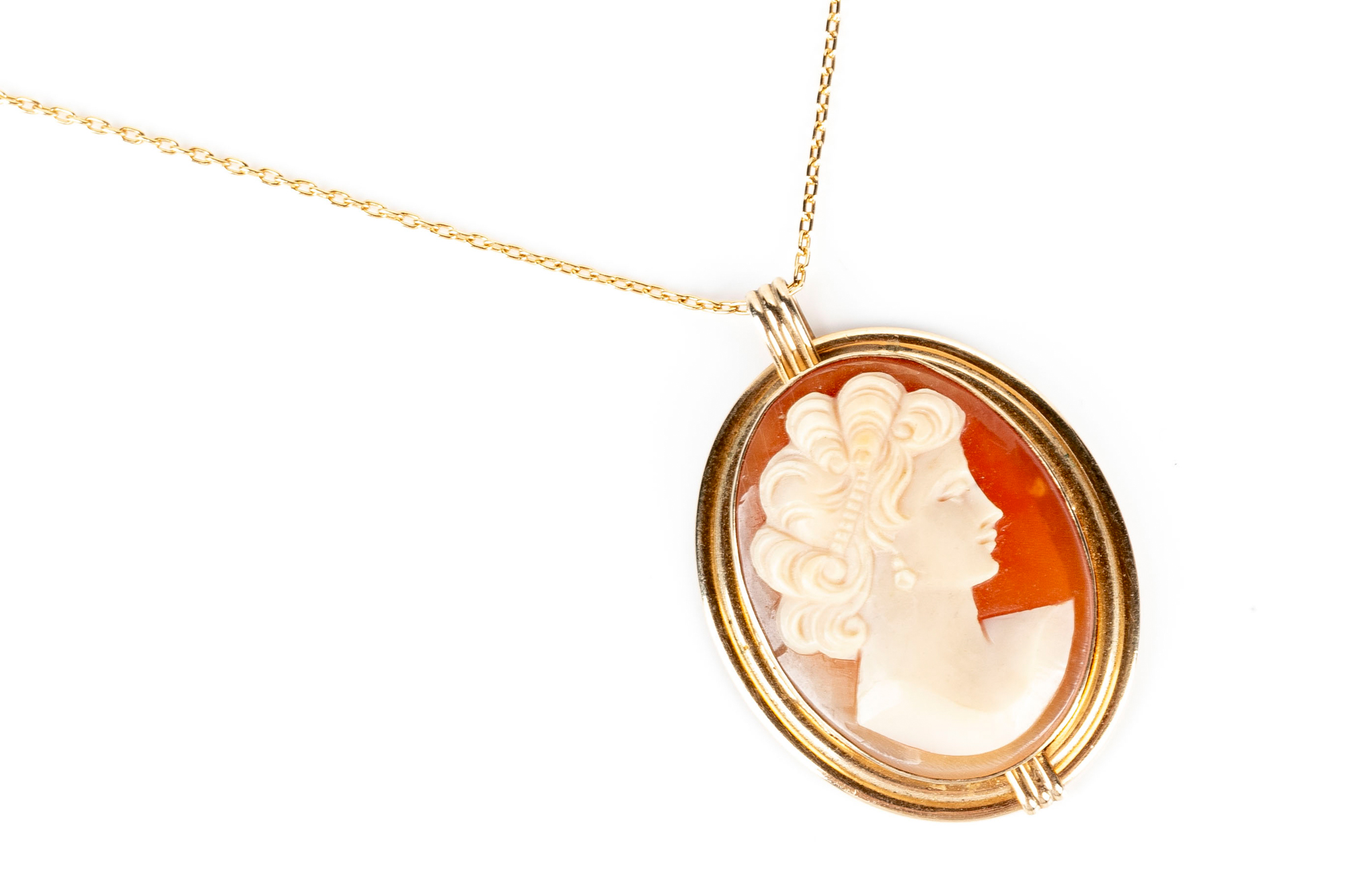 A gold filled cameo pendant necklace with a spring ring clasp.