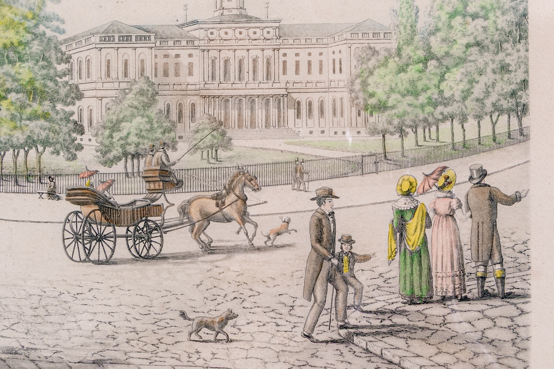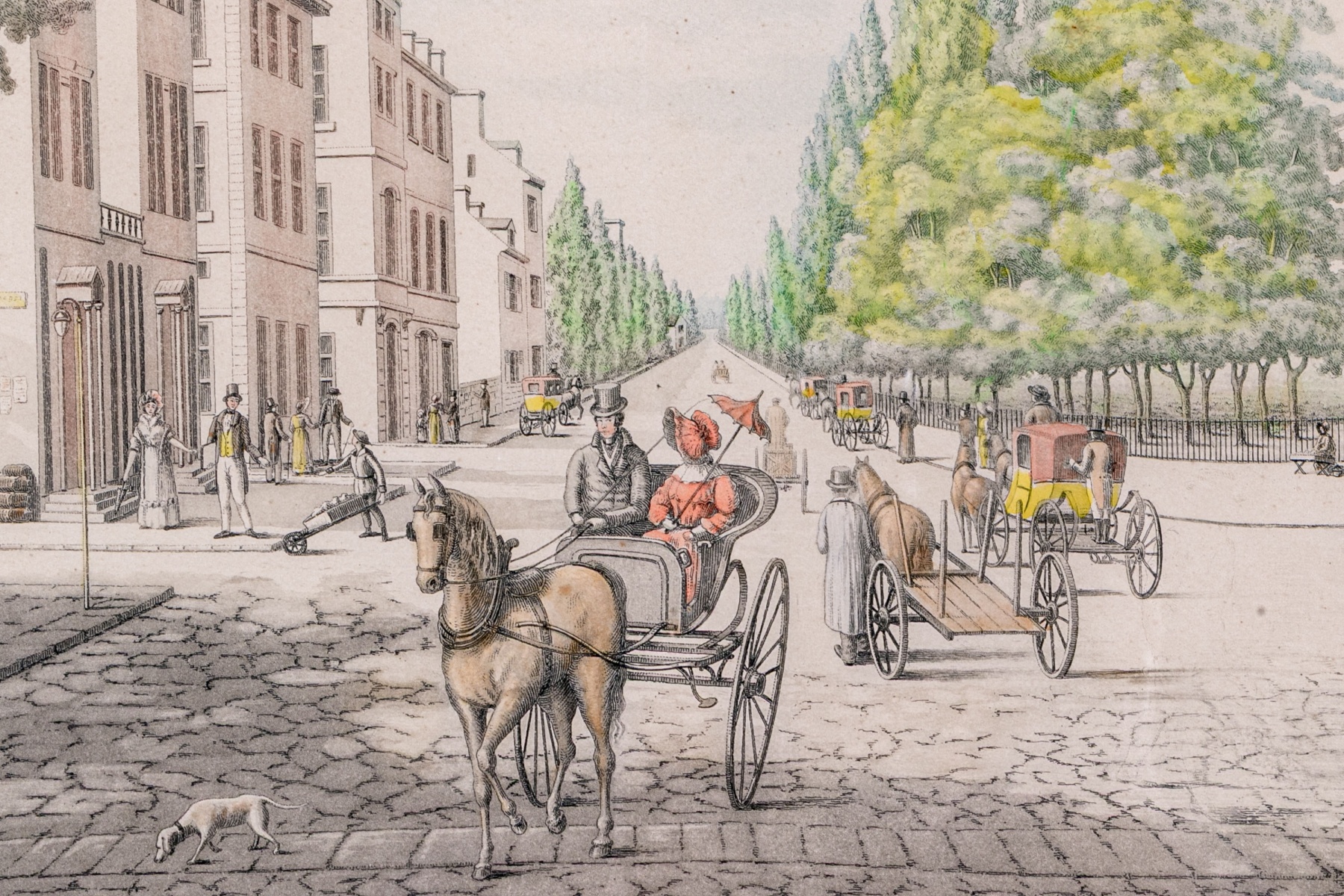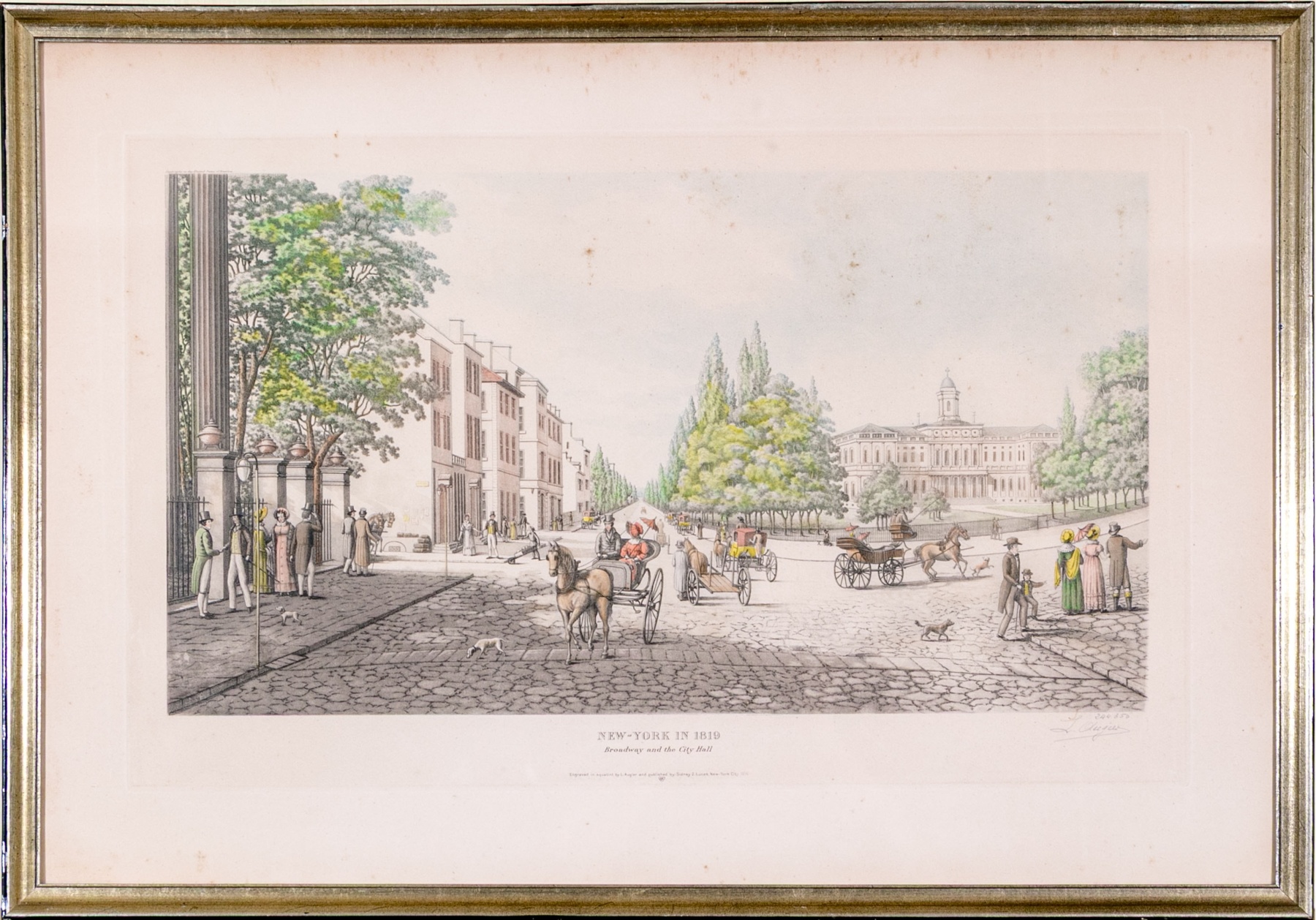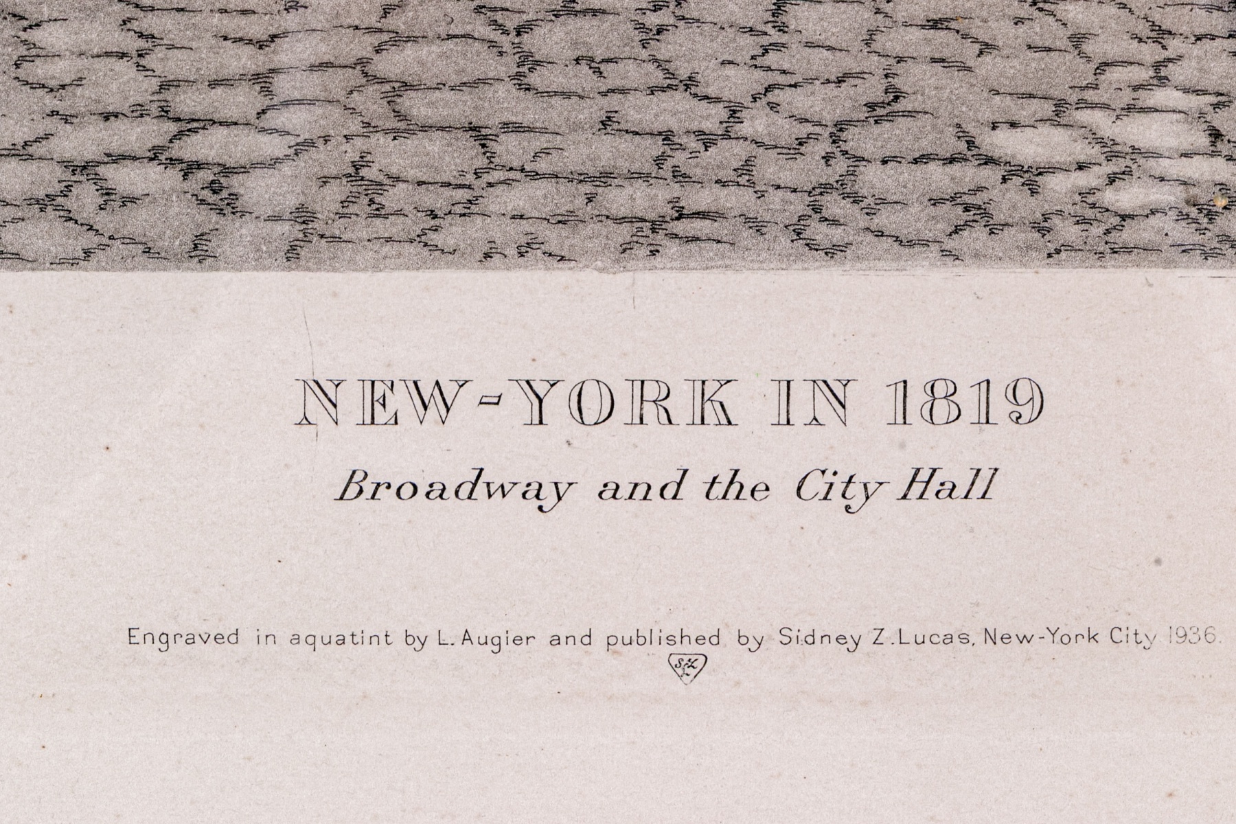 Louis Augier (French, 1825-1893) "New York in 1819, Broadway and the City Hall" engraving and aquatint published by Sidney Z. Lucas in New York City, 1936 depicting figures and horse drawn carts along a bustling urban scene with a cobbled street passing by urban architecture dotted with green trees. Pencil signed lower right.