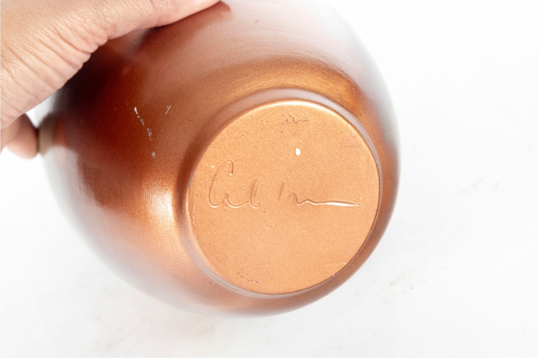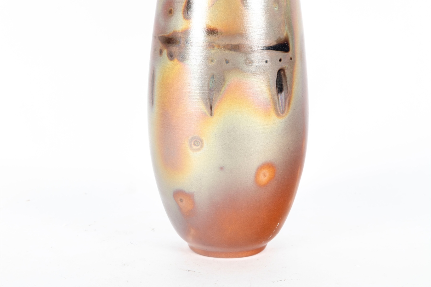 Handcrafted studio pottery teardrop vase by Louis and Christine Colombarini. Features a smooth raku-fired surface with iridescent metallic and smoke-toned glaze variations in bronze, violet, and charcoal hues. A carved signature is located at the base.
