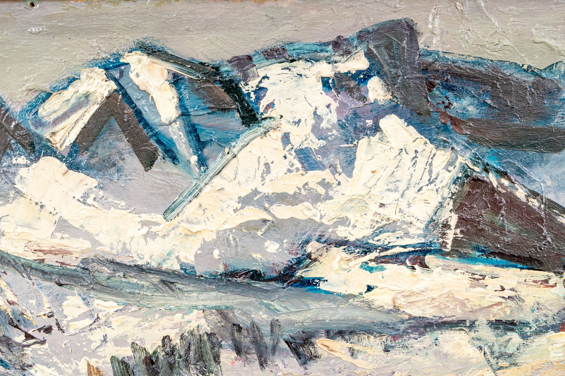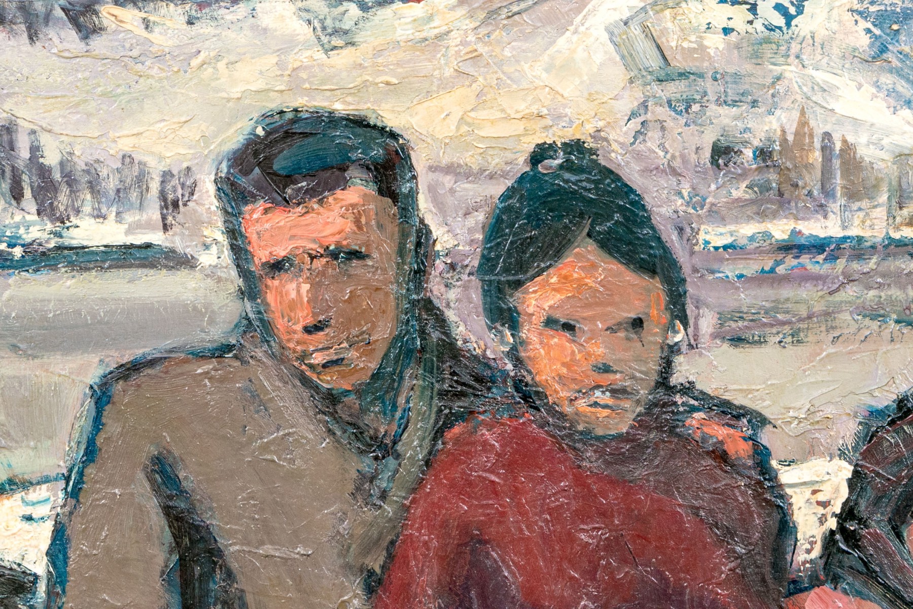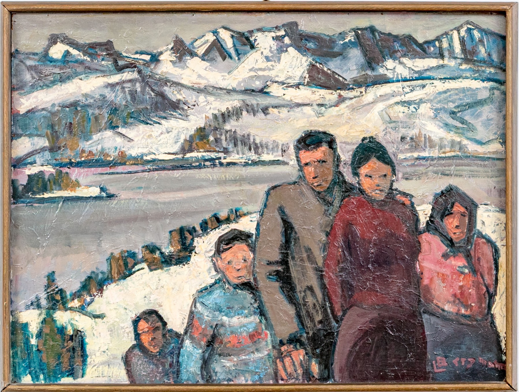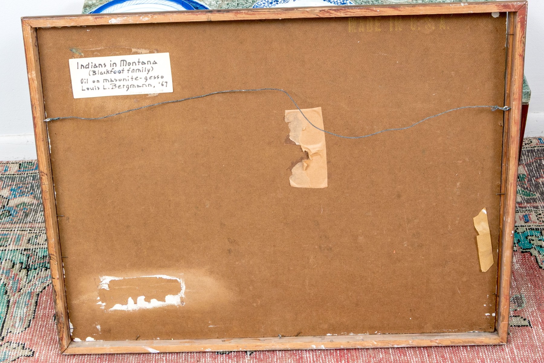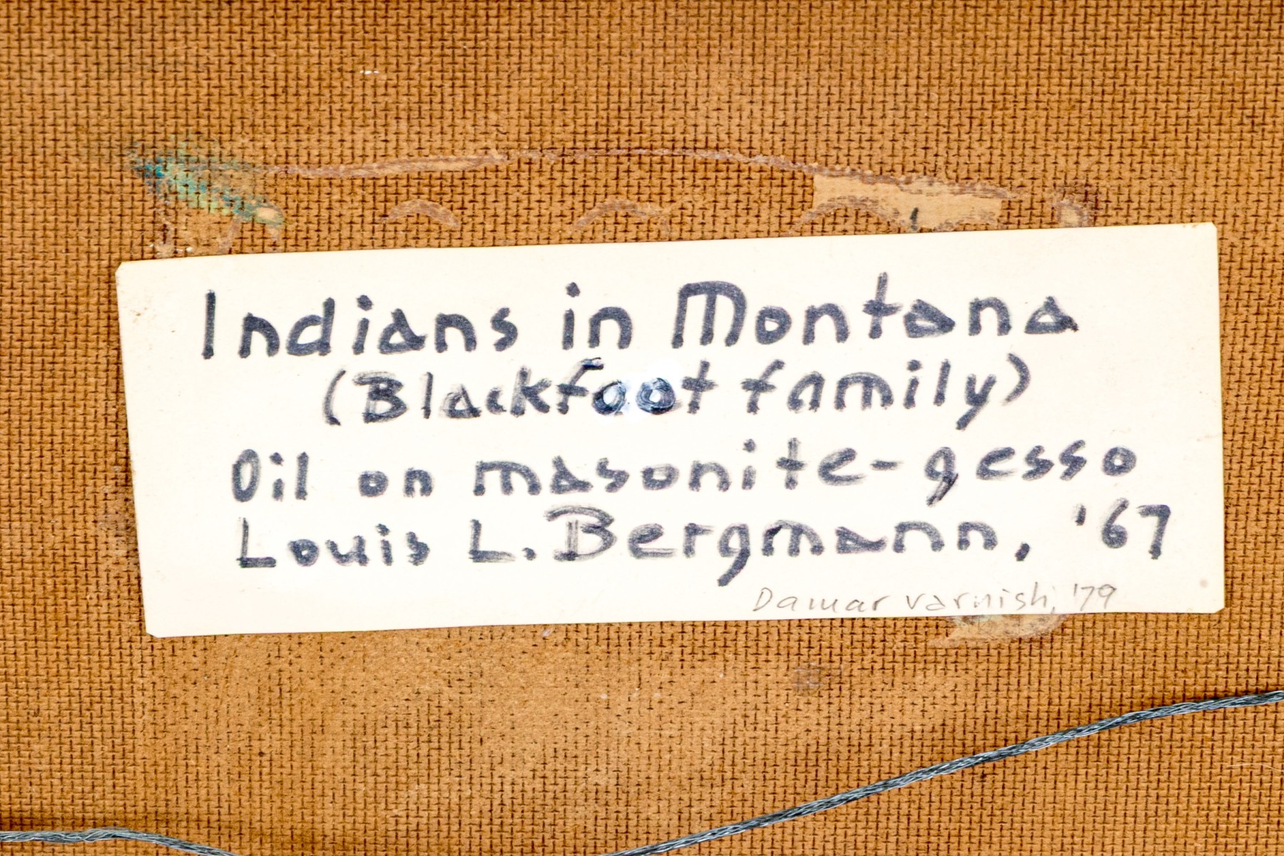 Louis L. Bergmann (Austrian-American, 1907-1992) "Indians in Montana (Blackfoot Family)" oil painting on masonite depicting a family with a husband in gray, wife in red, grandmother in pink, an two boys in blue gathered to face the viewer against an icy backdrop of jagged mountains and a vast, calm gray lake dotted with pops of brown, yellow, and green foliage. Signed lower right and labeled on the verso.