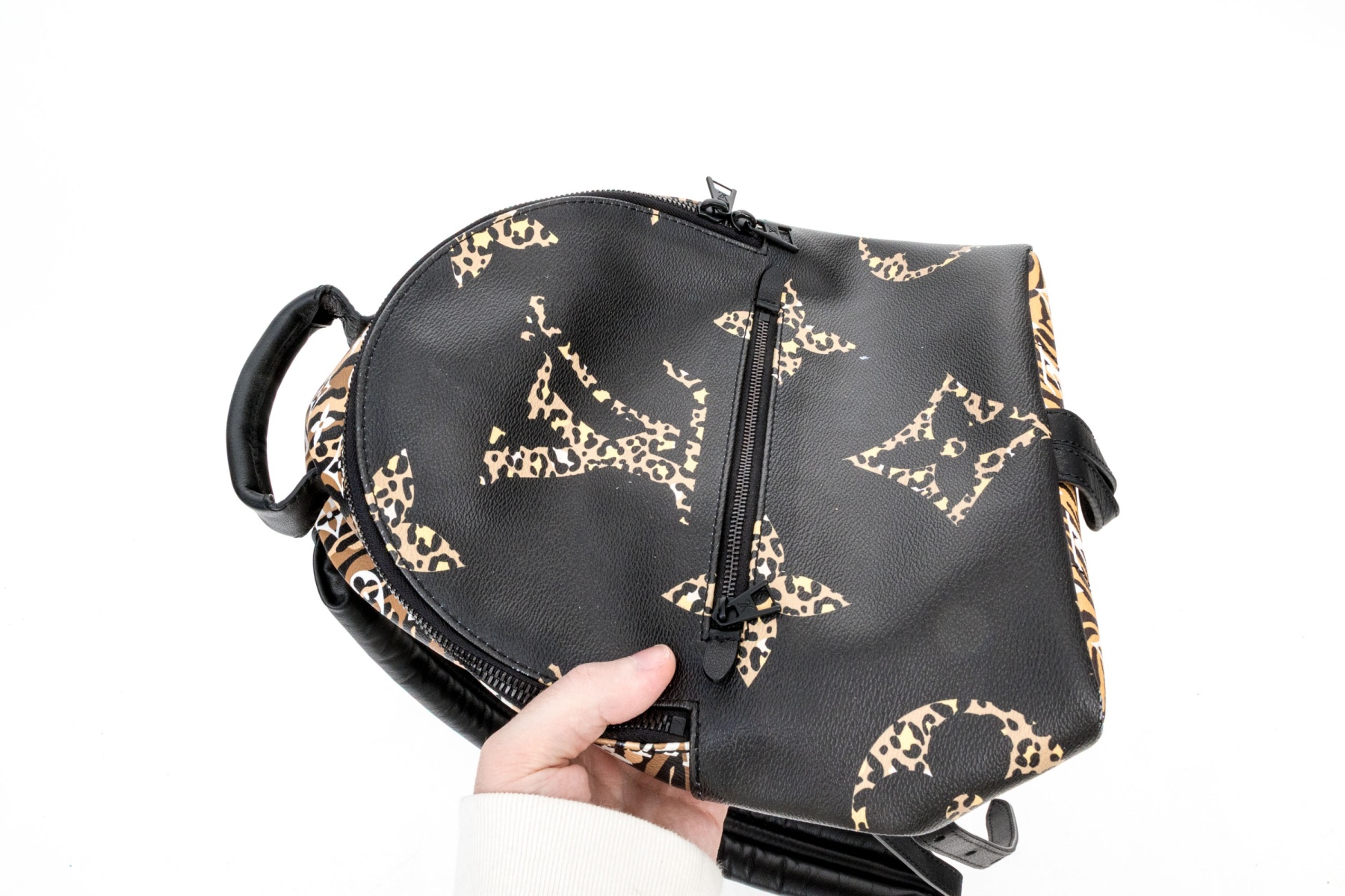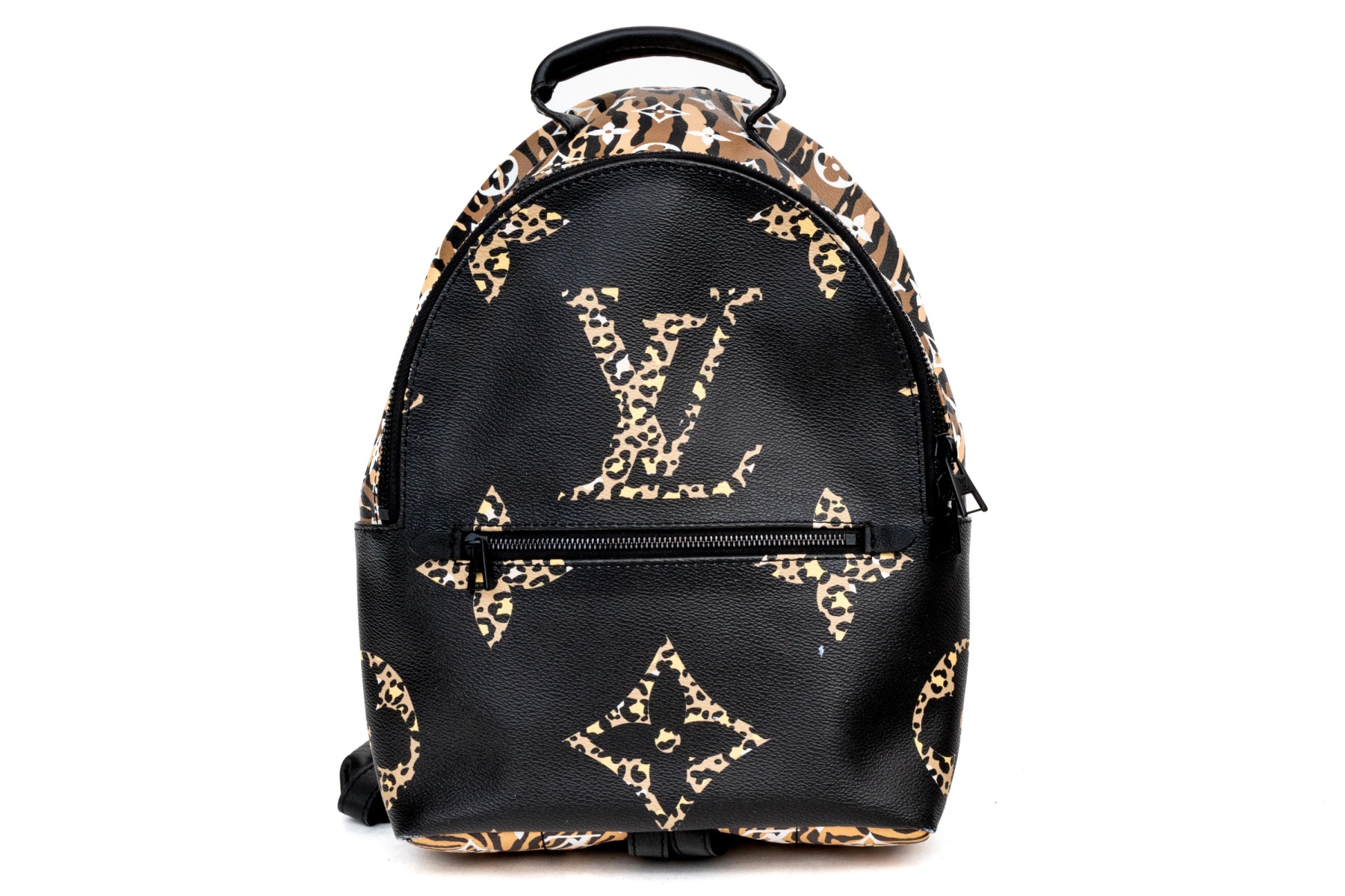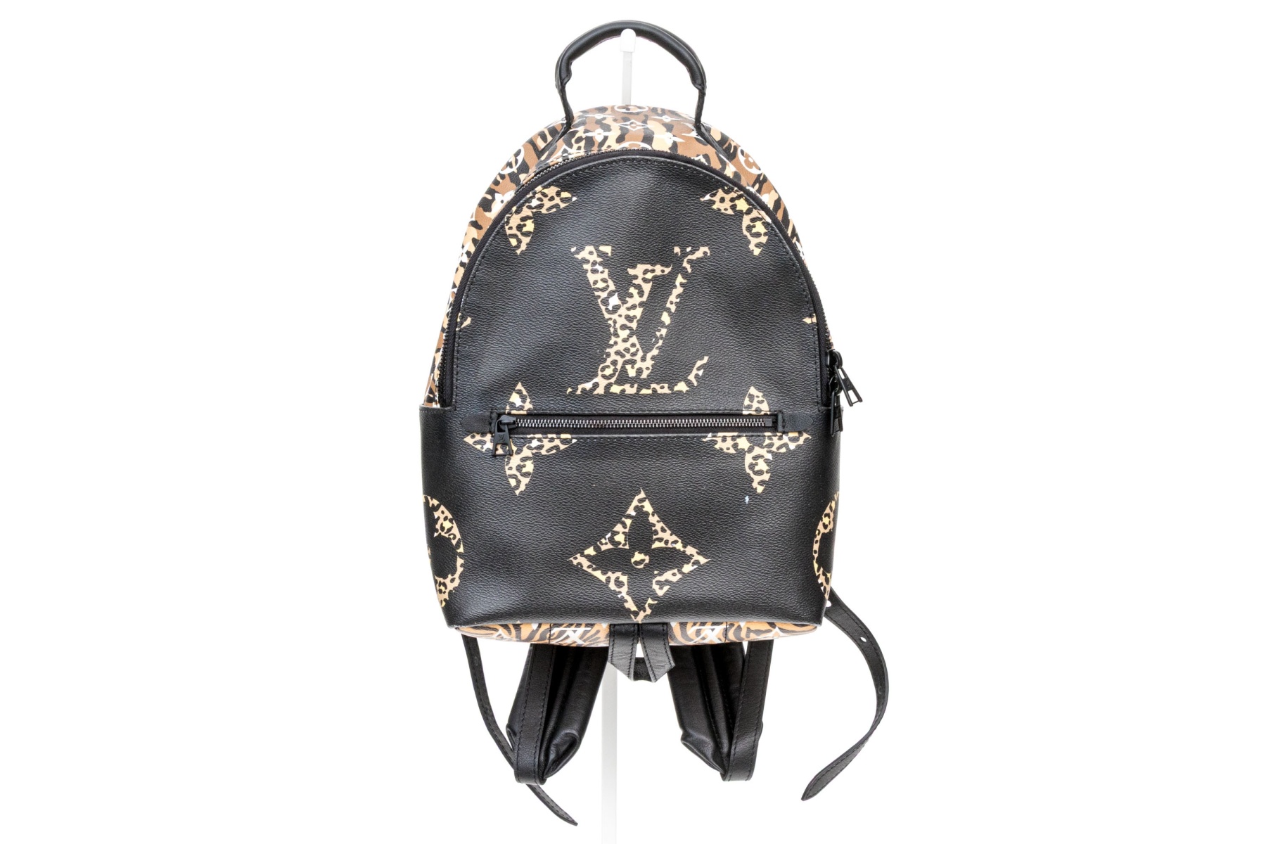 This is a Louis Vuitton Monogram Giant Jungle Palm Springs PM backpack in black and brown coated canvas with black leather trim.