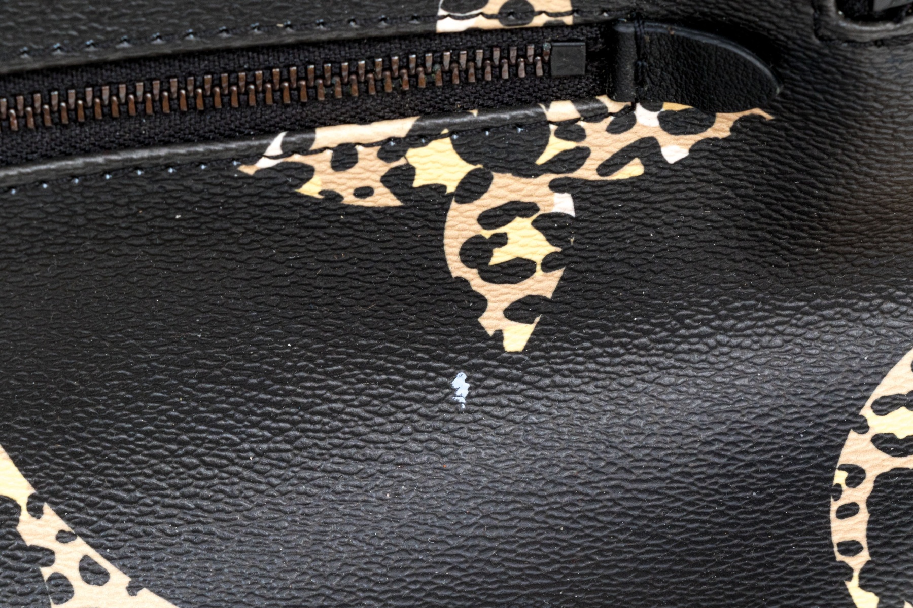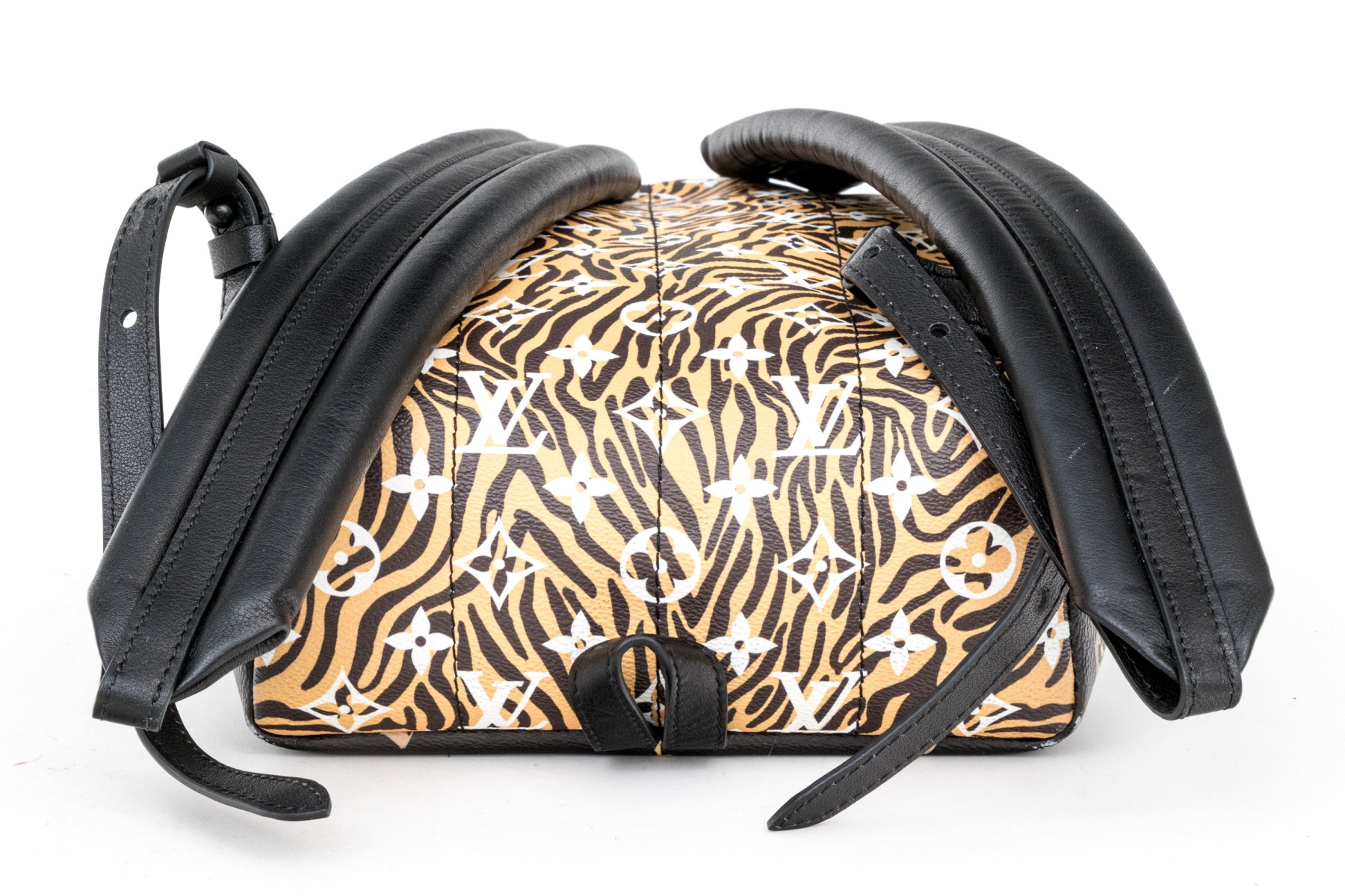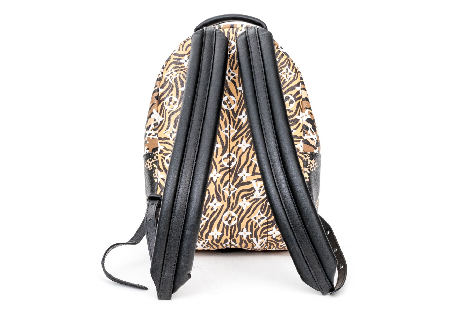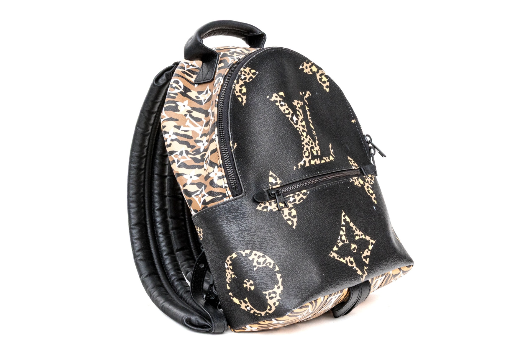 This is a Louis Vuitton Monogram Giant Jungle Palm Springs PM backpack in black and brown coated canvas with black leather trim.