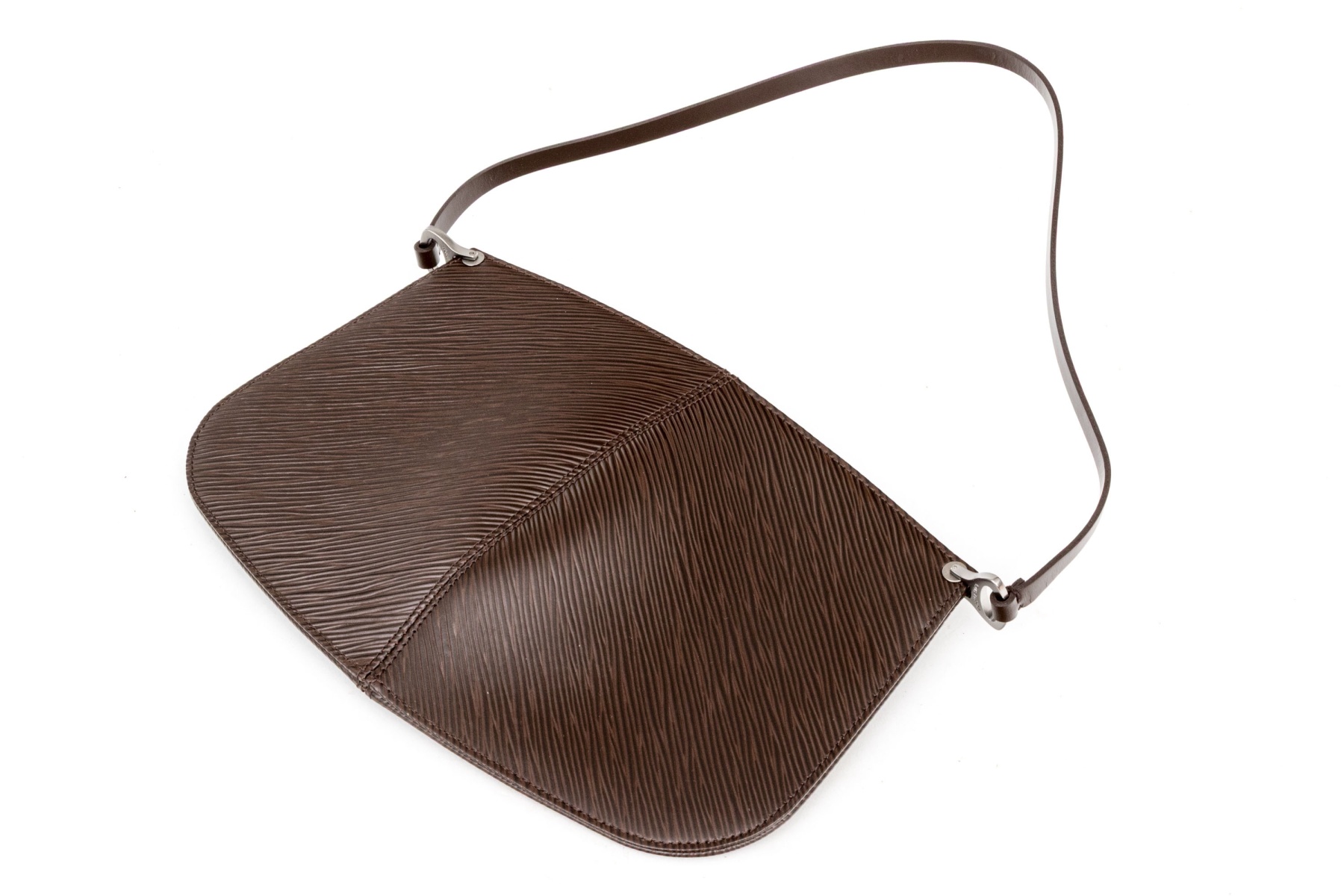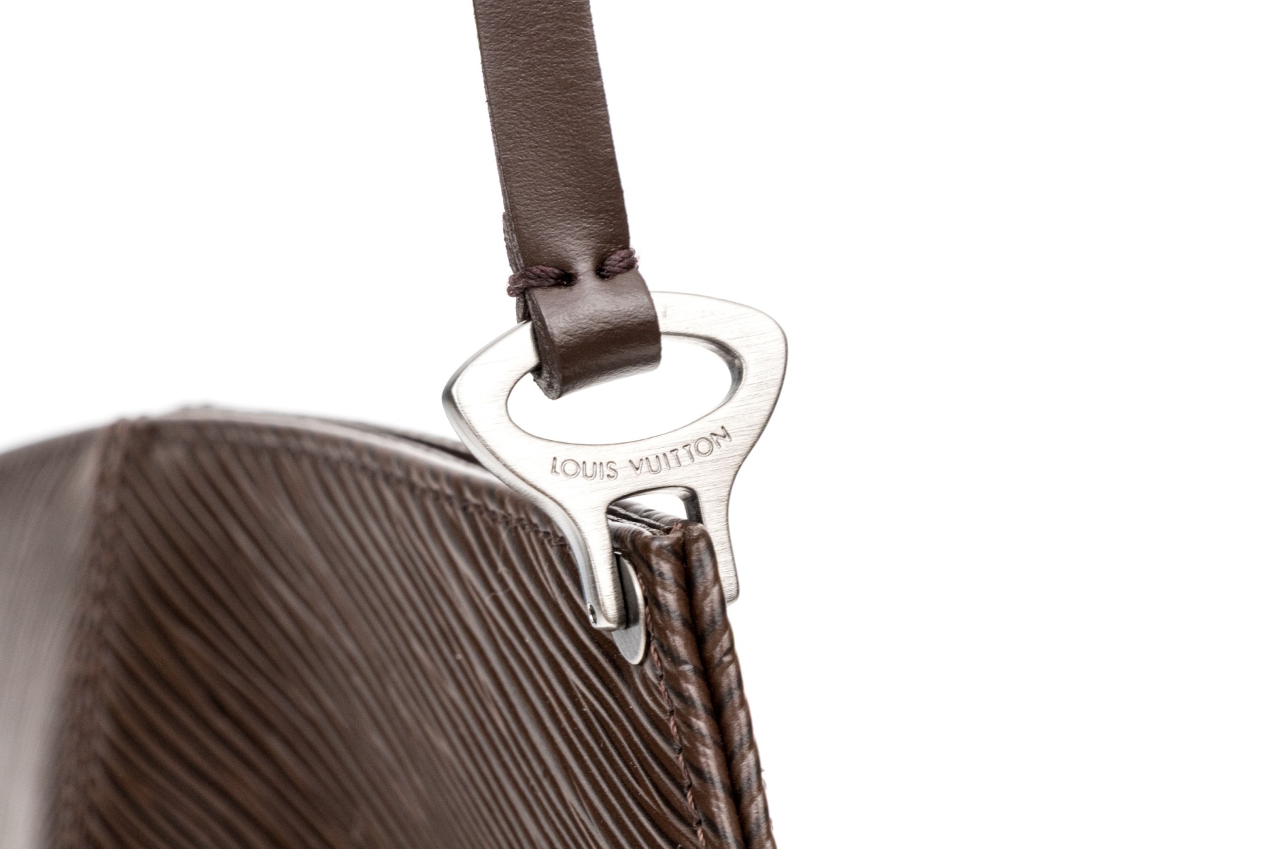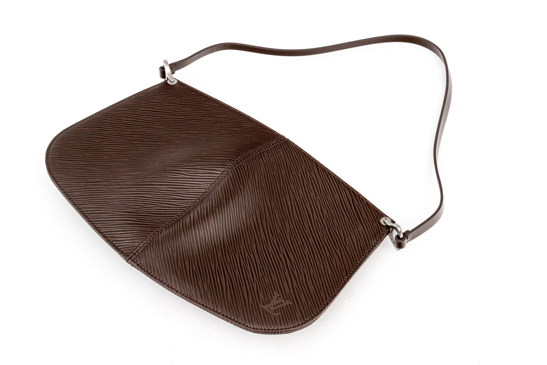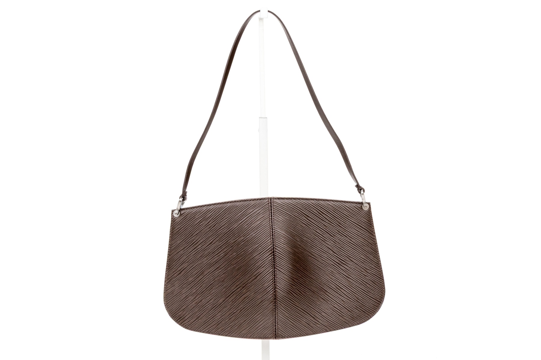 This great top handle bag by Louis Vuitton has a shallow, demi-lune profile, in dark brown epi style leather, decorated with a vertical center seam and finished with white hardware. With dust bag.