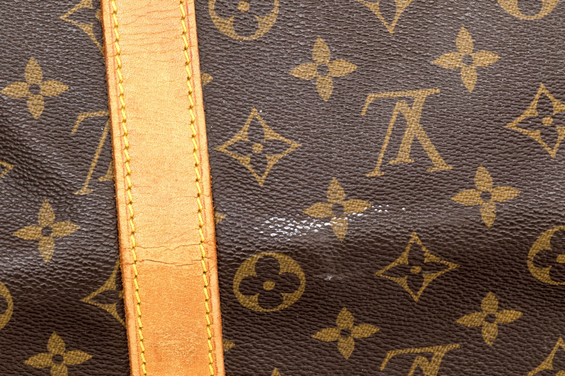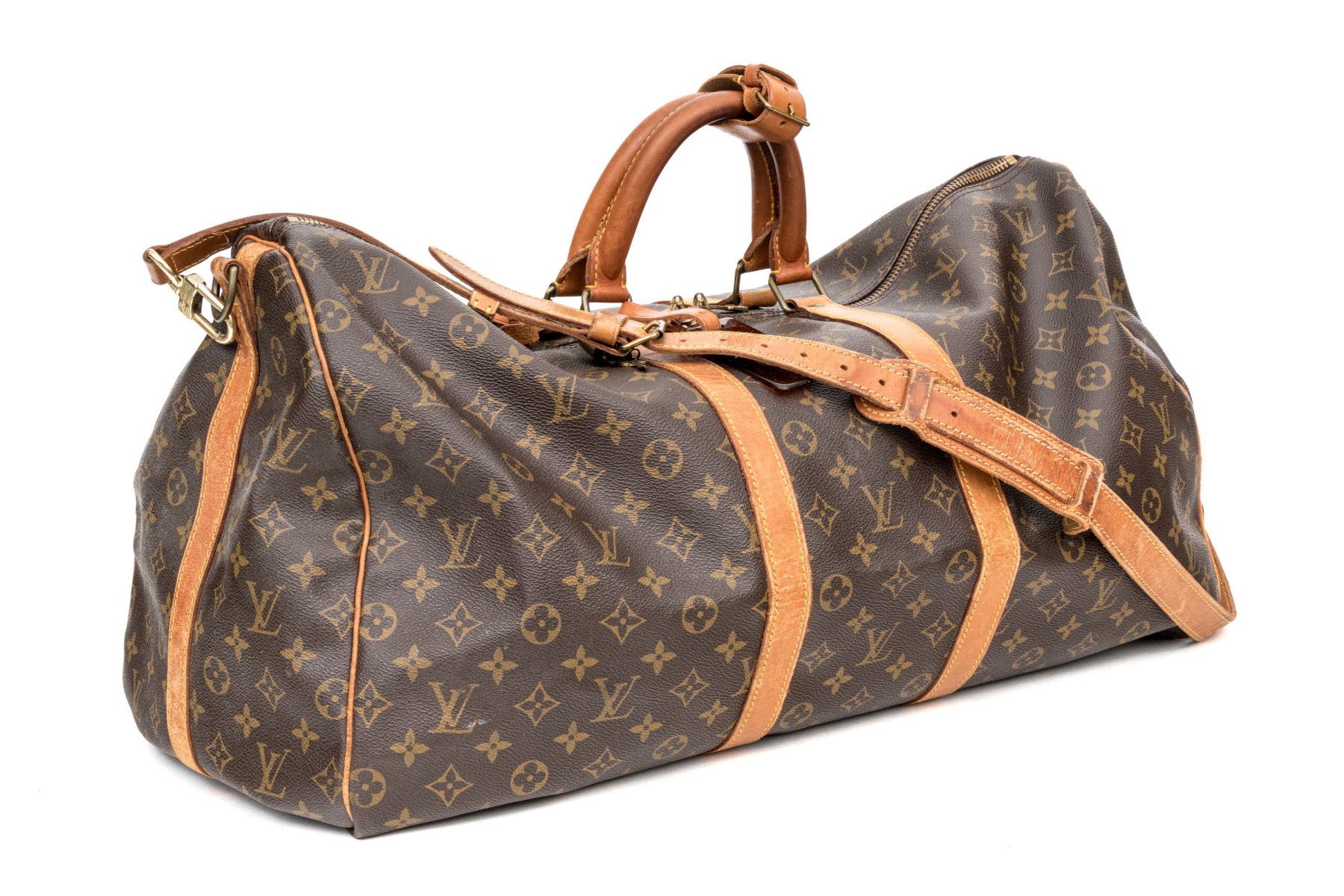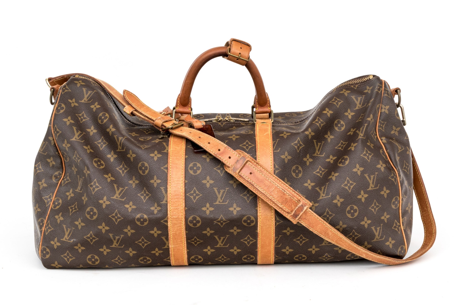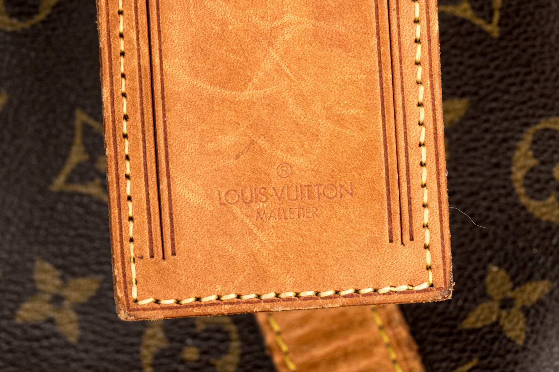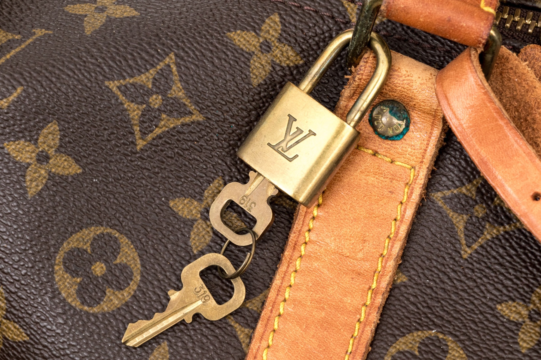 Louis Vuitton striking vintage brown monogram leather and canvas "Keepall 50", circa 1989. With lock, two keys and a luggage tag.