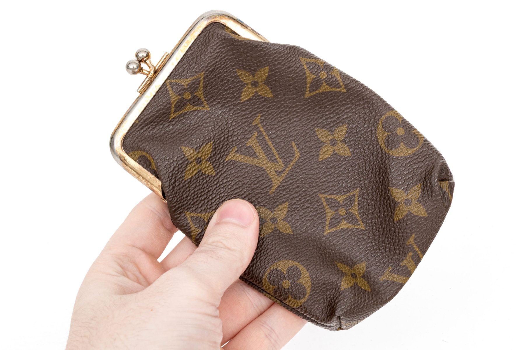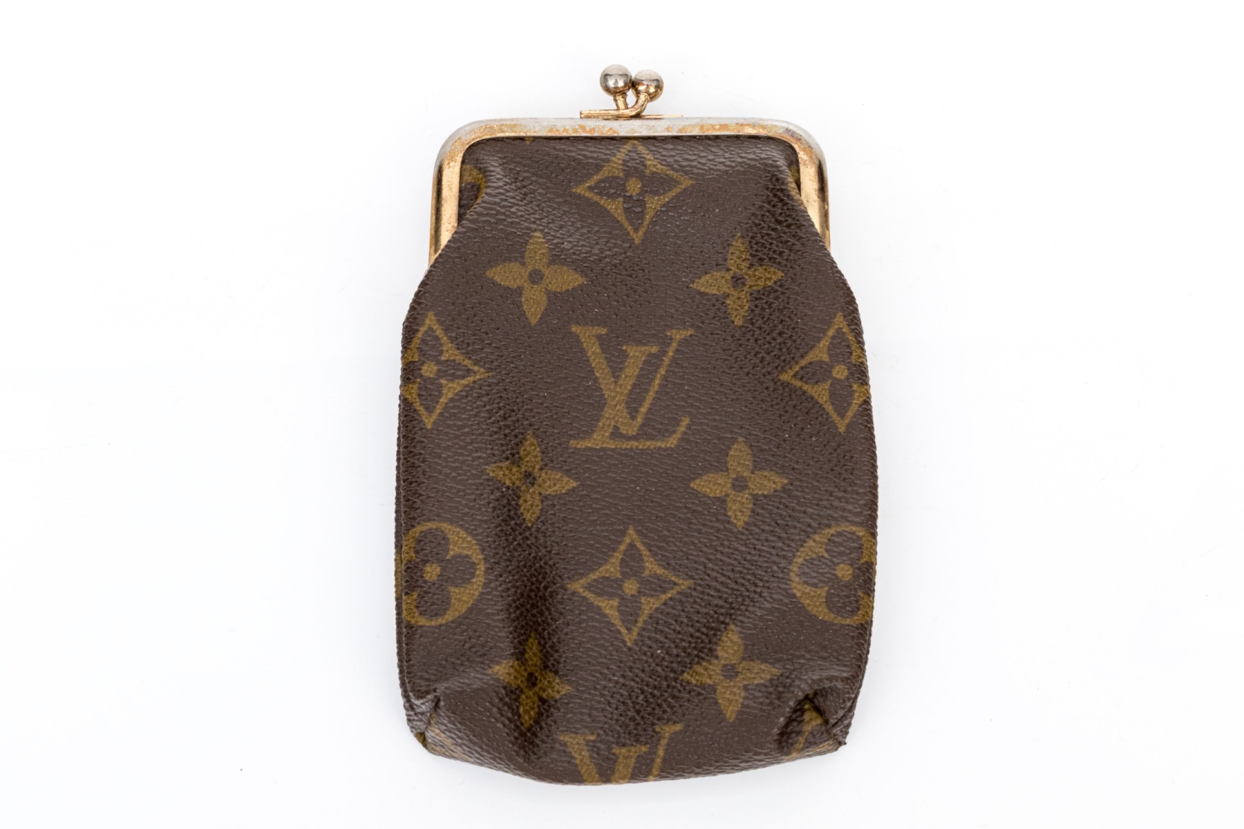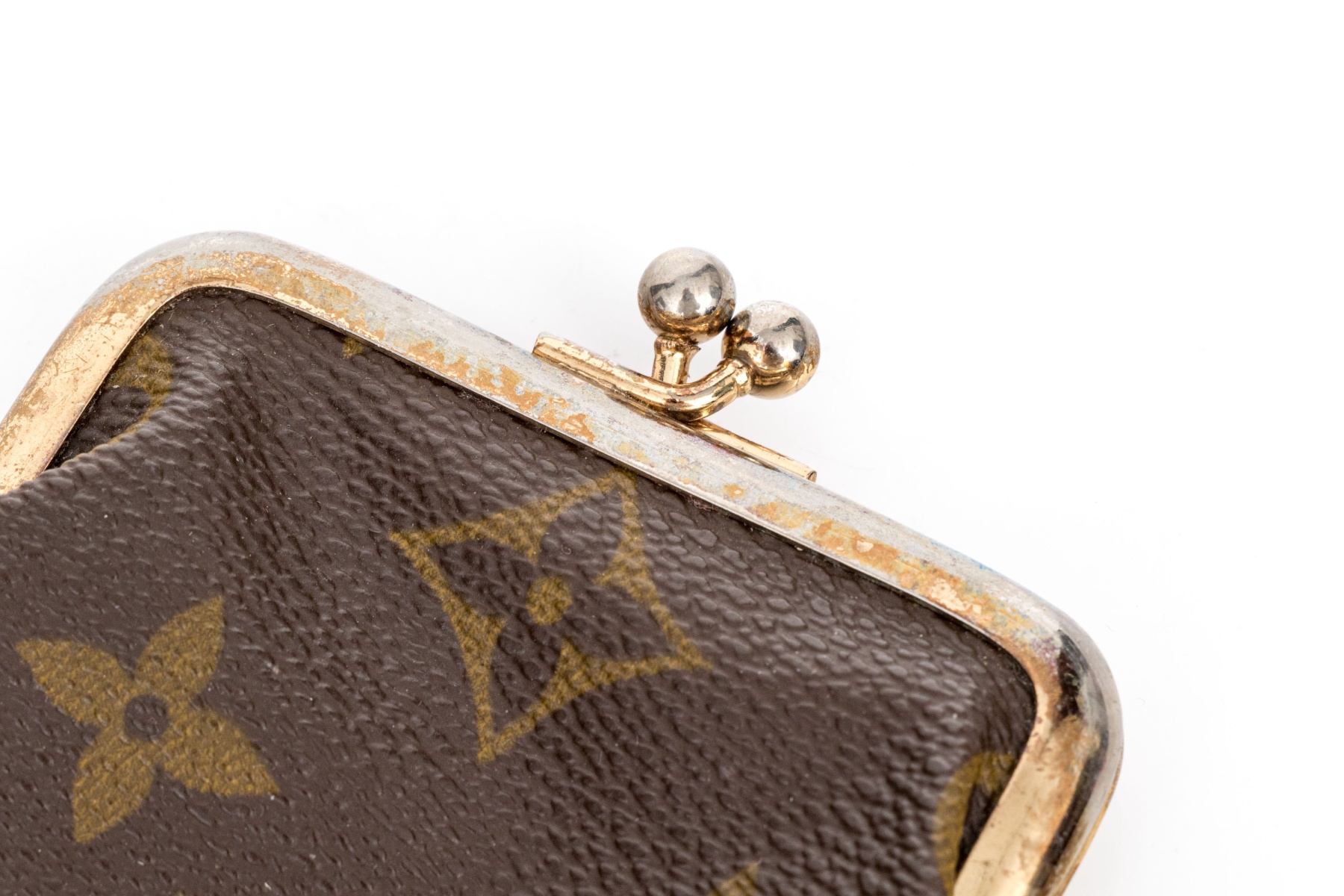 Louis Vuitton vintage unsigned coated canvas logo change purse, with classic Louis Vuitton logo patterning on a vintage kisslock frame